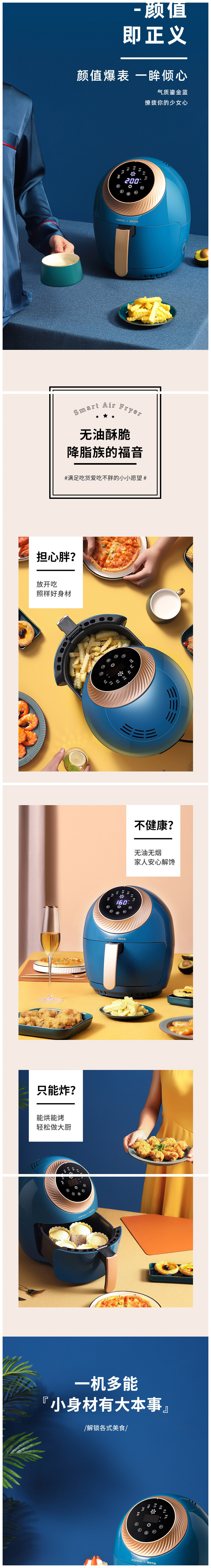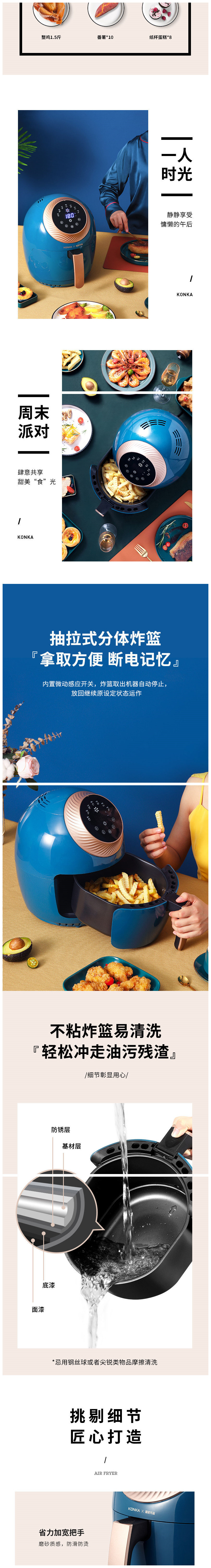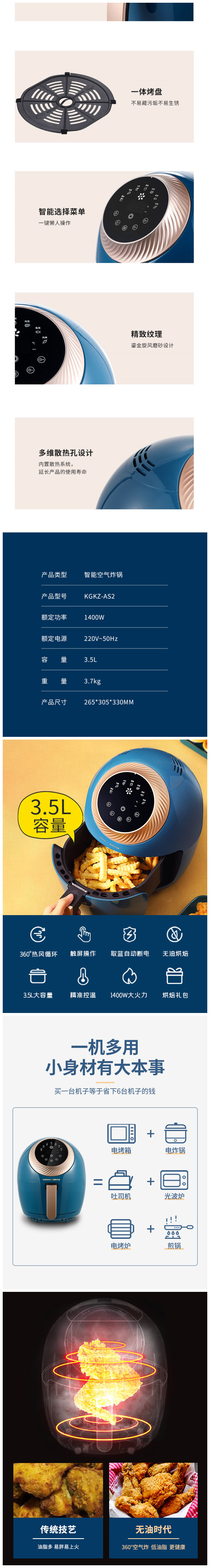 描述:控制方式:机械式,容量:3.5L,加热方式:电热管+热风对流,安全功能:过热保护,型号:KGKZ-AS2(WE)/KGKZ-AS2(WB),货号:KGKZ-AS2(WE)/KGKZ-AS2(WB),品牌:康佳,电源方式:交流电,额定电压:220V,额定功率:1400W,额定频率:50HZ,机身材质:塑料,电炸锅类型:空气炸锅,产品尺寸:315*315*360mm,功率:1400W,适用人数:4-5人,3C证书编号:2020010712320984,智能类型:不支持智能,颜色:蓝色,产品规格:欧规,英规,中规,主要下游平台:ebay,亚马逊,wish,速卖通,独立站,LAZADA,Shopee,主要销售地区:欧洲,东南亚,有可授权的自有品牌:是,是否跨境出口专供货源:是,是否专利货源:否,产品类别:电炸锅,