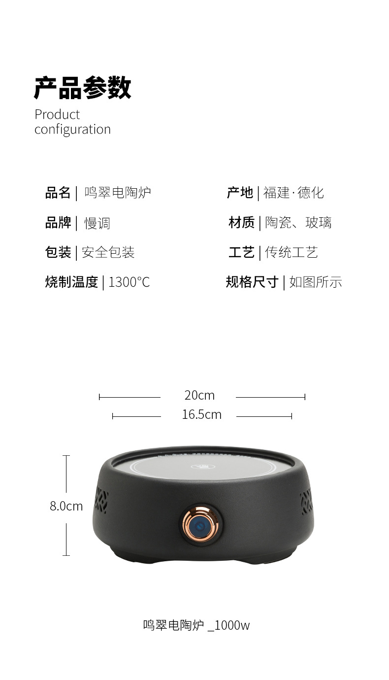 描述:颜色:电陶炉白,电陶炉黑,一念煮茶壶黑,宛山煮茶壶黑,冰晶煮茶壶,冰晶煮茶壶(竖纹),电陶炉白+宛山煮茶壶白,电陶炉白+冰晶煮茶壶,电陶炉黑+宛山煮茶壶黑,电陶炉黑+冰晶煮茶壶(竖纹),品牌:一品窑,包装:纸盒,加印LOGO:可以,是否支持订制:是,货号:ypy1021,加工定制:是,价格段:100-200元,是否有专利:否,是否配茶盘:否,装箱数:10,材质:陶瓷,陶瓷分类:45%以上骨粉骨瓷,带烧水功能:是,表面工艺:釉下彩,茶道配件:无,是否进口:否,产地:德化,产品上市时间:2021年秋,主要下游平台:亚马逊,速卖通,LAZADA,主要销售地区:欧洲,东南亚,北美,有可授权的自有品牌:是,产品质量等级:一等品,是否跨境出口专供货源:是,风格:轻奢,版权:无,