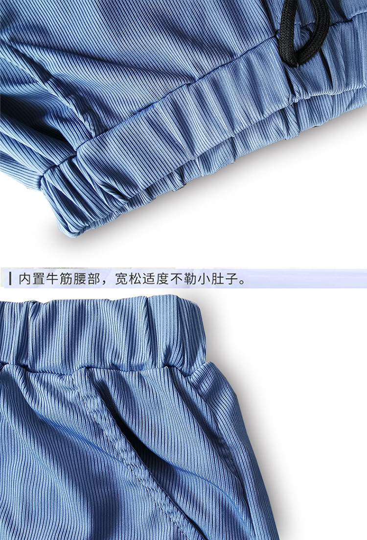 描述:风格:韩版,面料名称:棉麻,安全等级:B类,裤长:九分裤,主面料成分:聚酯纤维(涤纶),主面料成分含量:98,货号:KZ22抽绳织唛款,货源类别:现货,适用性别:男,产地:浙江,适合年龄段:中大童(8岁以上,140cm以上),适合季节:夏季,款式:休闲裤,是否开裆:否,面料工艺:柔软处理,图案:纯色,抽象,图片实拍:实拍有模特,是否库存:是,上市年份季节:2022年夏季,元素:运动,亲子,潮范,AQL抽检标准:1.0,平车针距12~14针/3cm:是,毛头/杂余线头是否修剪:明显部位已修剪,裤腰:中腰,裤门襟:皮筋腰带,颜色:抽绳织唛款(蓝色),抽绳织唛款(灰色),贴标织带款(白色),贴标织带款(灰色),冰丝珠条款(蓝色),冰丝珠条款(灰色),适合身高:120cm,130cm,140cm,150cm,160cm,170cm,