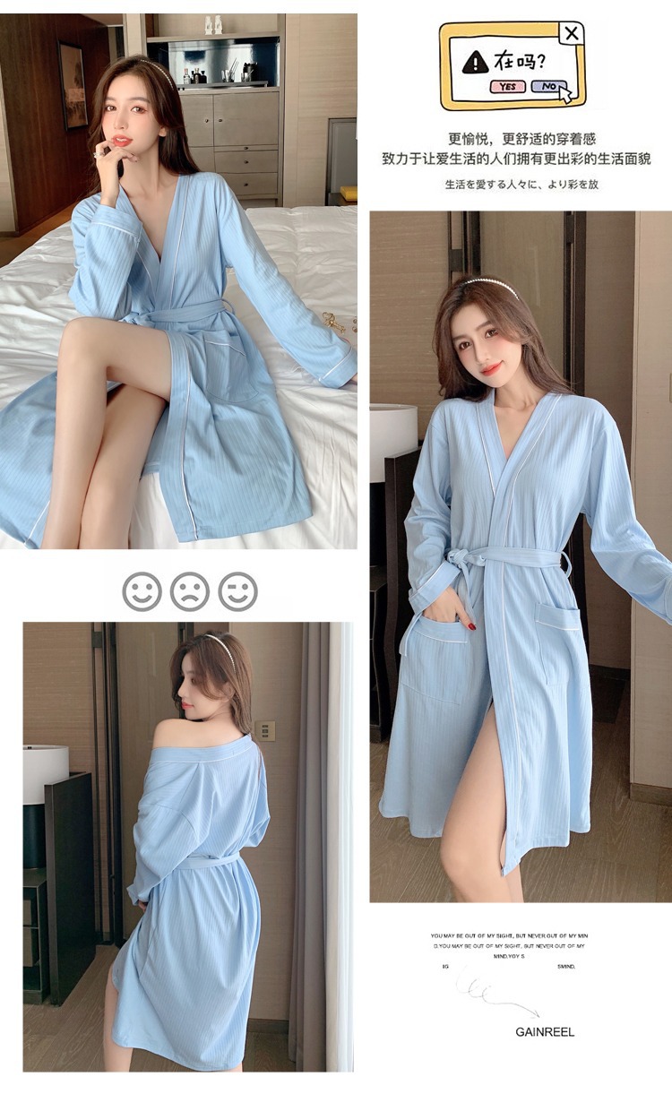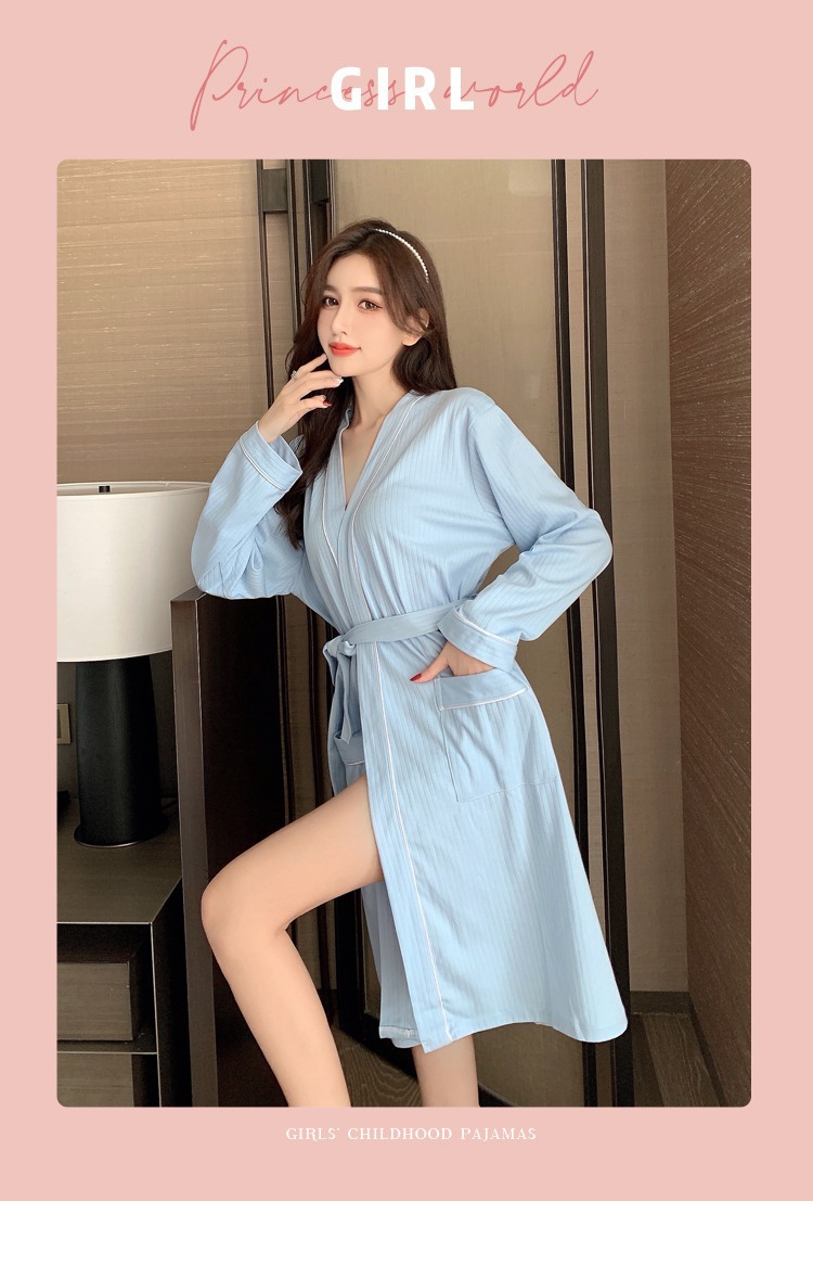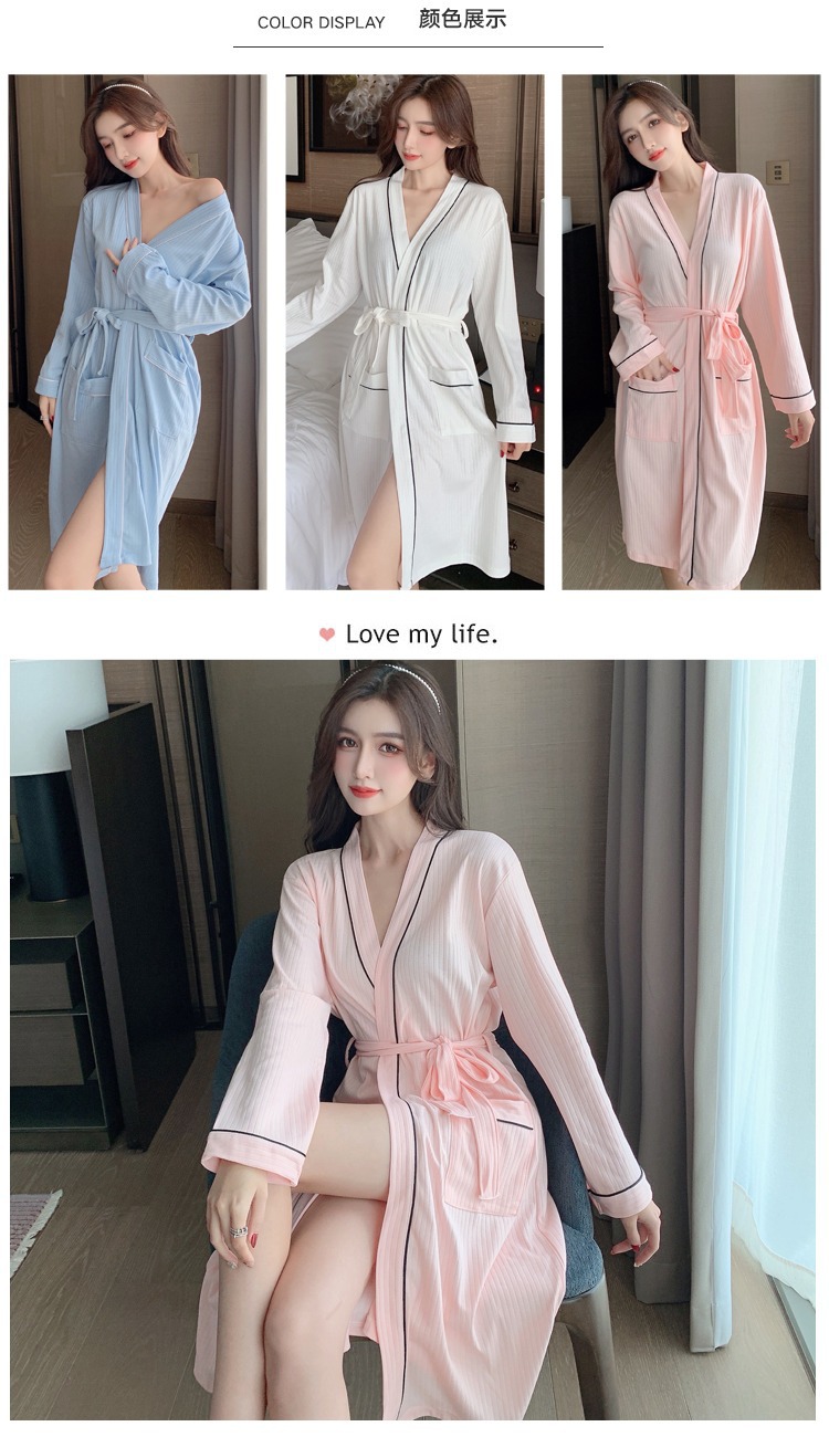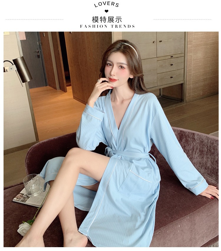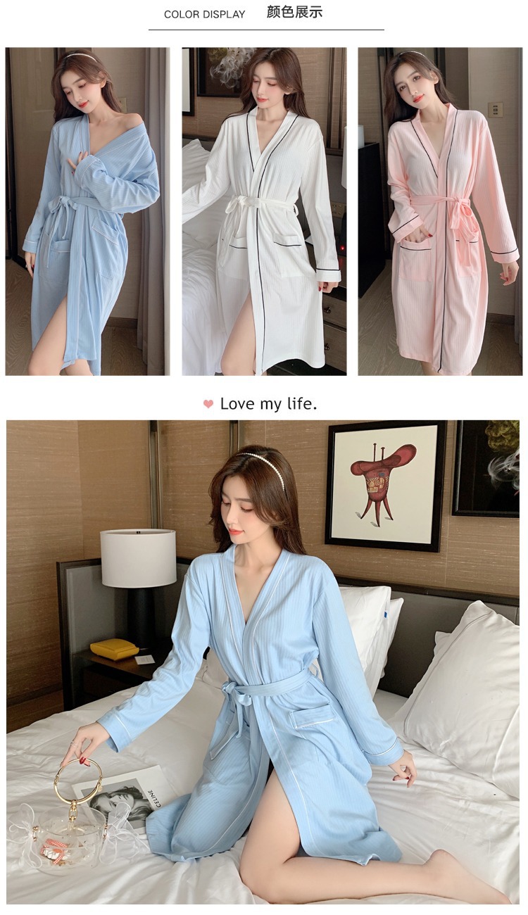 标题:纯棉浴袍睡衣女春秋季韩版简约甜美性感长袖中长款睡袍睡裙家居服