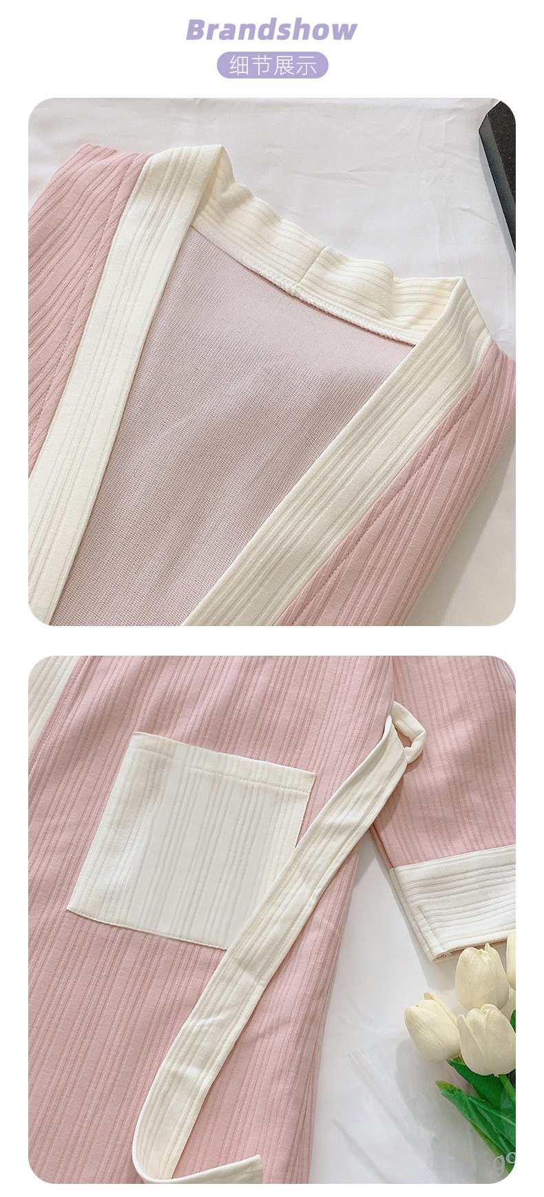 描述:产品类别:睡袍,面料名称:全棉,风格:经典传统,主面料成分:棉,主面料成分的含量:95,厚薄:薄款,面料厚薄(克重):适中(141-160克/平米),织法:提花,袖长:长袖,功能:可外穿,上市时间:2022年秋季,适合季节:四季通用,适用性别:女,适用年龄段:青年(18-40周岁),适用人群类别:女士,适用场景:居家,颜色:449-9255粉色,449-9255米白,449-9255蓝色,尺码:M,L,XL,XXL,货源类别:现货,是否支持贴牌:不支持,是否支持代工:不支持,产地:揭阳,货号:449,是否库存:否,是否进口:否,面料支数:100支,