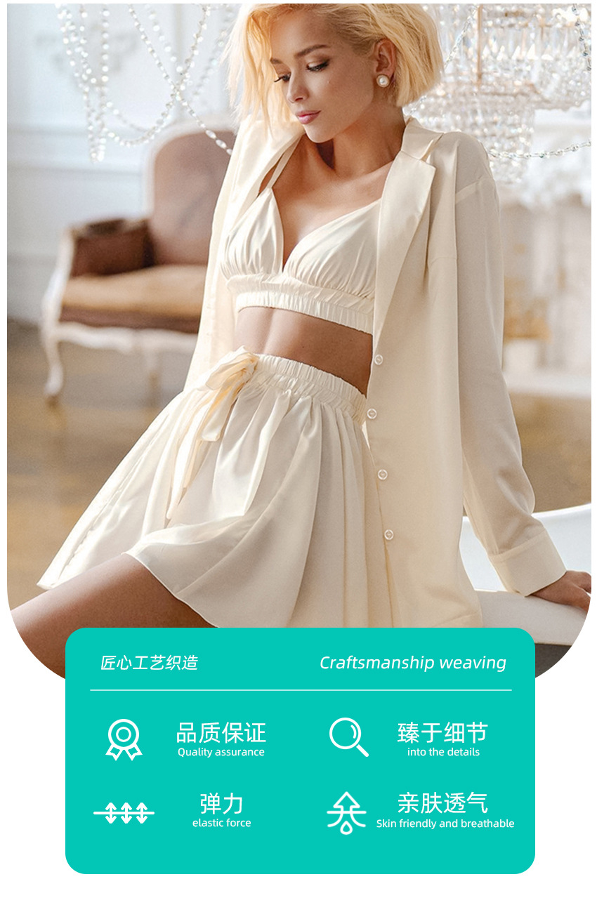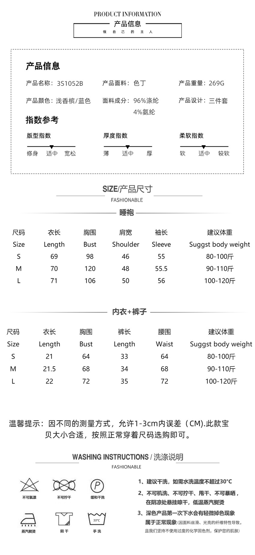 标题:2022夏季欧美性感睡衣三件套丝绸长袖浴袍跨境色丁内衣女士家居服