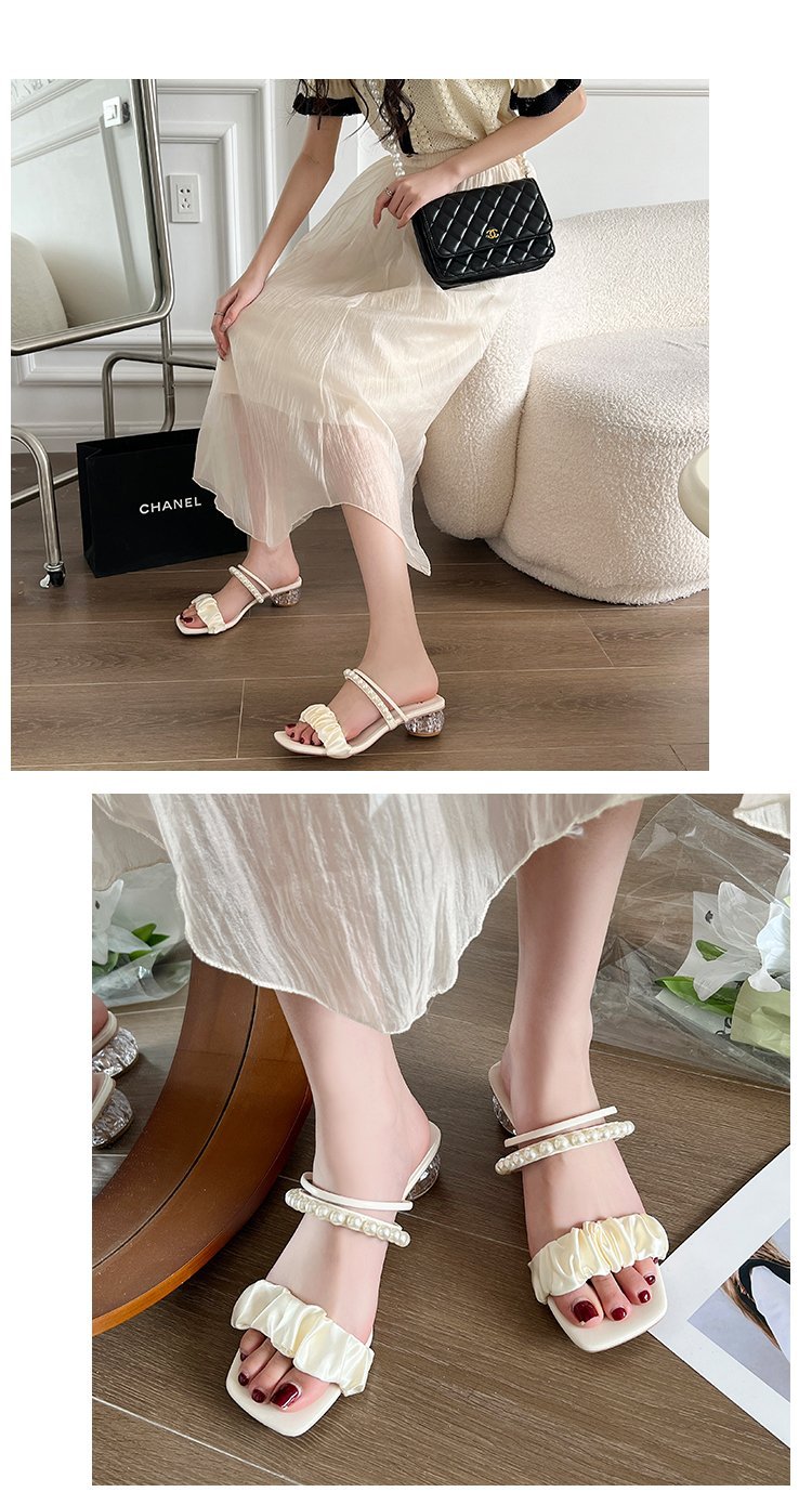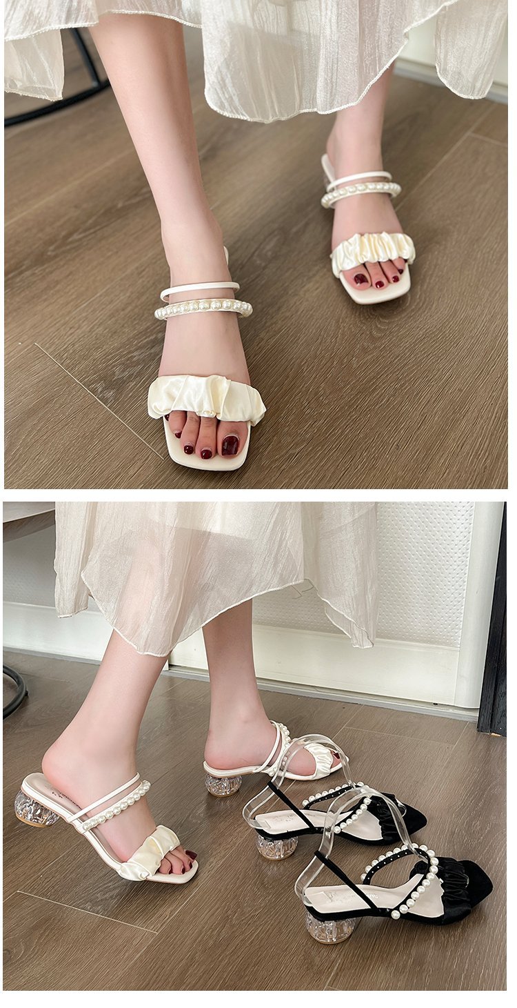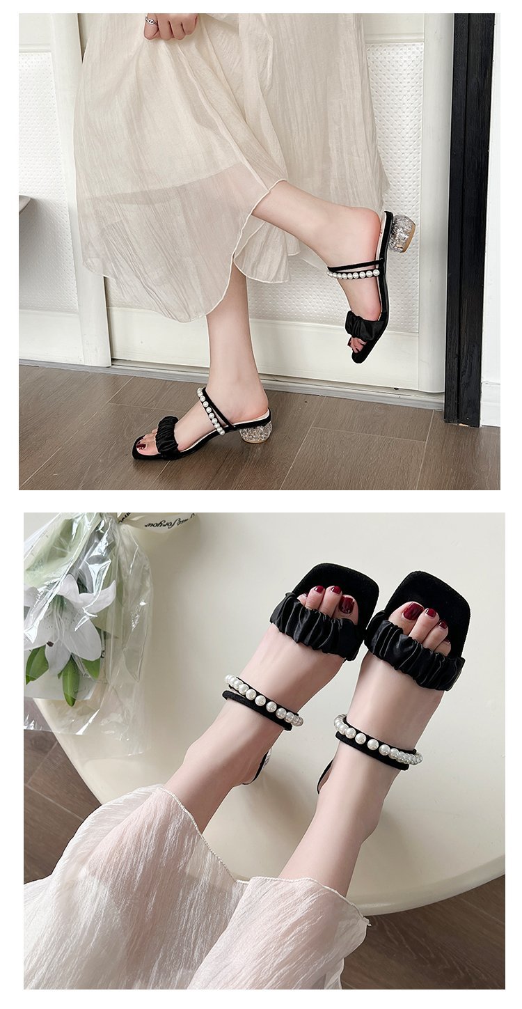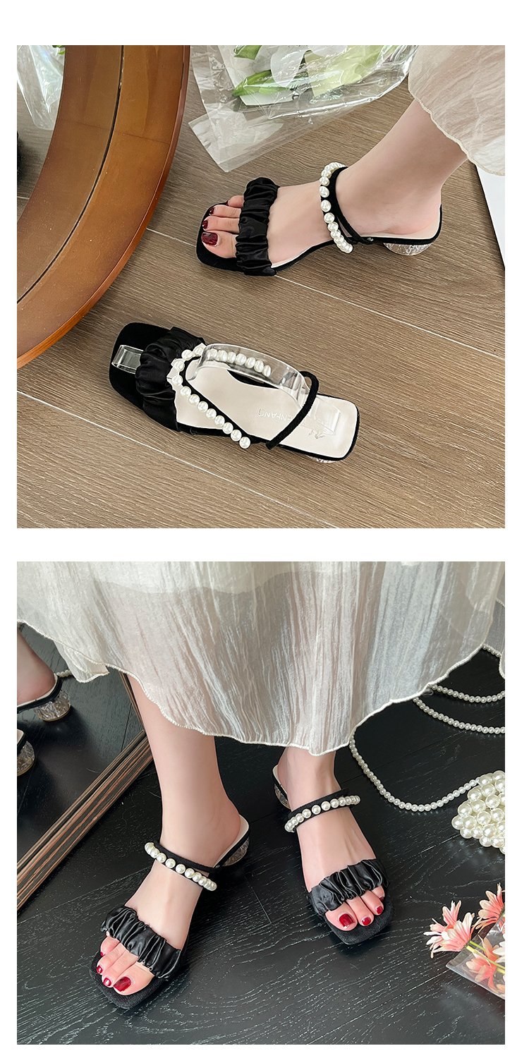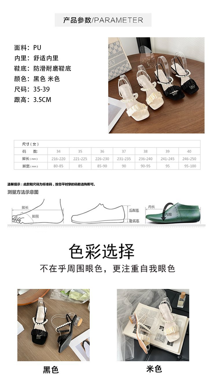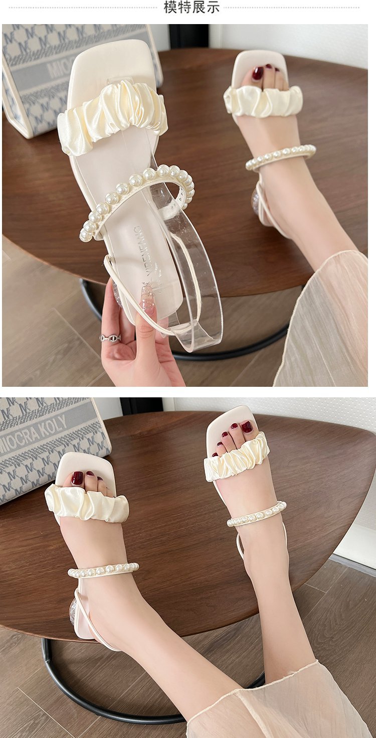 标题:粗跟凉鞋女2022夏外贸大码中跟仙女风褶皱两穿一字带珍珠方头凉拖