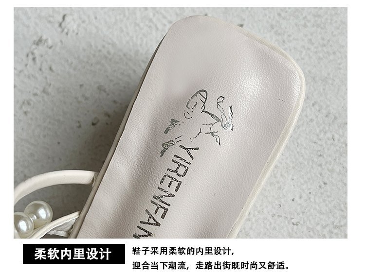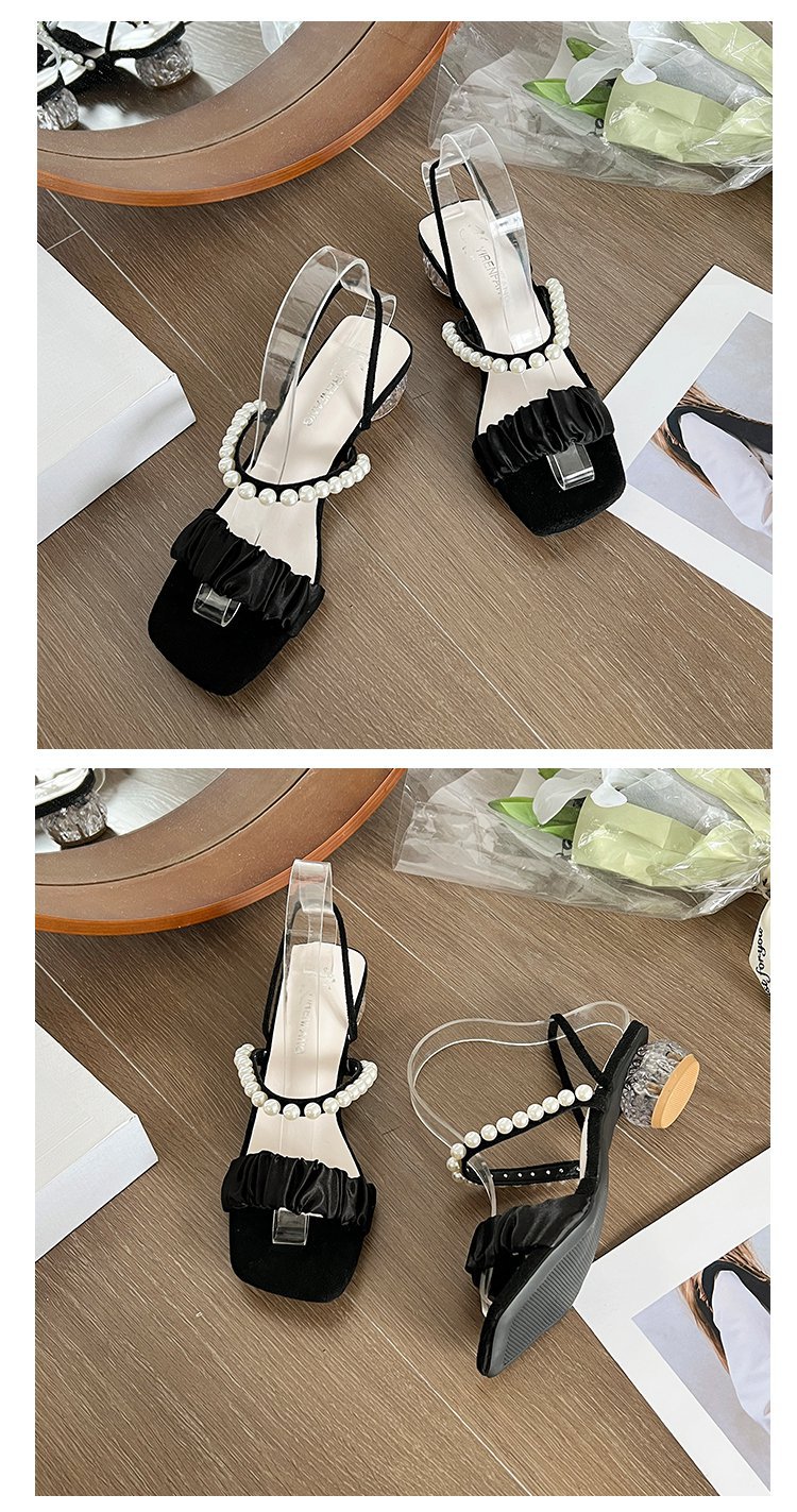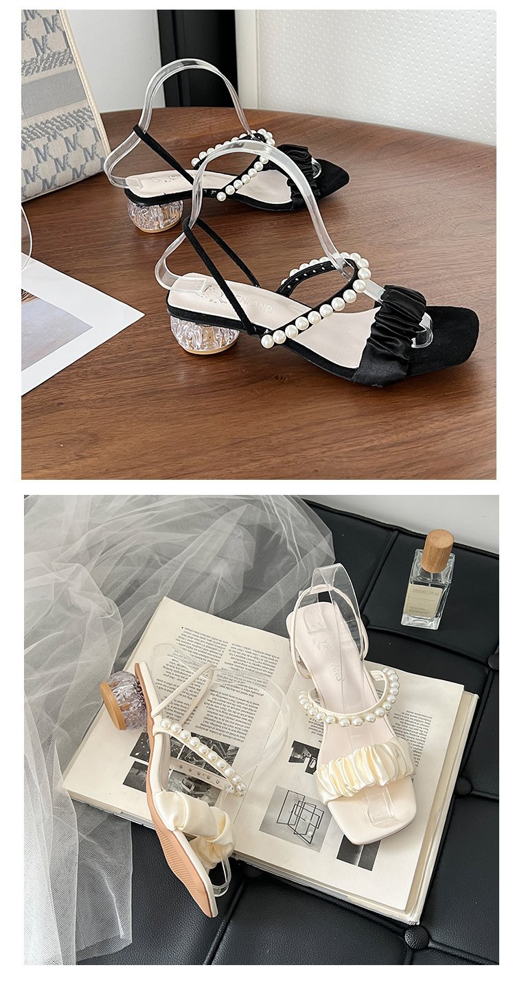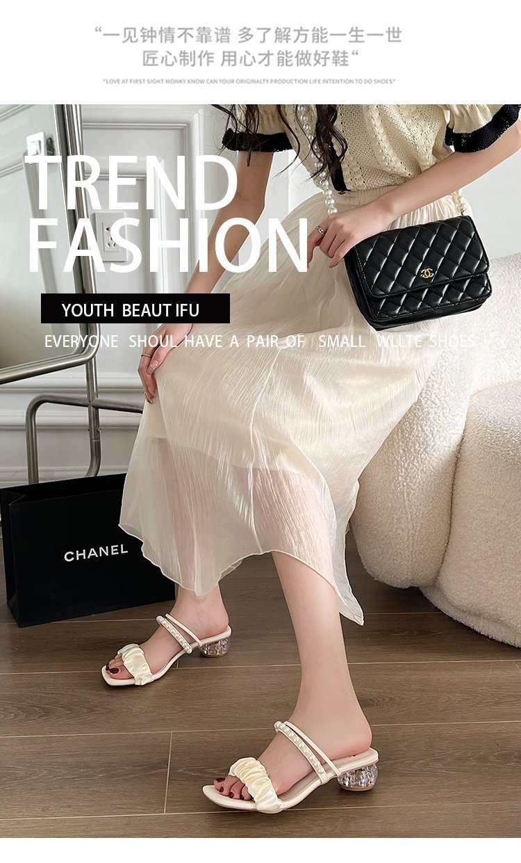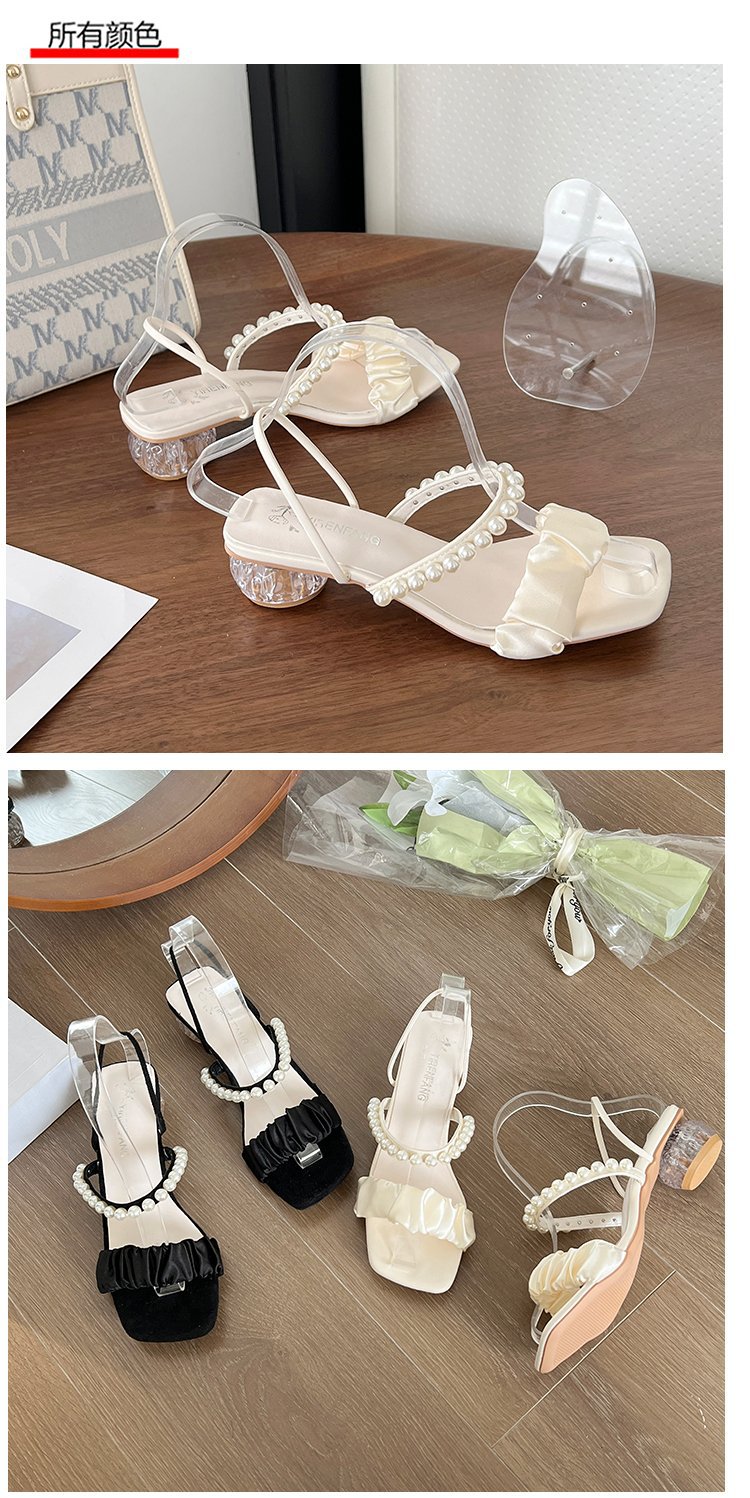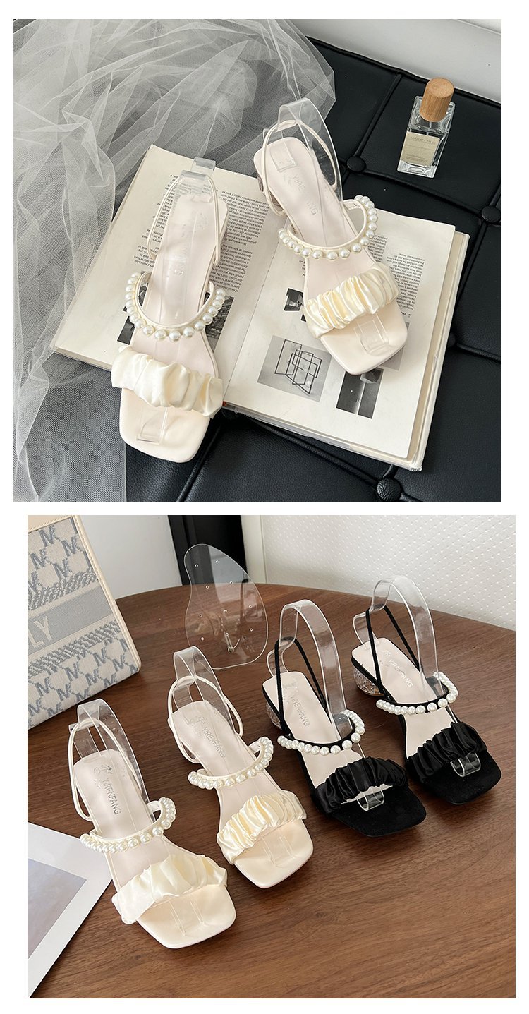 标题:粗跟凉鞋女2022夏外贸大码中跟仙女风褶皱两穿一字带珍珠方头凉拖