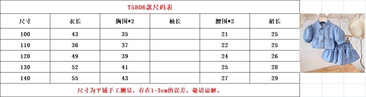 描述:货号:茨T5806,货源类别:现货,适用性别:女,风格:韩版,套装类型:裙套装,套装件数:两件套,礼盒内容:服装,产地:浙江,适合年龄段:中小童(3~8岁,100~140cm),适合季节:夏季,袖长:短袖,是否连帽:不连帽,面料工艺:柔软处理,酵素洗,厚薄:普通,图案:纯色,图片实拍:实拍无模特,是否库存:否,上市年份季节:2021年夏季,元素:套装,可爱,公主,潮范,AQL抽检标准:无,平车针距12~14针/3cm:是,毛头/杂余线头是否修剪:明显部位已修剪,面料名称:牛仔,主面料成分:棉,主面料成分含量:70,安全等级:B类,闭合款式:单排扣,颜色:浅蓝色,适合身高:100cm,110cm,120cm,130cm,140cm,100cm-140cm/1手5件,主要下游平台:ebay,亚马逊,wish,速卖通,独立站,LAZADA,主要销售地区:欧洲,南美,东南亚,北美,中东,有可授权的自有品牌:是,是否跨境出口专供货源:是,