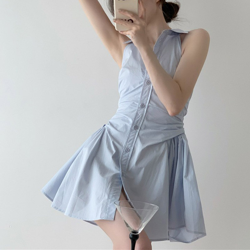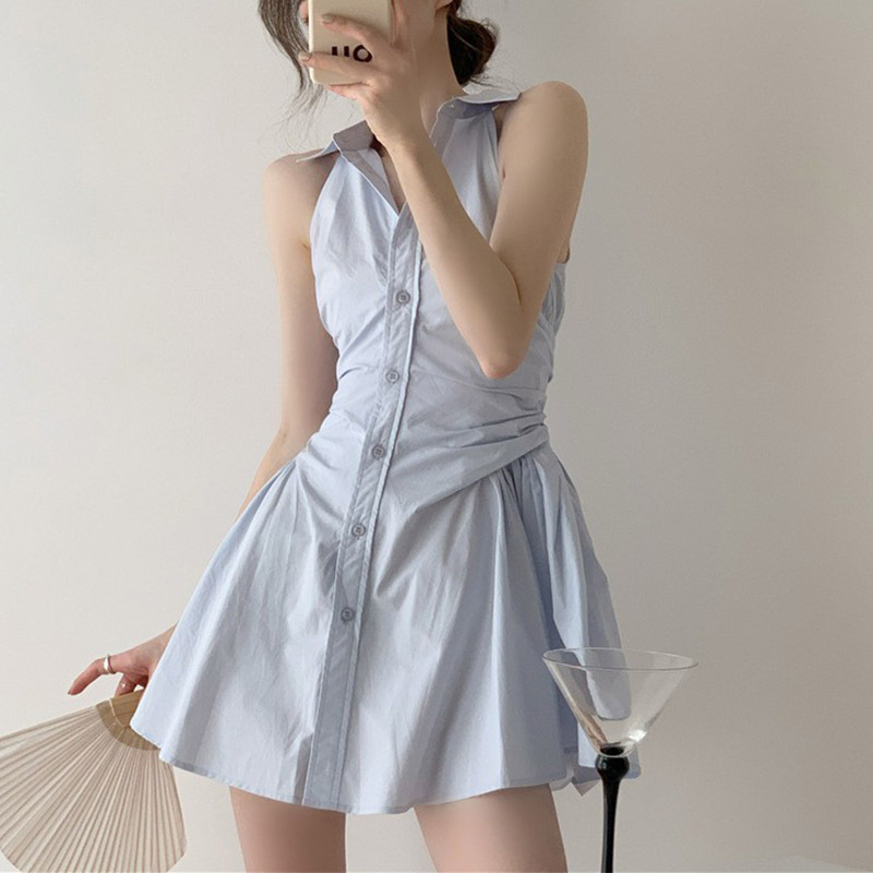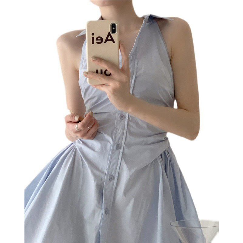 标题:純欲風デザイン感ウエストシャツスカート女性2022新型襟開きプリーツワンピーススカートブルー夏傘スカート