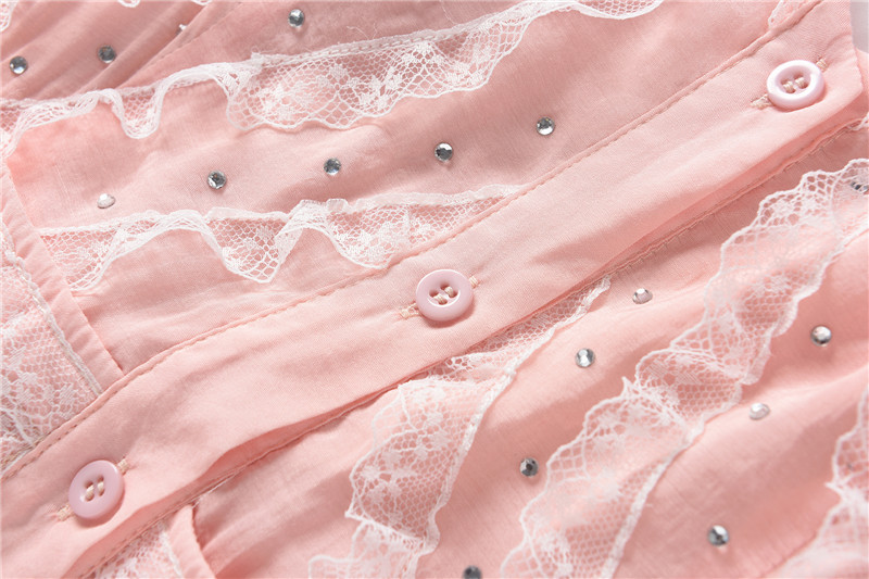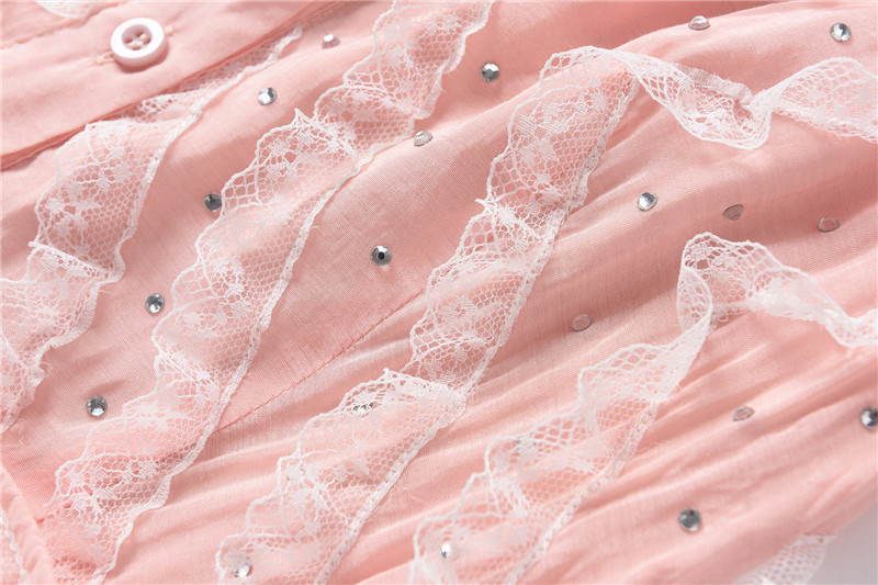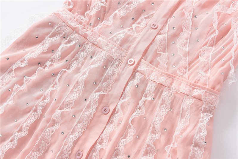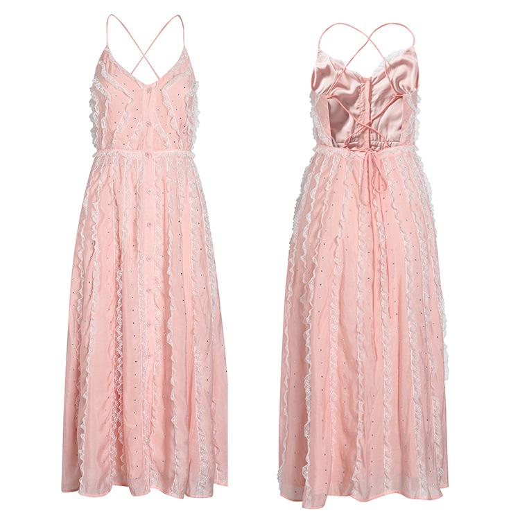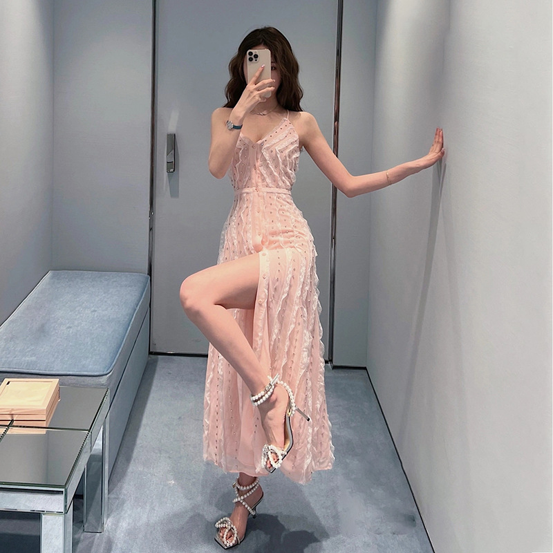 标题:法式纯欲风粉色显瘦中长款开叉长裙女重工水钻蕾丝吊带连衣裙夏季