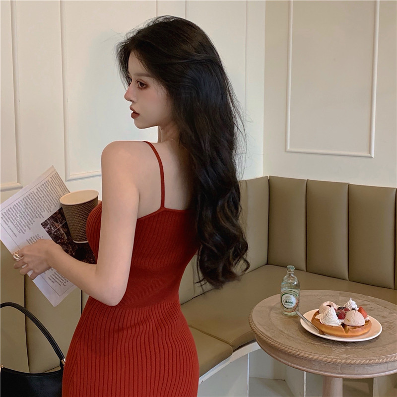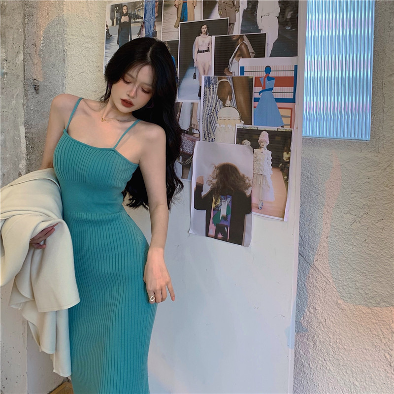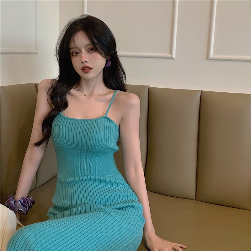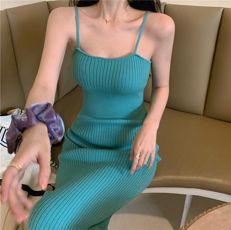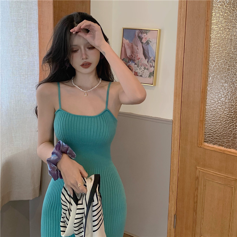 标题:セクシー2022夏新型純欲風キャミソールワンピース女性グリーンミディアムニットバッグヒップ毛糸スカート