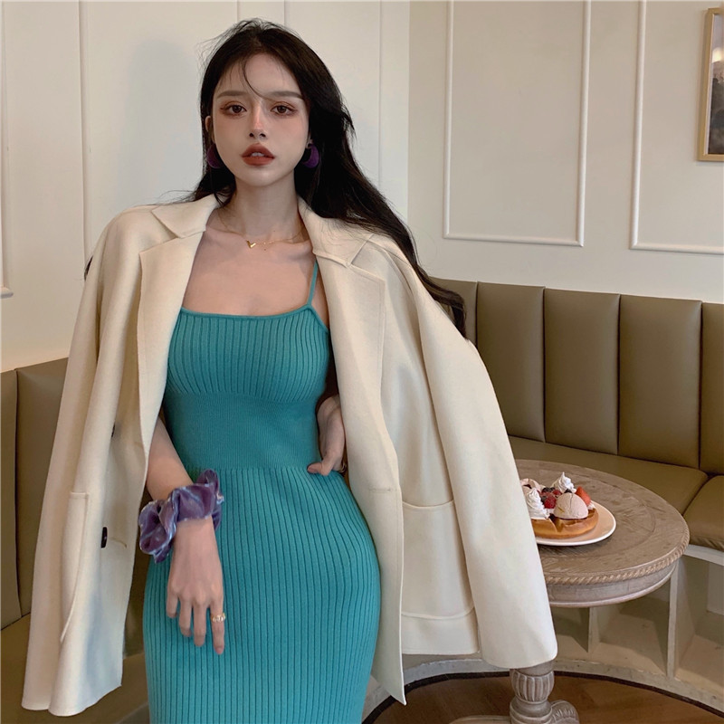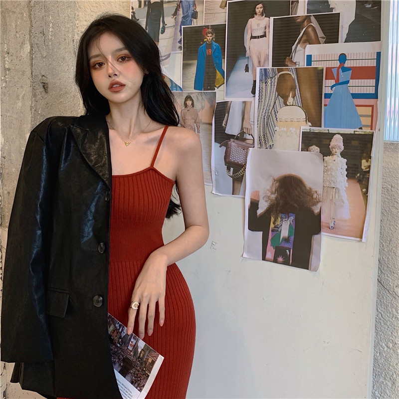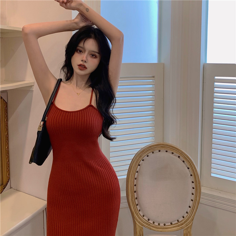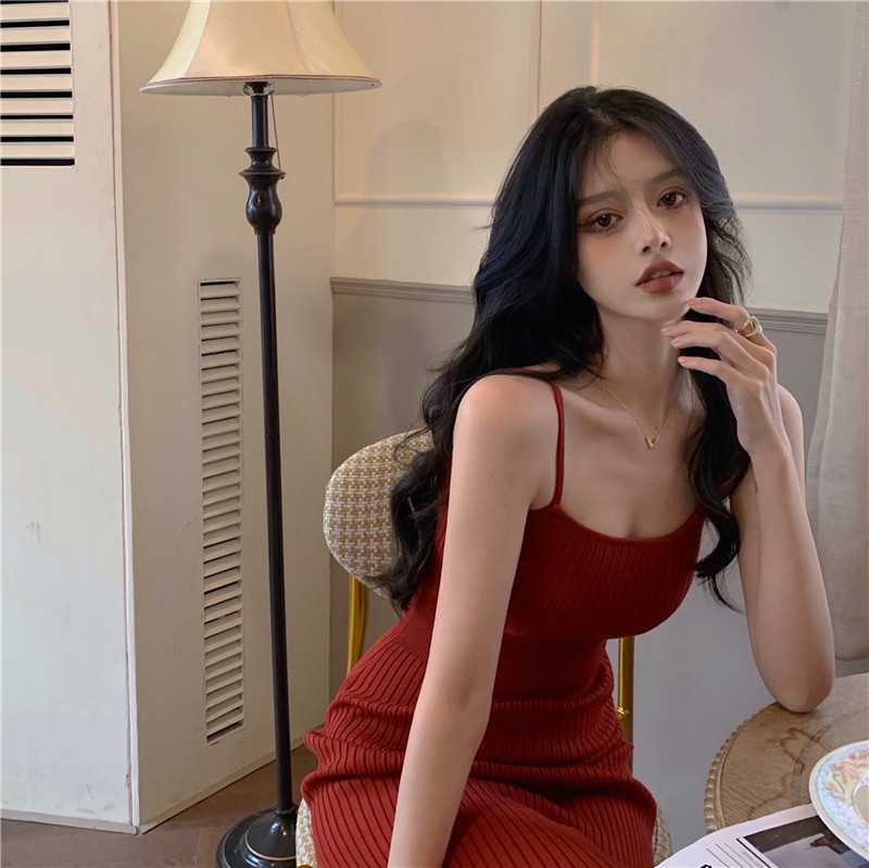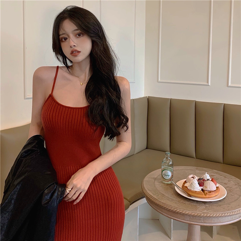 标题:セクシー2022夏新型純欲風キャミソールワンピース女性グリーンミディアムニットバッグヒップ毛糸スカート