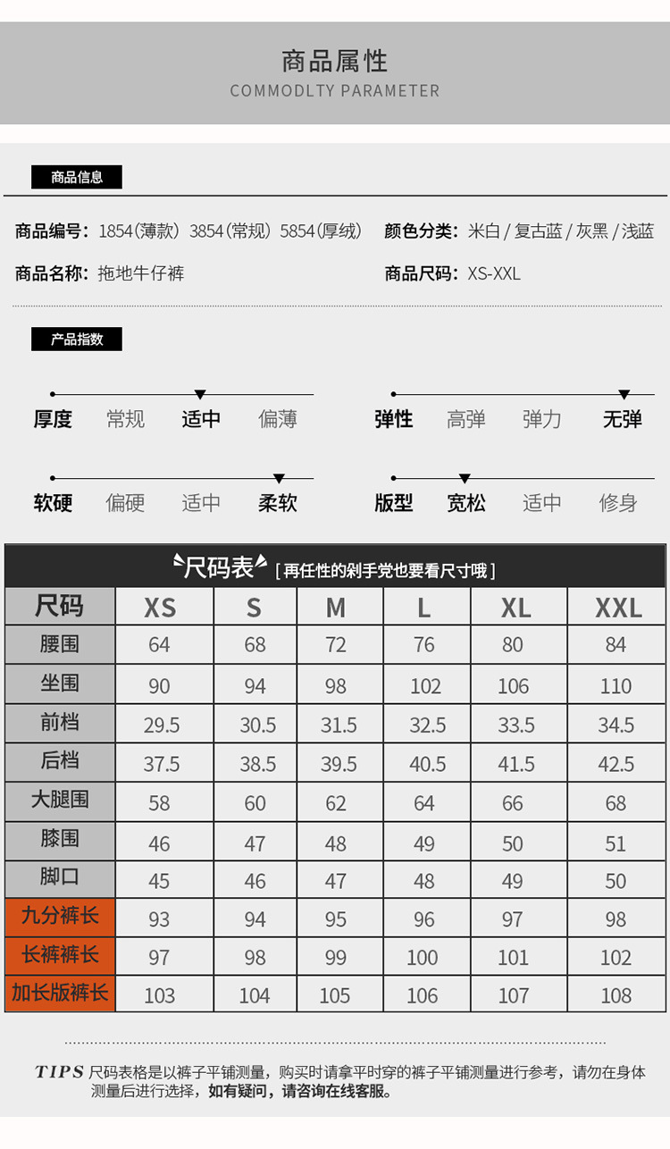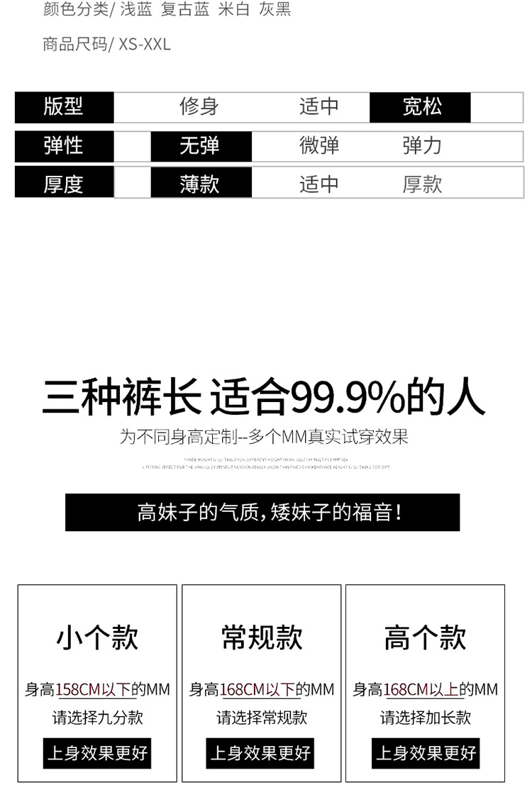 属性:浅蓝九分,浅蓝长裤,浅蓝加长,复古蓝九分,复古蓝长裤,复古蓝加长,米白九分,米白长裤,米白加长,灰黑九分,灰黑长裤,灰黑加长