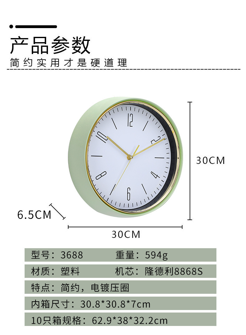 描述:产品类别:闹钟,品牌:MOVEBEST,是否进口:否,型号:YZ3688,是否专利货源:否,加工定制:是,加印LOGO:可以,是否双面:单面,风格:北欧,外观造型:圆形,显示类型:指针,特殊功能:装饰,防水:不可以,动力类型:电池,机芯种类:扫秒机芯,机芯产地:中国,机芯品牌:LONGDELI,机芯型号:8868S,尺寸:12英寸_橄榄绿,12英寸_奶油黄,厚度:15mm以上,外壳材质:金属,镜面材质:矿物强化玻璃镜面,表盘材质:纸覆膜,产地(国内):福建省,箱装数量:10,货号:YZ3688,是否跨境出口专供货源:否,空间:客厅,卧室,书房,餐厅,浴室,玄关,商用场所,是否有版权或专利:否,