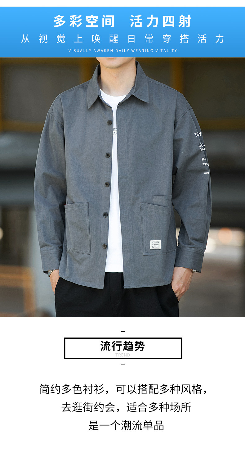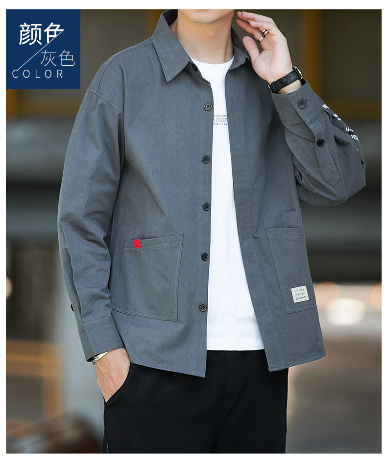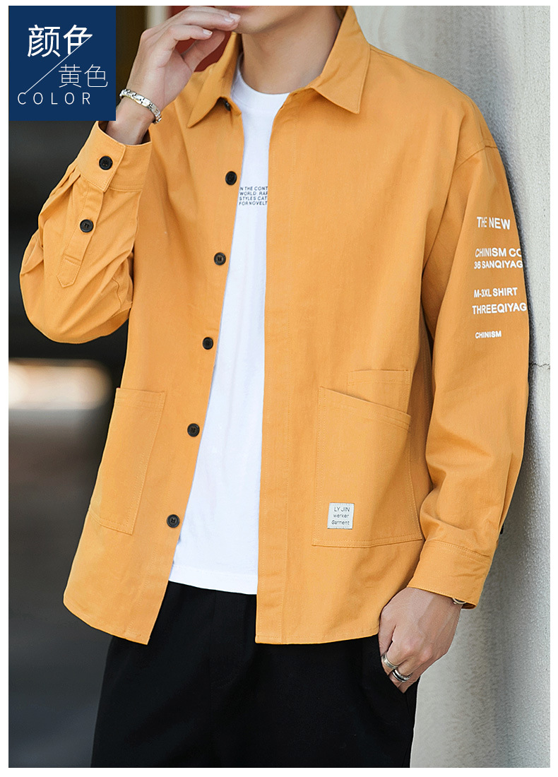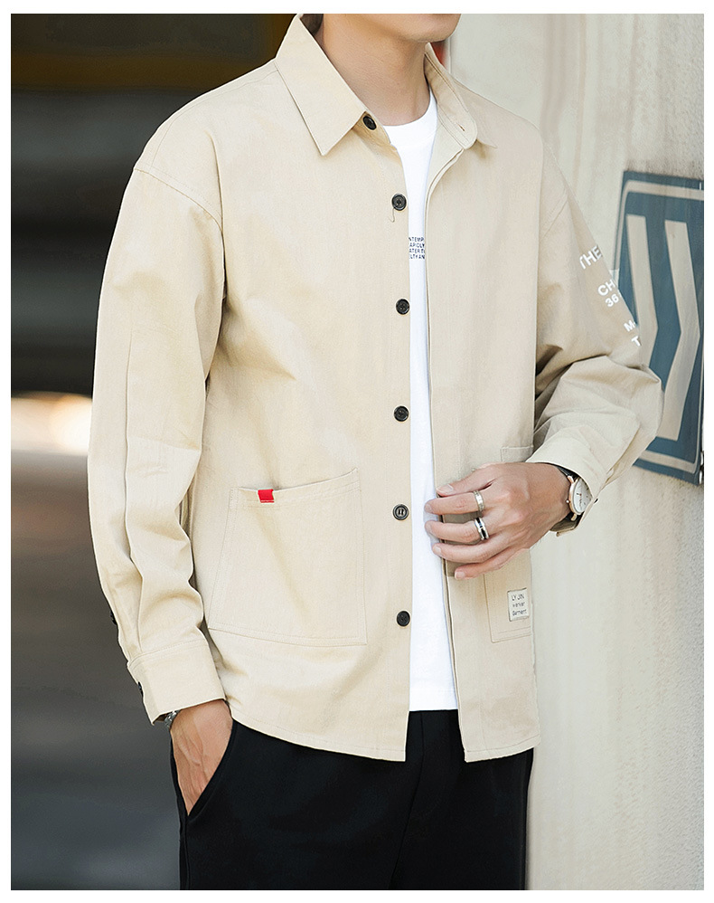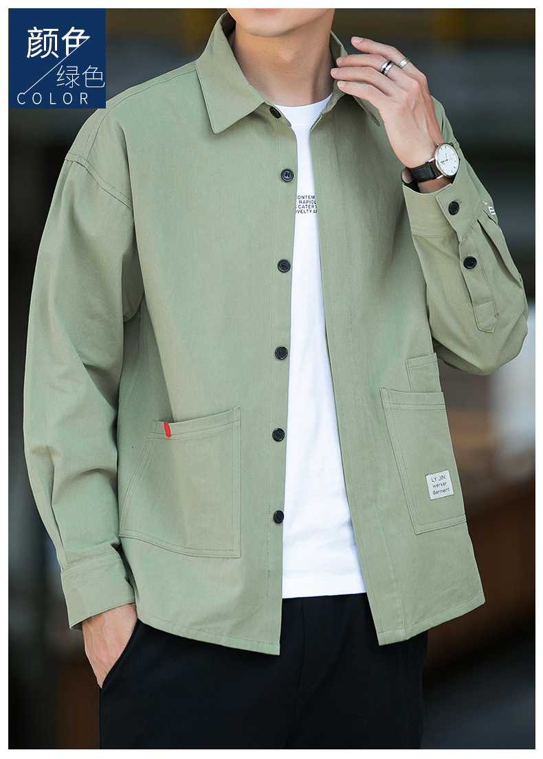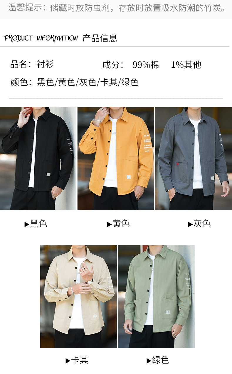 描述:货源类别:现货,品牌:承友,货号:A403,风格:韩版,淘货类别:青春流行(18-24岁),款式:开衫,版型:宽松型,领型:翻领,袖长:长袖,图案:纯色,厚薄:薄款,误差范围:1-3CM,是否库存:是,库存类型:整单,款式细节:口袋装饰,适合人群:青年,上市年份/季节:2022年秋季,面料名称:棉,主面料成分:棉,主面料成分的含量:99,面料:棉,适用场景:日常,适合季节:秋季,工艺:免烫处理,颜色:8823黑色,8823灰色,8823卡其,8823黄色,8823豆绿,尺码:M,L,XL,2XL,3XL,主要下游平台:ebay,亚马逊,wish,速卖通,独立站,LAZADA,主要销售地区:非洲,欧洲,南美,东南亚,北美,东北亚,中东,有可授权的自有品牌:是,是否跨境出口专供货源:是,原创设计货源:否,有无质检报告:否,质检报告编号:1212,