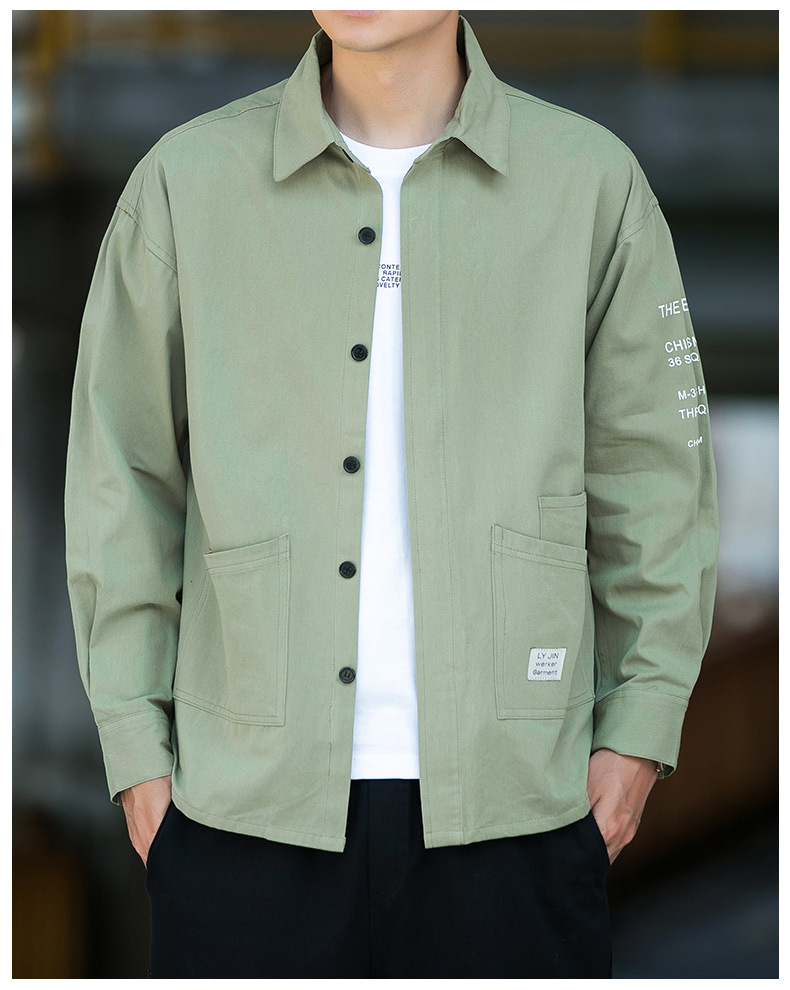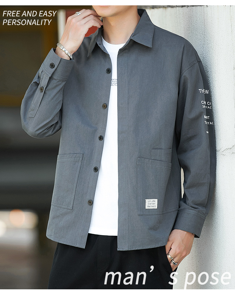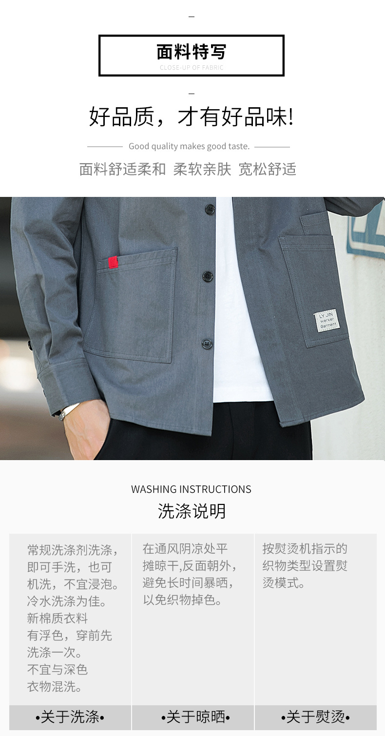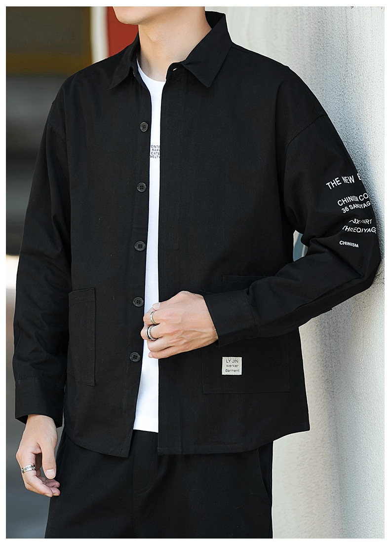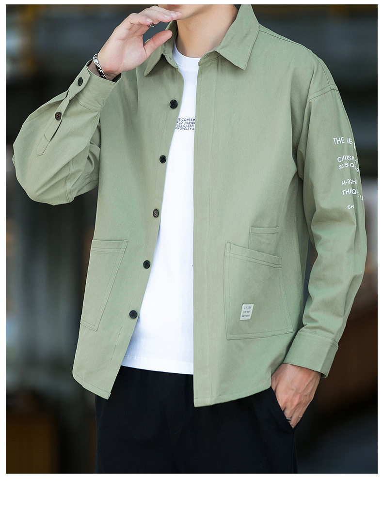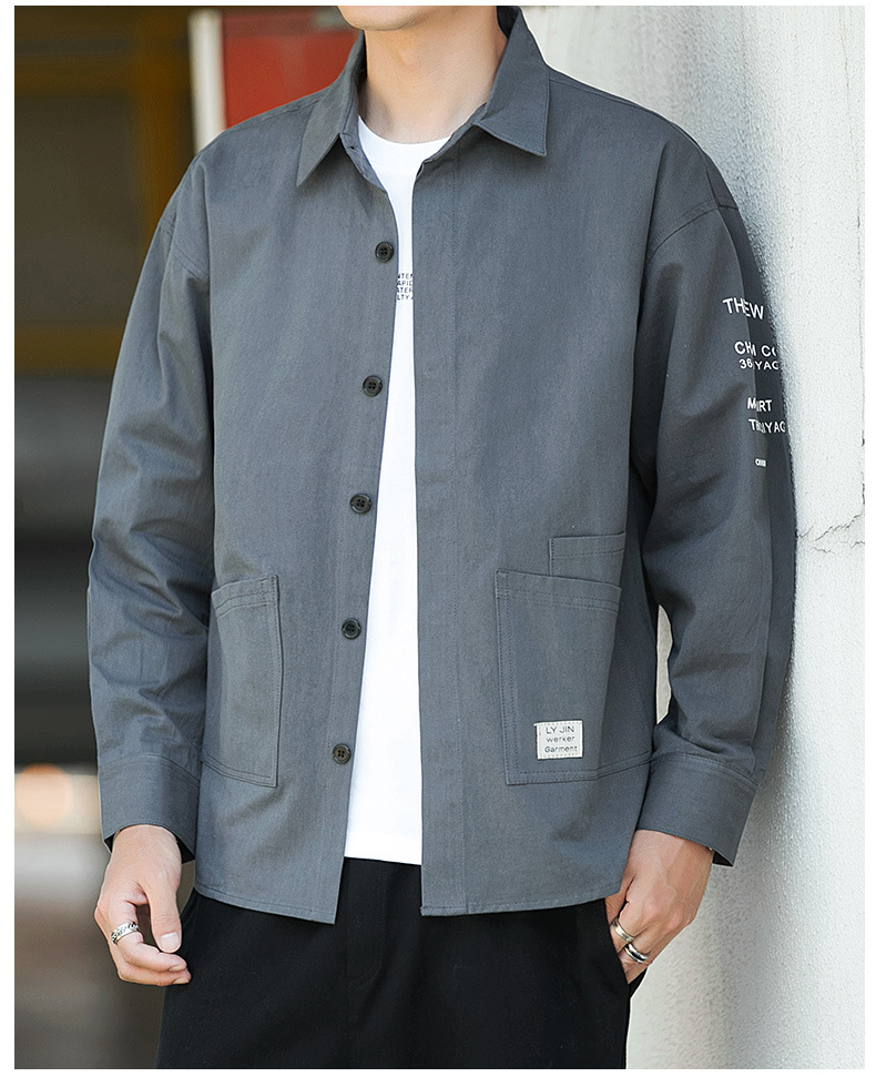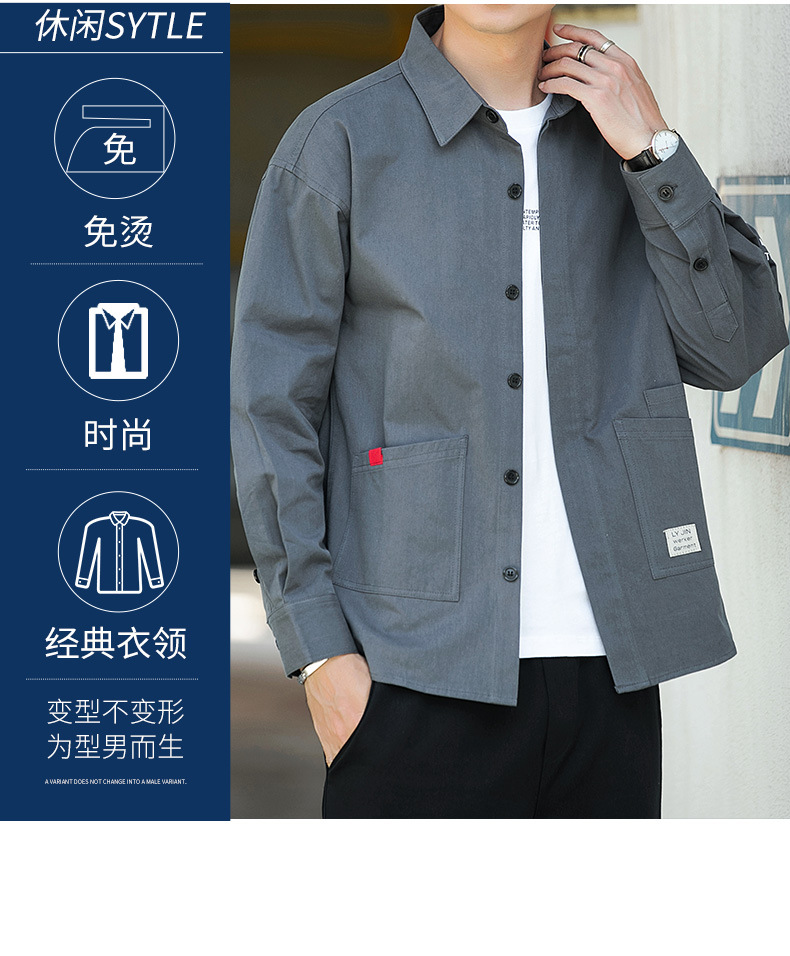 描述:货源类别:现货,品牌:承友,货号:A403,风格:韩版,淘货类别:青春流行(18-24岁),款式:开衫,版型:宽松型,领型:翻领,袖长:长袖,图案:纯色,厚薄:薄款,误差范围:1-3CM,是否库存:是,库存类型:整单,款式细节:口袋装饰,适合人群:青年,上市年份/季节:2022年秋季,面料名称:棉,主面料成分:棉,主面料成分的含量:99,面料:棉,适用场景:日常,适合季节:秋季,工艺:免烫处理,颜色:8823黑色,8823灰色,8823卡其,8823黄色,8823豆绿,尺码:M,L,XL,2XL,3XL,主要下游平台:ebay,亚马逊,wish,速卖通,独立站,LAZADA,主要销售地区:非洲,欧洲,南美,东南亚,北美,东北亚,中东,有可授权的自有品牌:是,是否跨境出口专供货源:是,原创设计货源:否,有无质检报告:否,质检报告编号:1212,
