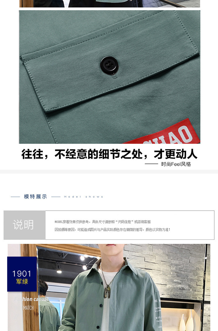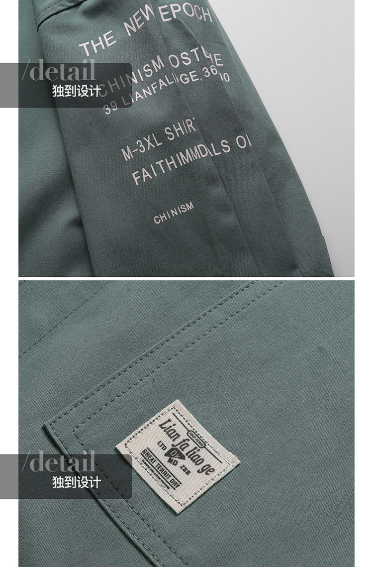 描述:货源类别:现货,品牌:汇灵杰顿,货号:FY1901,风格:韩版,淘货类别:青春流行(18-24岁),款式:开衫,版型:宽松型,领型:翻领,袖长:短袖,图案:纯色,厚薄:薄款,误差范围:1-3cm,是否库存:是,库存类型:整单,款式细节:印花,适合人群:青少年,上市年份/季节:2022年夏季,面料名称:棉,主面料成分:棉,主面料成分的含量:100,面料:纯棉,适用场景:日常,适合季节:夏季,工艺:免烫处理,颜色:土黄色,豆绿色,军绿色,尺码:M,L,XL,XXL,XXXL,主要下游平台:ebay,亚马逊,wish,速卖通,独立站,LAZADA,主要销售地区:非洲,欧洲,南美,东南亚,北美,东北亚,中东,有可授权的自有品牌:是,是否跨境出口专供货源:是,原创设计货源:否,有无质检报告:是,