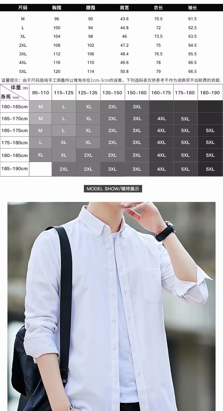 描述:货源类别:现货,品牌:其它/other,货号:诺世-961牛津纺,风格:韩版,淘货类别:青春流行(18-35岁),款式:开衫,版型:修身型,领型:翻领,袖长:长袖,图案:纯色,厚薄:普通,误差范围:1-3CM,是否库存:是,库存类型:整单,款式细节:辑明线,适合人群:青年,上市年份/季节:2021年秋季,面料名称:牛津布,主面料成分:聚酯纤维(涤纶),主面料成分的含量:75,面料:牛津纺,适用场景:休闲,适合季节:春秋季,工艺:免烫处理,颜色:白色,黑色,藏蓝色,灰色,天蓝色,尺码:S,M,L,XL,2XL,3XL,4XL,5XL,主要下游平台:ebay,亚马逊,wish,速卖通,独立站,LAZADA,跨境外贸,主要销售地区:非洲,欧洲,南美,东南亚,北美,东北亚,中东,其他,是否跨境出口专供货源:是,原创设计货源:否,有无质检报告:否,