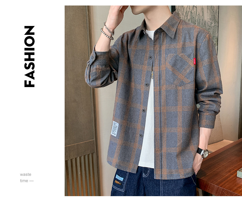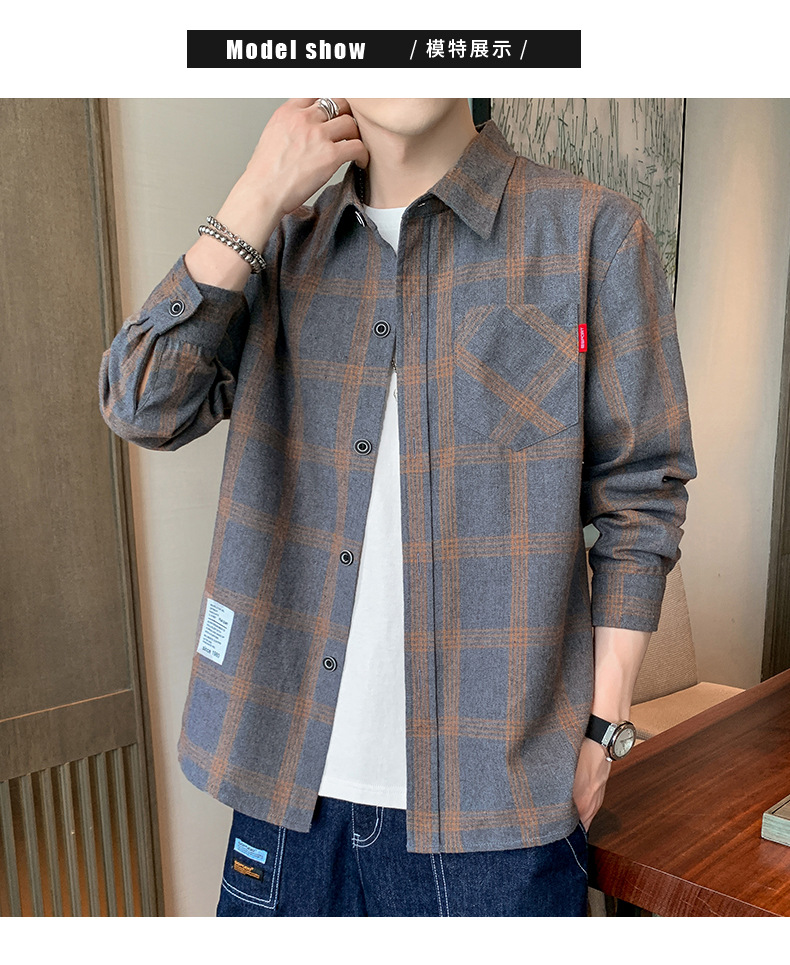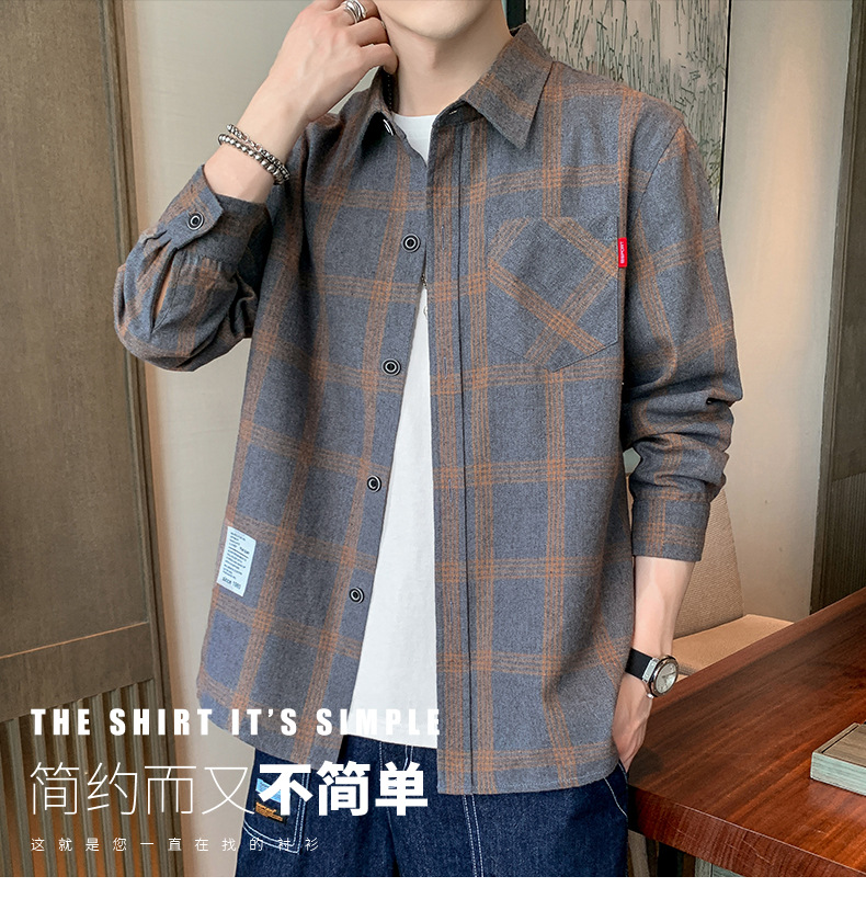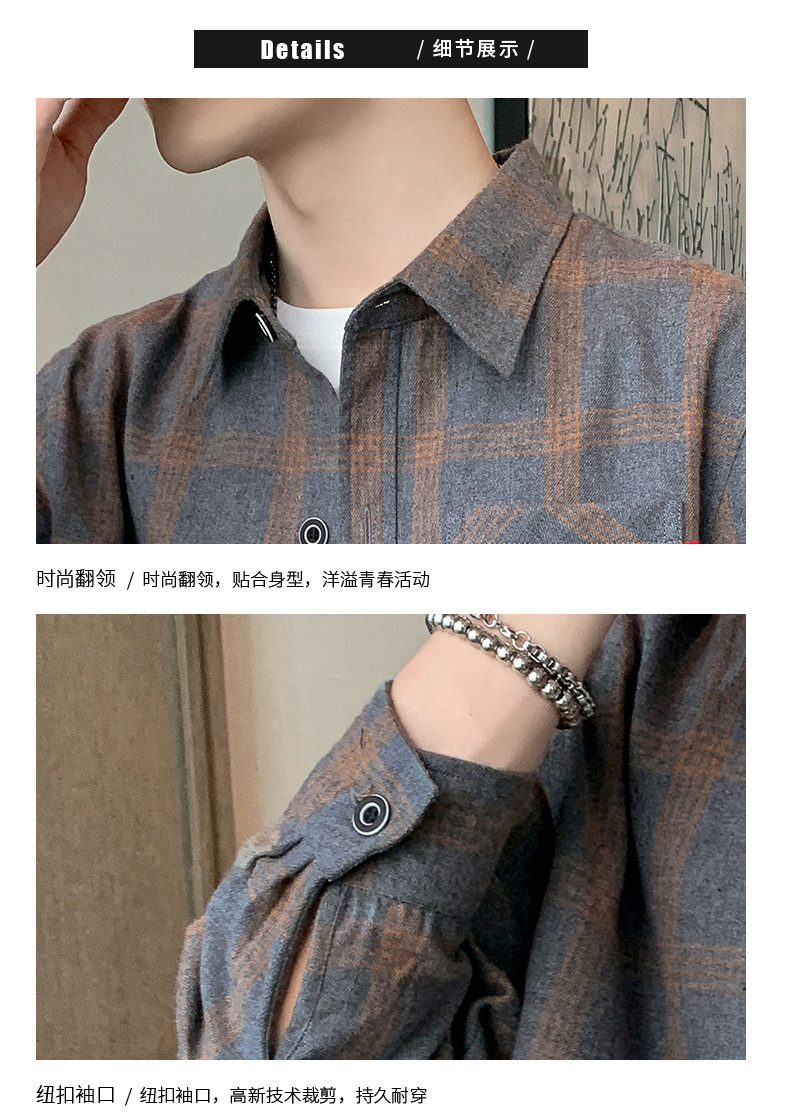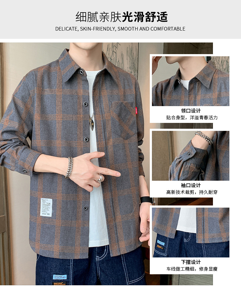 标题:2022秋季新品复古色开衫条纹男士长袖衬衫绒面触感翻领修身外套男