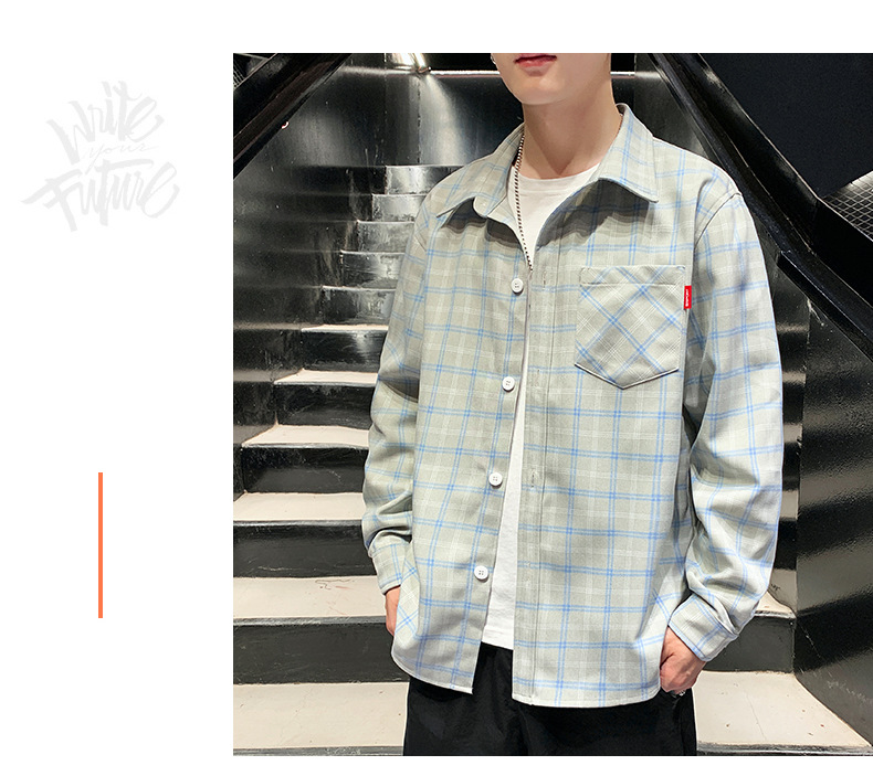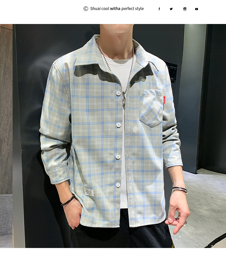 标题:长袖衬衫男秋季新款港风上衣服男士日系格子衬衣学生休闲帅气外套