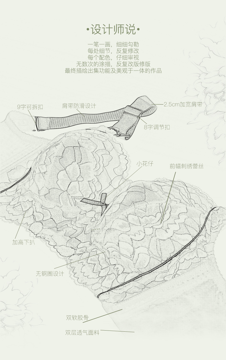 描述:面料名称:蕾丝,货号:XWT13,货源类别:现货,是否支持贴牌:支持,是否支持代工:支持,主面料成分:锦纶/尼龙,主面料成分的含量:64,里料成分:棉,里料成分含量:100,款式:传统型,功能:定型,聚拢,上托,塑身,调整型,侧收,收副乳,产地:佛山,适用人群:青年女性,风格:经典传统,是否无缝:否,是否有钢圈:无钢圈,设计特色:蕾丝边,罩杯型:全罩杯,模杯类型:超薄模杯,肩带类型:可拆卸双肩带,排扣类型:后五排搭扣,适合季节:夏季,冬季,春季,秋季,是否外贸:否,是否库存:是,库存类型:整单,改版:可改版,最低贴牌量:3,生产周期:45,合作过品牌:,贴牌对象:国内知名品牌,淘宝卖家,天猫品牌,主要销售渠道:淘宝,超市,商场,品牌店,天猫,个体实体,是否进口:否,颜色:T13烟灰,T13玫紫,T13经典肤,尺码:75B,75C,80B,80C,85B,85C,90B,90C,75D,75E,75F,80D,80E,80F,85D,85E,85F,90D,90E,90F,95B,95C,95D,95E,95F,主要下游平台:亚马逊,速卖通,独立站,LAZADA,主要销售地区:欧洲,东南亚,有可授权的自有品牌:是,是否跨境出口专供货源:是,肩带材质:棉制,包装形式:散装,适用年龄段:青年(18-40周岁),是否可外穿:不可外穿,有无质检报告:否,