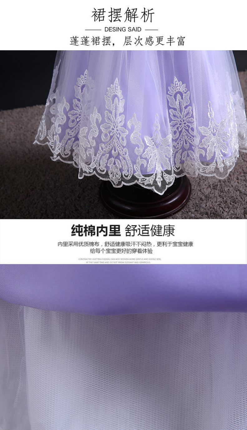 描述:产品类别:童礼服,货源类别:现货,品牌:蓝颜紫色,产地:广东,货号:Y003,适合年龄段:中大童(8岁以上,140cm以上),适用性别:女,图片实拍:实拍无模特,适合季节:春秋,夏季,冬季,春季,秋季,不限季节,面料工艺:酵素洗,上市年份季节:2022年夏季,元素:公主,风格:公主,AQL抽检标准:2.5,平车针距12~14针/3cm:是,毛头/杂余线头是否修剪:明显部位已修剪,面料名称:棉类混纺,主面料成分:聚酯纤维(涤纶),主面料成分含量:70,里料成分:棉,里料成分含量:70,安全等级:B类,礼服类型:礼服,颜色:浅紫色,果绿色,虾粉色,米白色,适合身高:110cm,120cm,130cm,140cm,150cm,160cm,主要下游平台:ebay,亚马逊,wish,速卖通,独立站,LAZADA,其他,主要销售地区:非洲,欧洲,南美,东南亚,北美,东北亚,中东,其他,有可授权的自有品牌:是,是否跨境出口专供货源:是,
