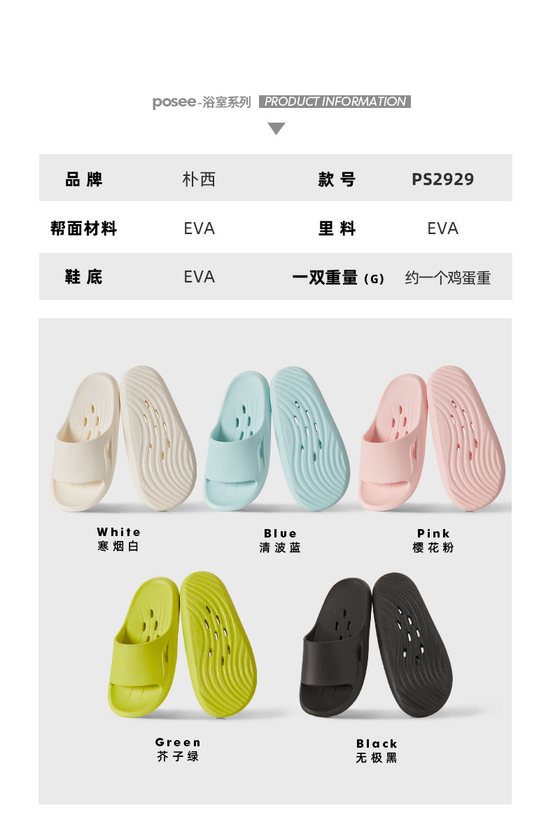 描述:适用性别:中性/男女均可,鞋底材质:EVA,是否外贸:否,功能:透气,防水,鞋面材质:EVA,流行元素:镂空,鞋底厚度:1.5CM以下,是否跨境货源:否,适用人群类型:情侣,款式:一字拖,质检报告:否,质检单位:sgs,货源类别:现货,品牌:朴西,货号:ps2929,拖鞋种类:漏水拖鞋,是否包跟:否,厚薄:单,是否带USB:否,最快出货时间:1-3天,上市年份季节(上市时间):2022年春季,最晚发货时间:16-30天,颜色:桃沙粉,净水蓝,午夜黑,云朵白,山葵绿,尺码:35-36,37-38,39-40,40-41,42-43,44-45,主要下游平台:ebay,亚马逊,wish,速卖通,独立站,LAZADA,主要销售地区:非洲,欧洲,南美,东南亚,北美,东北亚,中东,