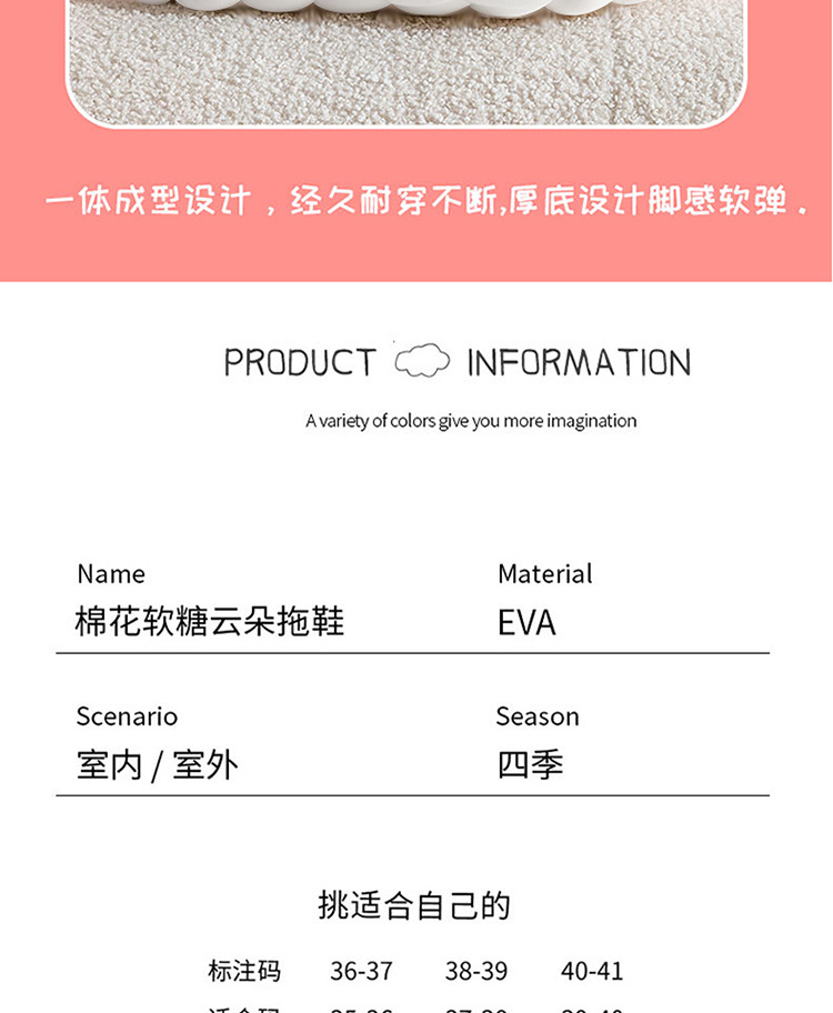 描述:适用性别:中性/男女均可,鞋底材质:EVA,外贸类型:出口,是否外贸:是,功能:减肥,增高,透气,防水,除臭,防滑,保暖,耐磨,减震,防静电,鞋面材质:EVA,流行元素:镂空,鞋底厚度:1.5cm(含)-3.5cm(不含),是否跨境货源:否,适用人群类型:情侣,款式:一字拖,鞋底工艺:注塑鞋,货源类别:现货,品牌:南方印迹,货号:冰淇淋,拖鞋种类:居家,是否包跟:否,厚薄:普通厚,最快出货时间:3天内,上市年份季节(上市时间):2022年夏季,最晚发货时间:4-7天,颜色:白色,黄色,紫色,粉色,pvc云朵白色,pvc云朵黄色,pvc云朵紫色,pvc云朵粉色,尺码:36-37,38-39,40-41,主要下游平台:亚马逊,速卖通,主要销售地区:东南亚,