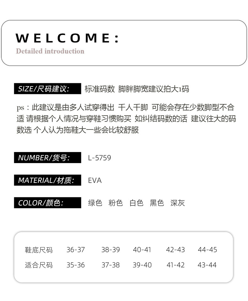 描述:货源类别:现货,品牌:安尚芬,货号:L-5759,拖鞋种类:套趾拖鞋,鞋底材质:EVA,适用性别:中性/男女均可,是否包跟:否,功能:透气,防滑,流行元素:洞洞鞋,厚薄:普通厚,是否带USB:否,鞋面材质:EVA,是否外贸:否,是否库存:是,库存类型:整单,最快出货时间:1,适用人群类型:情侣,鞋底工艺:注塑鞋,质检报告:否,质检单位:sgs,鞋底厚度:1.5cm(含)-3.5cm(不含),上市年份季节(上市时间):2022年夏季,颜色:绿 色,粉 色,白 色,黑 色,深灰,尺码:36-37适合35-36,38-39适合37-38,40-41适合39-40,42-43适合41-42,44-45适合43-44,是否跨境出口专供货源:否,款式:包头,