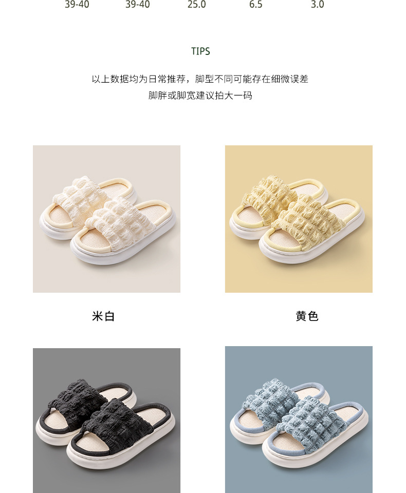 描述:适用年龄段:成年,颜色:P916米白,P916黄色,P916粉色,P916天蓝,P916黑色,尺码:36-37(适合35-36脚),38-39(适合37-38脚),40-41(适合39-40脚),适用人群类型:情侣,最快出货时间:1,鞋面材质:亚麻,是否带USB:否,适合季节:夏季,冬季,春季,秋季,适用性别:中性/男女均可,货源类别:现货,鞋底材质:EVA,品牌:时代元素,货号:P916,款式:套趾,是否包跟:否,功能:透气,吸汗,厚薄:加厚,上市年份季节(上市时间):2022年春季,鞋底厚度:3.5cm及以上,中底材料:EVA中底(一次发泡),风格:休闲,最晚发货时间:3天,是否跨境出口专供货源:是,