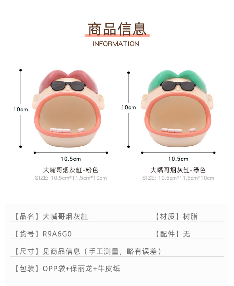 描述:材质:树脂,是否一次性:否,是否进口:否,附加功能:装饰,收纳,适用送礼场合:展销会,广告促销,员工福利,品牌:唐艺,货号:YHG,产地:浙江,烟灰缸尺寸:10.5x10cm,加印LOGO:不可以,加工定制:否,是否专利货源:否,颜色:大嘴哥烟灰缸-绿色,大嘴哥烟灰缸-红色,主要下游平台:亚马逊,主要销售地区:欧洲,有可授权的自有品牌:是,是否跨境出口专供货源:是,风格:卡通,适用送礼关系:同事,朋友,长辈,客户,送礼用途:积分换购礼品,商务送礼,促销礼品,个人礼品,是否属于礼品:是,商务礼品,版权:无,风格:卡通,