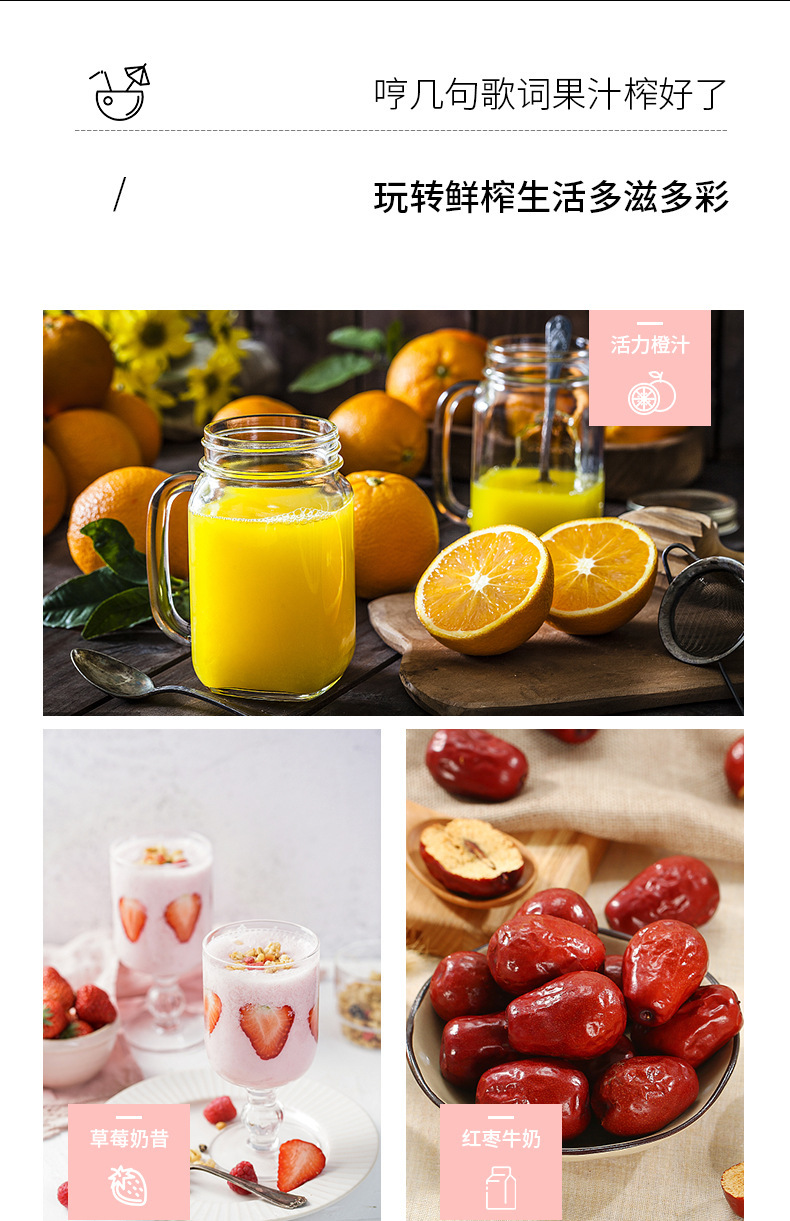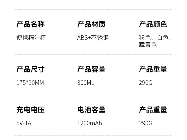 描述:功能:榨汁,转速:20001转/分(含)-22000转/分(含),刀头类型:五刀头以上,内胆材质:PC食用级塑料, 附加功能:充电便携,上市时间:2022年4月1号,功率:250W,容量:401mL(含)-600mL(含),售后服务:店铺三包,电压:≤36V,主要下游平台:ebay,亚马逊,wish,速卖通,独立站,LAZADA,颜色:白,玫红,青蓝,货号:AL671194716884,一次性最大出油量:400mL及以下,品牌:壕莱,一次性最大出汁量:401mL(含)-600mL(含),果肉渣滓盒容量:500ml以下(含500ml),加料口形状:圆形,榨汁机最高转速:20001转/分(含)-22000转/分(含),机身材质:塑料,不锈钢,包装清单:说明书,TyPe-c充电线,智能类型:不支持智能,有可授权的自有品牌:是,是否跨境出口专供货源:是,是否专利货源:是,专利类型:外观设计专利,专利号:ZL201930253524.5,是否为食品级材质:是,外壳工艺:拉丝,是否内置电池:内置电池,有无显示屏:无,款式分类:榨汁机料理/辅食机,