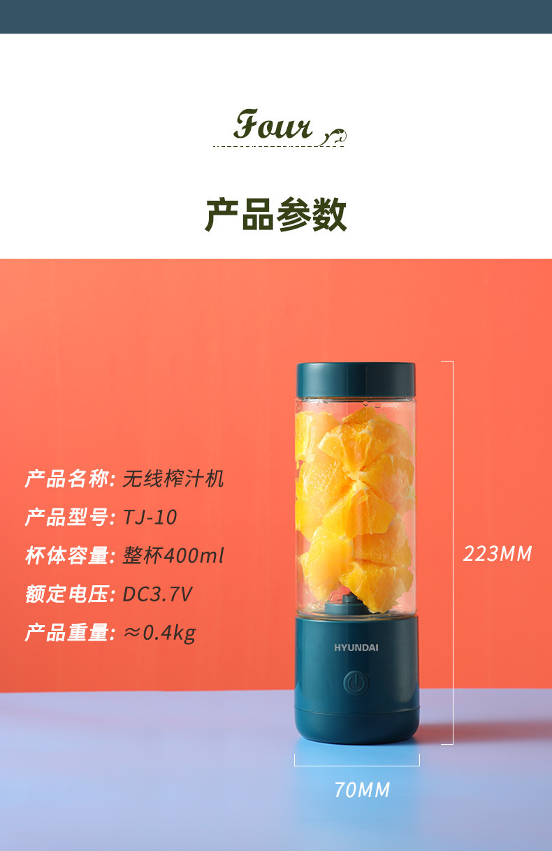 描述:功能:榨汁,转速:14000转/分钟,刀头类型:立式螺旋杆,内胆材质:PC食用级塑料, 附加功能:充电便携,自动清洁,静音降噪,快速出浆,上市时间:2022,功率:40W,容量:400mL,售后服务:店铺三包,电压:≤36V,主要下游平台:ebay,亚马逊,wish,速卖通,独立站,LAZADA,颜色:西柚粉【四刀高配款】,清新绿【四刀高配款】,润玉白【四刀高配款】,复古蓝【四刀高配款】,货号:TJ-10,一次性最大出油量:400mL及以下,品牌:HYUNDAI/现代,一次性最大出汁量:400mL及以下,果肉渣滓盒容量:500ml以下(含500ml),加料口形状:圆形,榨汁机最高转速:12001转/分(含)-15000转/分(含),机身材质:塑料,包装清单:榨汁机机头 、杯体、杯盖、USB充电线,智能类型:不支持智能,有可授权的自有品牌:是,是否跨境出口专供货源:是,是否专利货源:否,是否为食品级材质:是,外壳工艺:喷涂(UV漆,橡胶漆,金属漆,钢琴烤漆,珠光粉),是否内置电池:内置电池,有无显示屏:无,款式分类:随行杯,