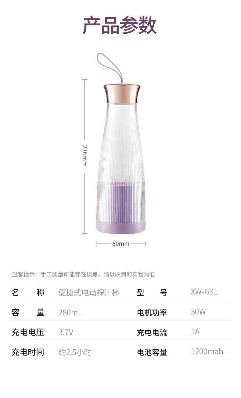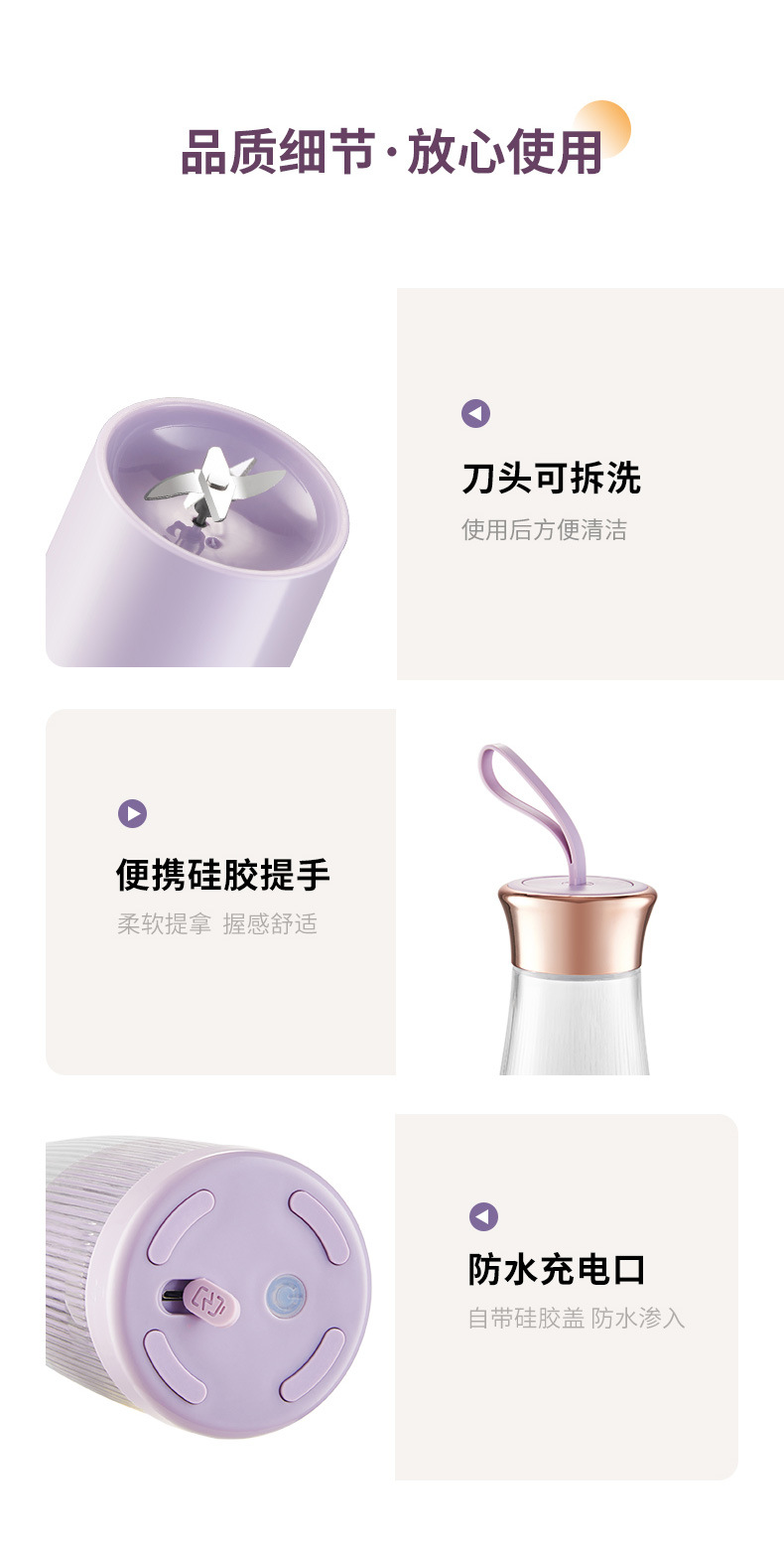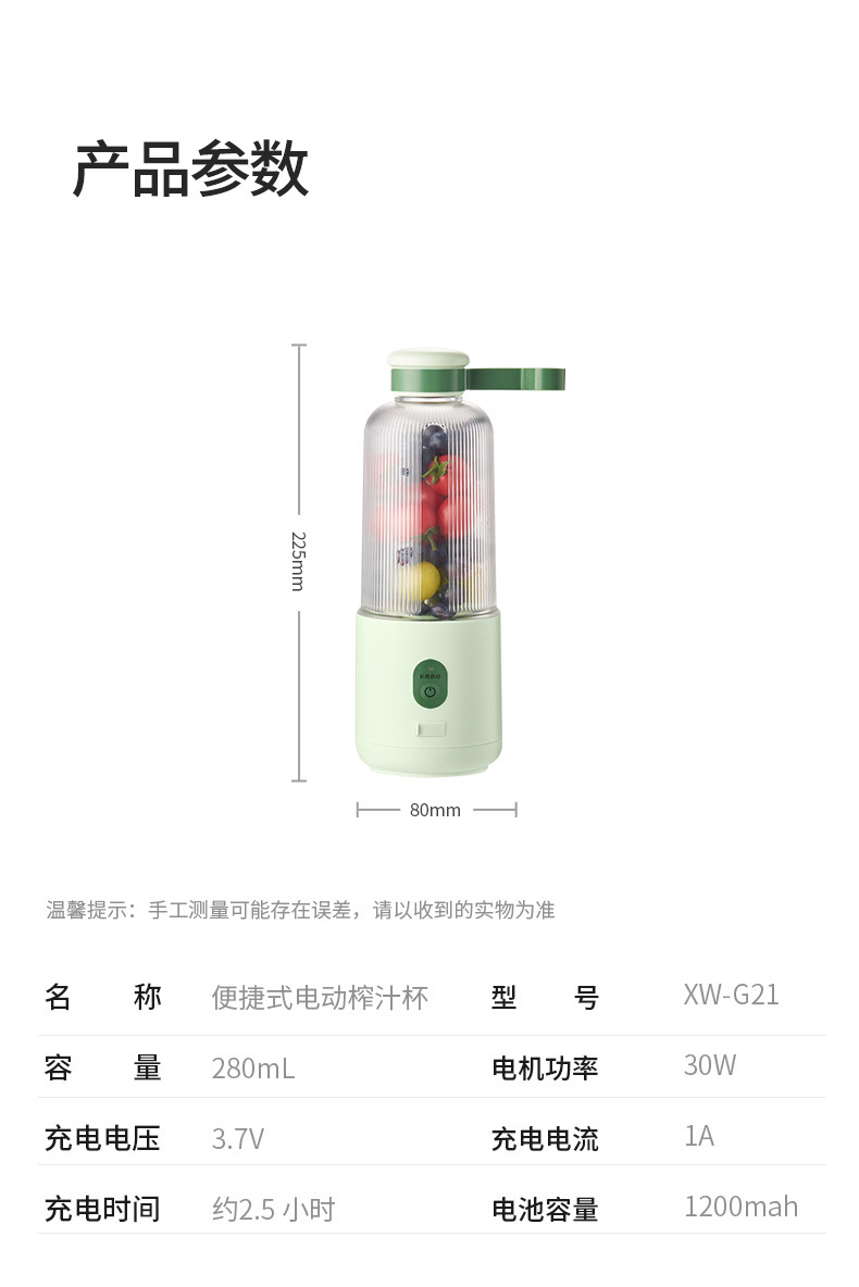 描述:品牌:卡屋,功率:200W及以下,功能:榨汁,容量:280ML,转速:12000/min,机身材质:PP,一次性最大出汁量:400mL及以下,榨汁机最高转速:12000转/分及以下,榨汁机附加功能:榨汁,果肉渣滓盒容量:500ml以下(含500ml),上市时间:2022年,货号:KW1335,颜色:G31魅力紫6叶刀片,G21清新绿6叶刀头,G13天空蓝2叶刀头,主要下游平台:ebay,亚马逊,wish,速卖通,独立站,LAZADA,主要销售地区:非洲,欧洲,南美,东南亚,北美,东北亚,中东,有可授权的自有品牌:是,是否跨境出口专供货源:是,