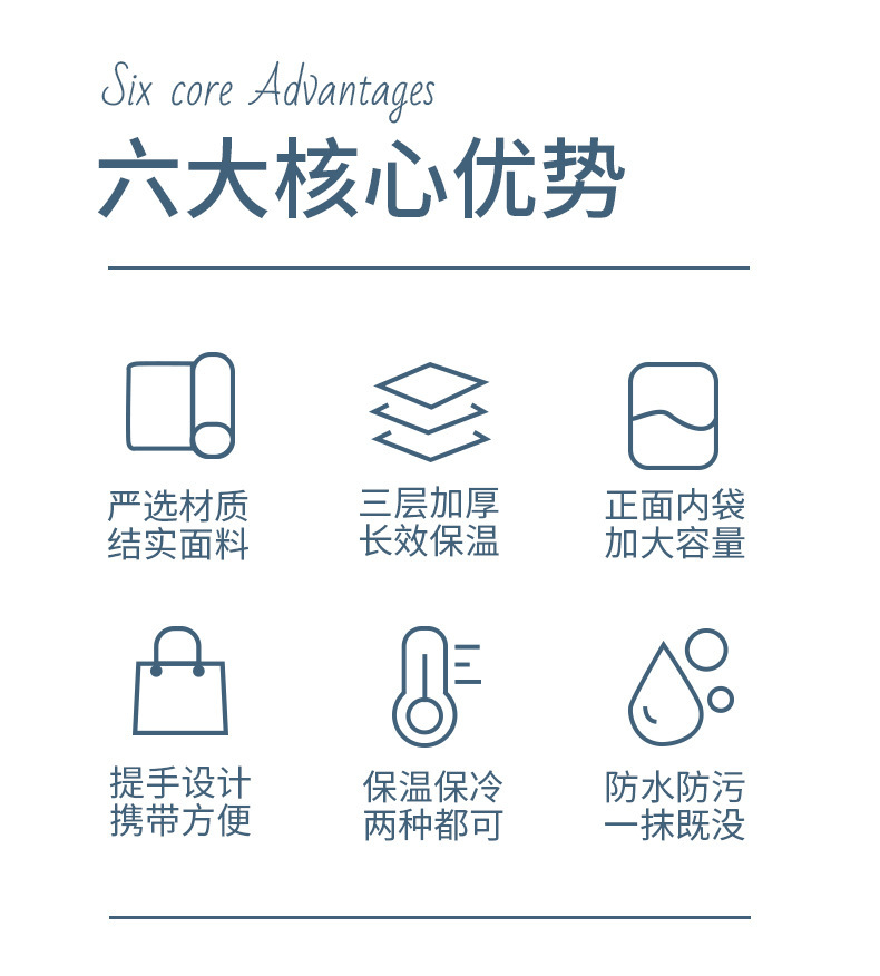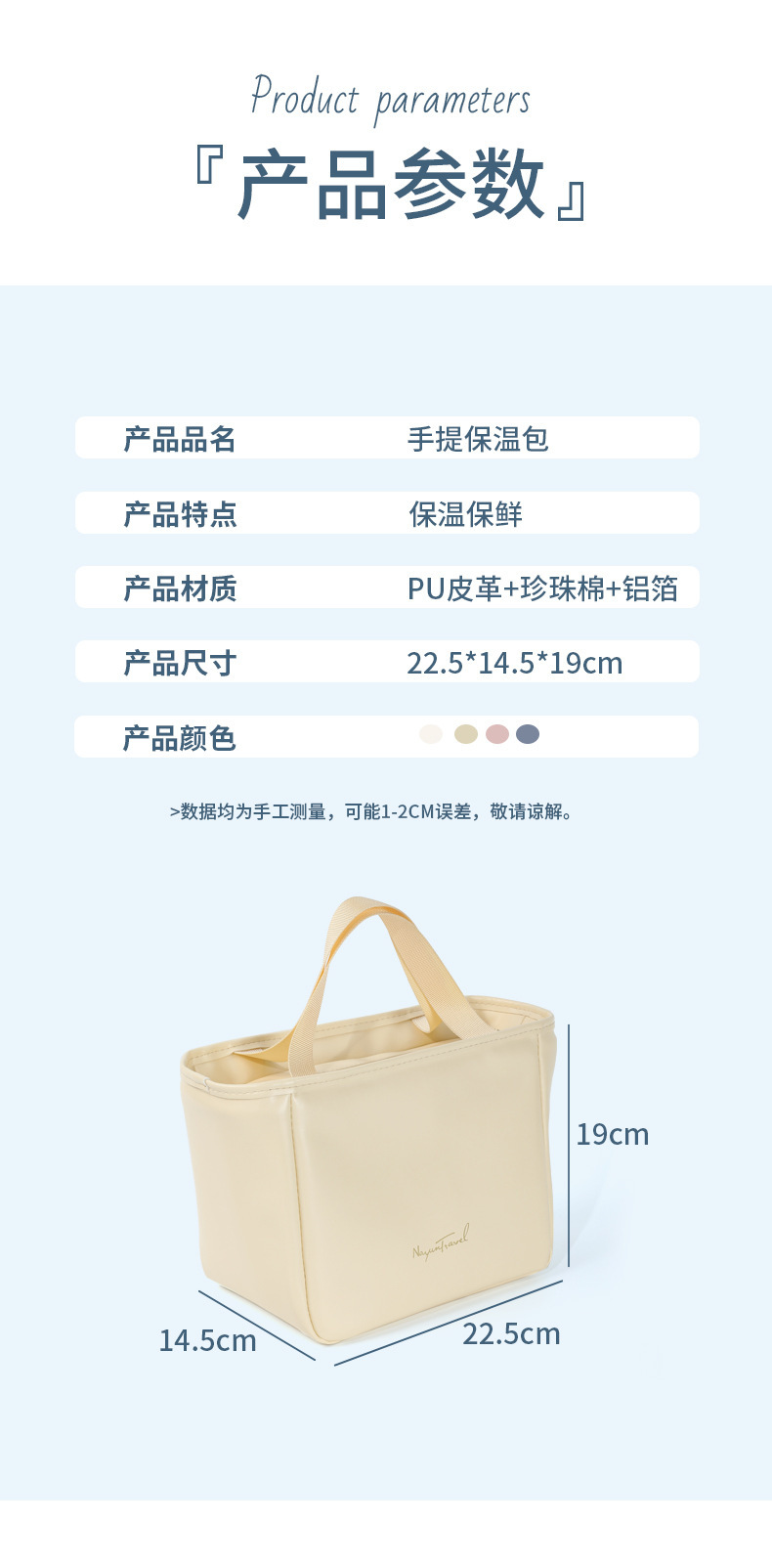 描述:材质:PU,功能:保温,便携,多功能,适用范围:上班,户外野餐等,颜色:米白色,粉红色,黄色,蓝色,规格:22.5*14.5*19CM