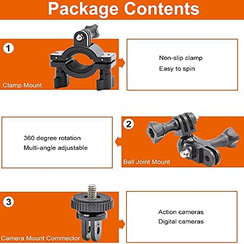 , WIDE COMPATIBILITY: Fits any handlebar/pole/tube with 20-35mm in diameter.Compatible with GoPro Max, GoPro Hero 9/8/7/6/5/4/3/2/1 and YICAM, SJCAM, AKASO, Campark, Crosstour, Dragon Touch, APEMAN, COOAU, Neewer, Victure, VanTop action cameras and other digital cameras. , FREELY ADJUSTABLE: 360 degree rotation ball joint extension mount with multi-joints design and 1/4-20 camera mount connector allows for much more direction adjustable for more capture angle. , DURABLE BIKE CAMERA HOLDER: Medical equipment level PC material,higher toughness and not easy to break. , NON-SLIP CLAMP MOUNT: 2 pieces soft rubber pad covered calmp ensure the mount tightly on the handlebar and keep your camera stable to the holder even on a bumpy road. , EASY INSTALLATION: Two-wing screw design,allow you can easily spin the screw and quickly install-release the mount.No any other tools needed. ||Product Dimensions:7 x 7 x 14 cm; 160 Grams&&ASIN:B0987D66YD