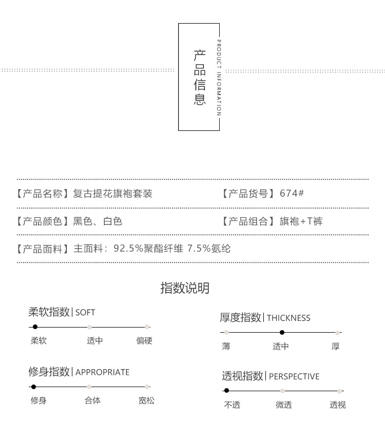 描述:角色扮演:旗袍,款式:制服装,款式细节:透视,面料名称:丝绒类,主面料成分:聚酯纤维(涤纶),主面料成分的含量:92.5,包装形式:简装,适用性别:女,适用年龄段:青年(18-40周岁),上市时间:2021冬,产地:连云港,货源类别:现货,是否库存:是,库存类型:整单,是否支持贴牌:支持,改版:可以改版,最低贴牌量:300,贴牌对象:国内知名品牌,外单加工,淘宝卖家,天猫品牌,合作过品牌:瑰若,主要销售渠道:淘宝,品牌店,天猫,个体实体,国内商场,是否支持代工:支持,加工周期:10天,是否跨境出口专供货源:是,主要下游平台:ebay,亚马逊,wish,速卖通,独立站,LAZADA,主要销售地区:非洲,欧洲,南美,东南亚,北美,东北亚,中东,有可授权的自有品牌:是,是否进口:否,误差范围:2cm,货号:674,品牌:瑰若,颜色:白色,黑色,尺码:均码,是否外贸:是,