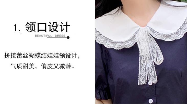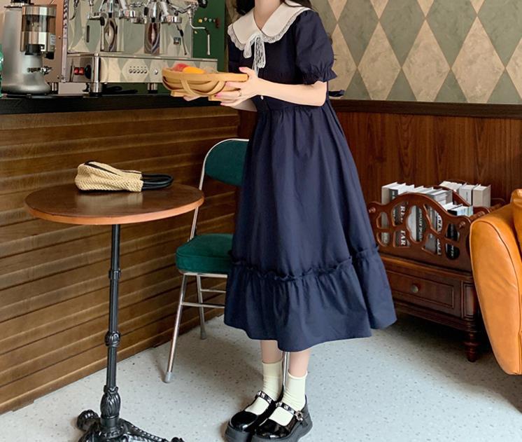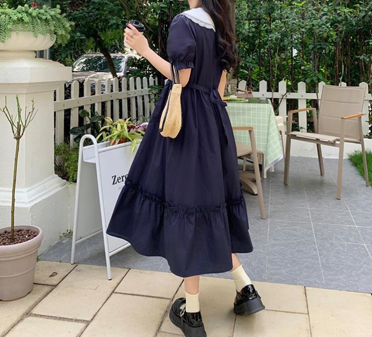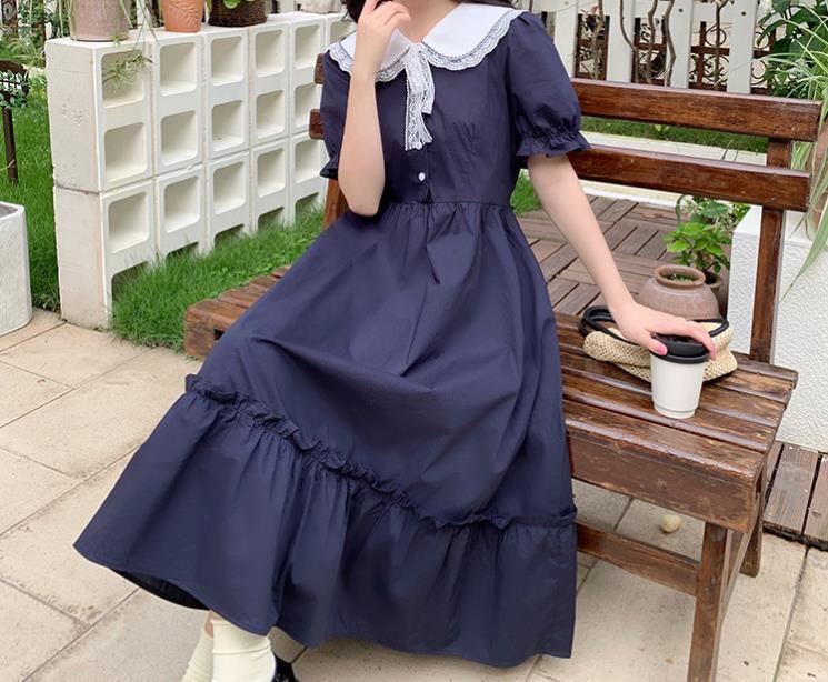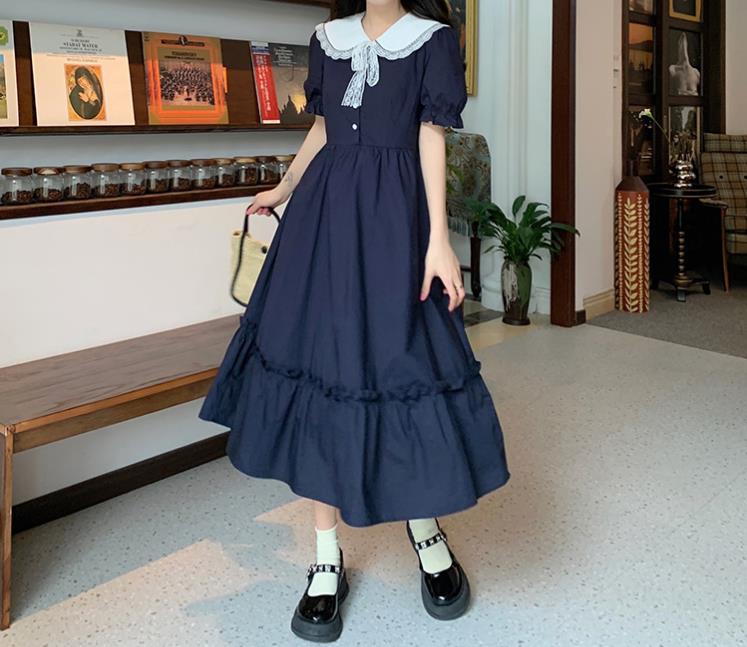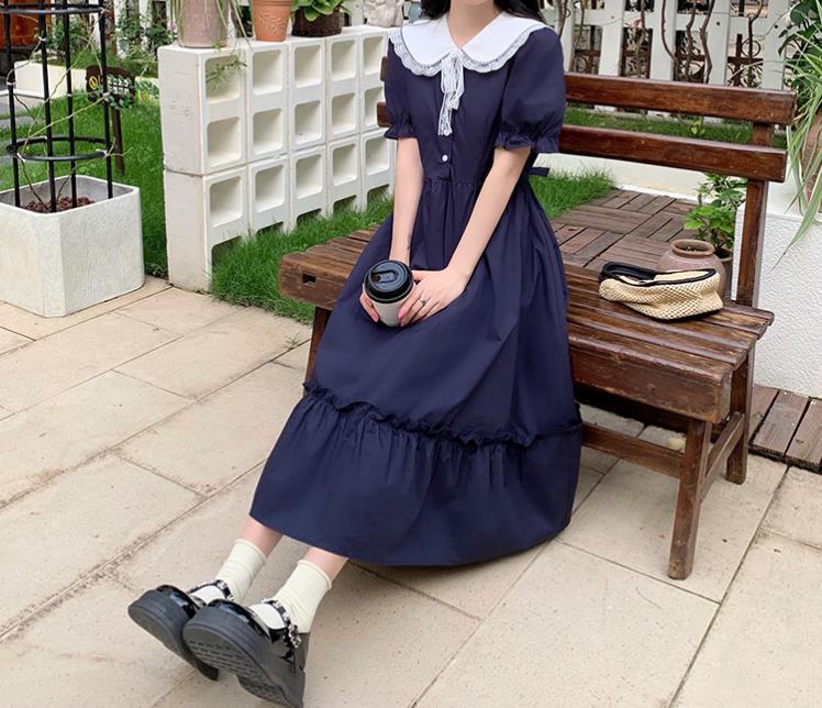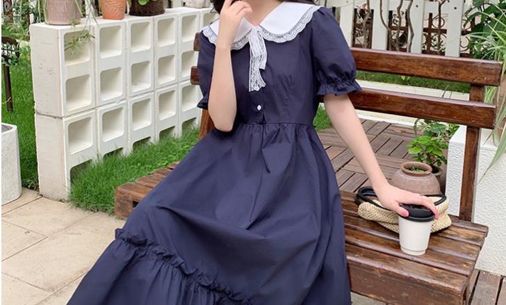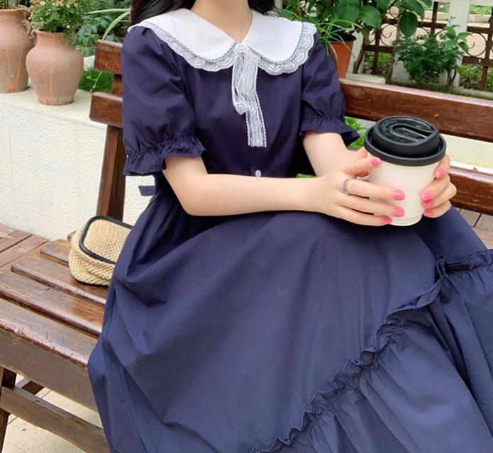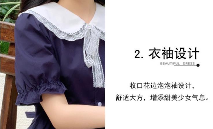 标题:純綿半袖ワンピース夏の新作学院風中高生の少女人形ネック膝丈スカートA字スカート
