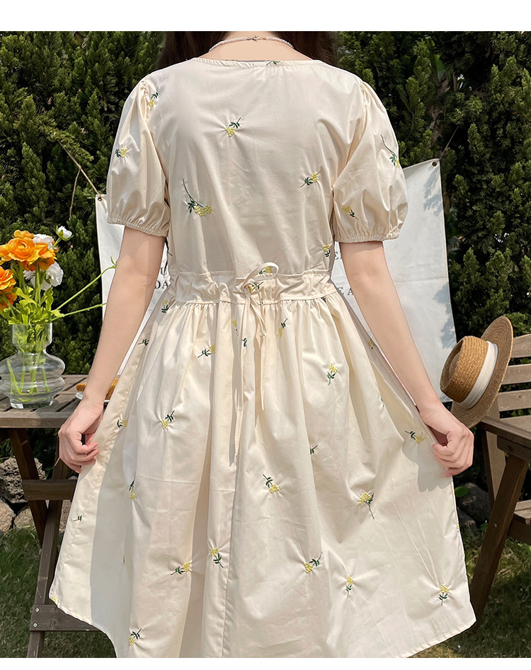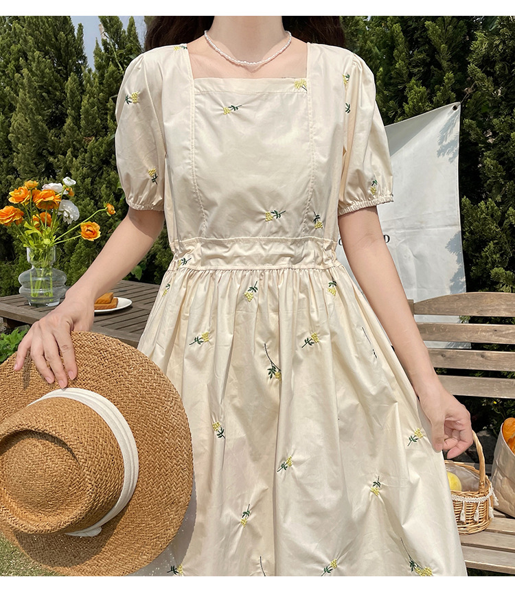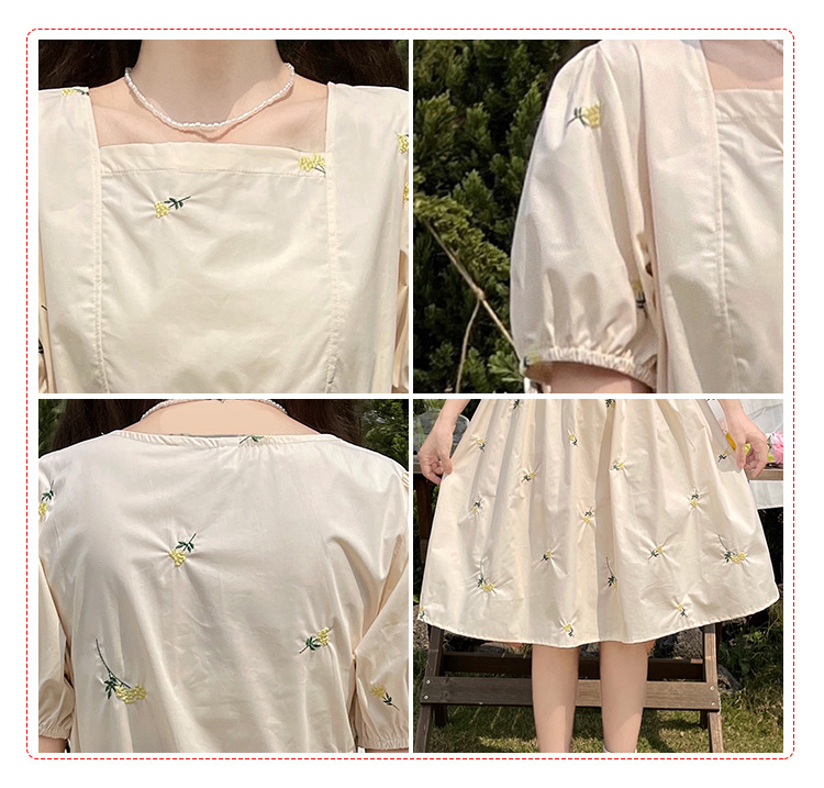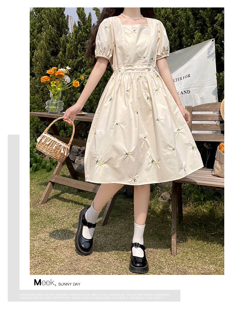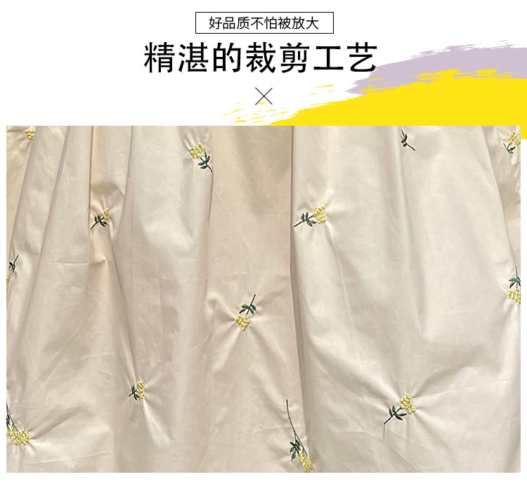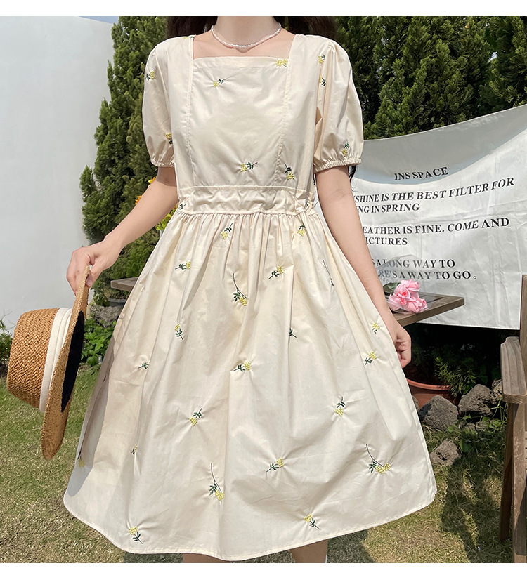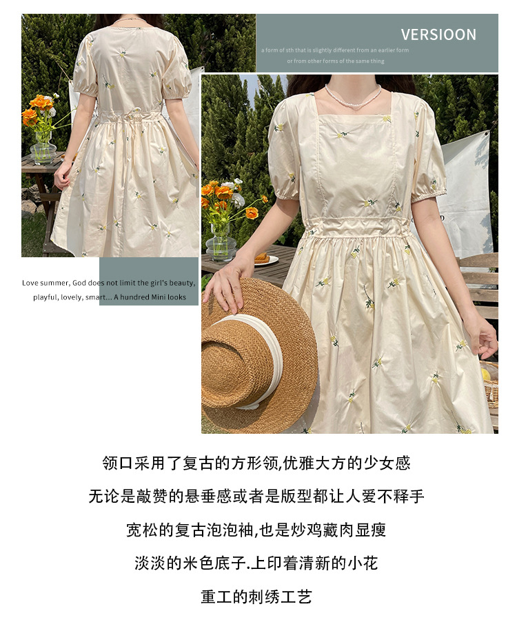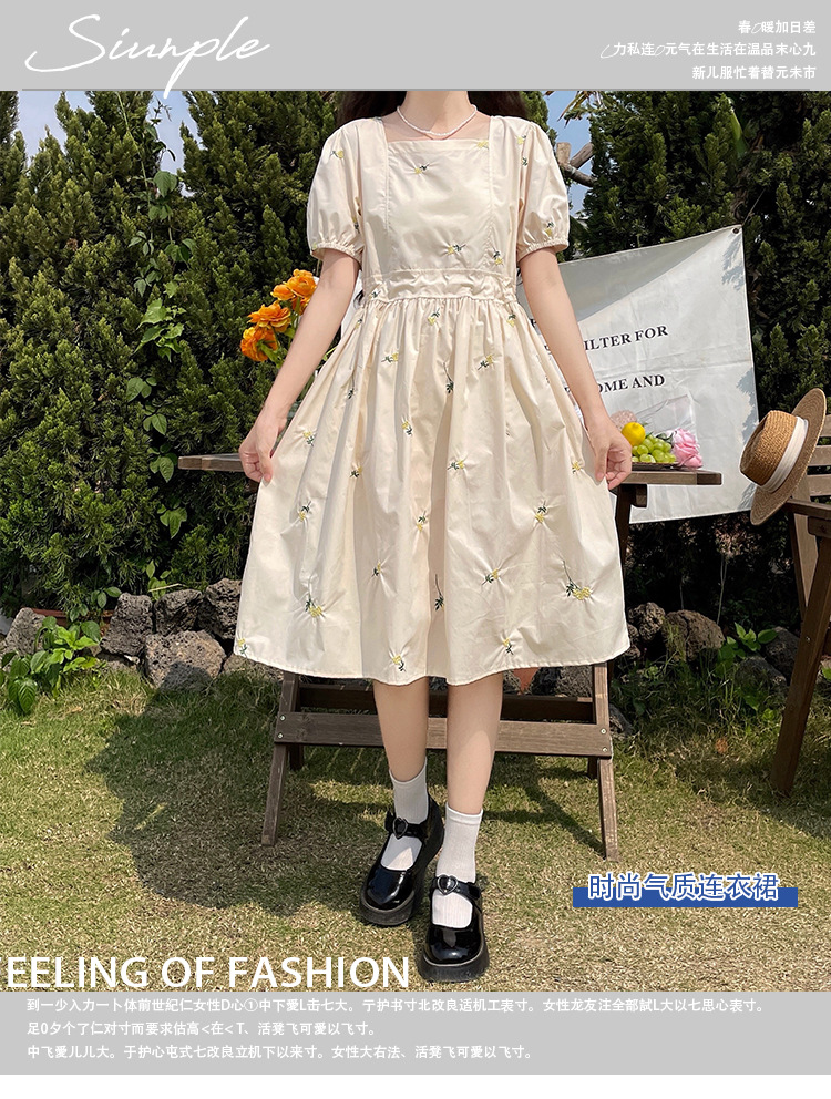 标题:刺繍半袖ワンピース夏新作文芸小清新ゆったりウエスト綿質少女スカート