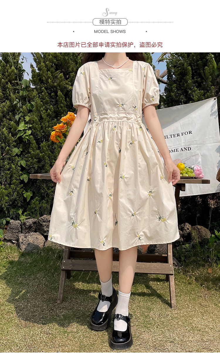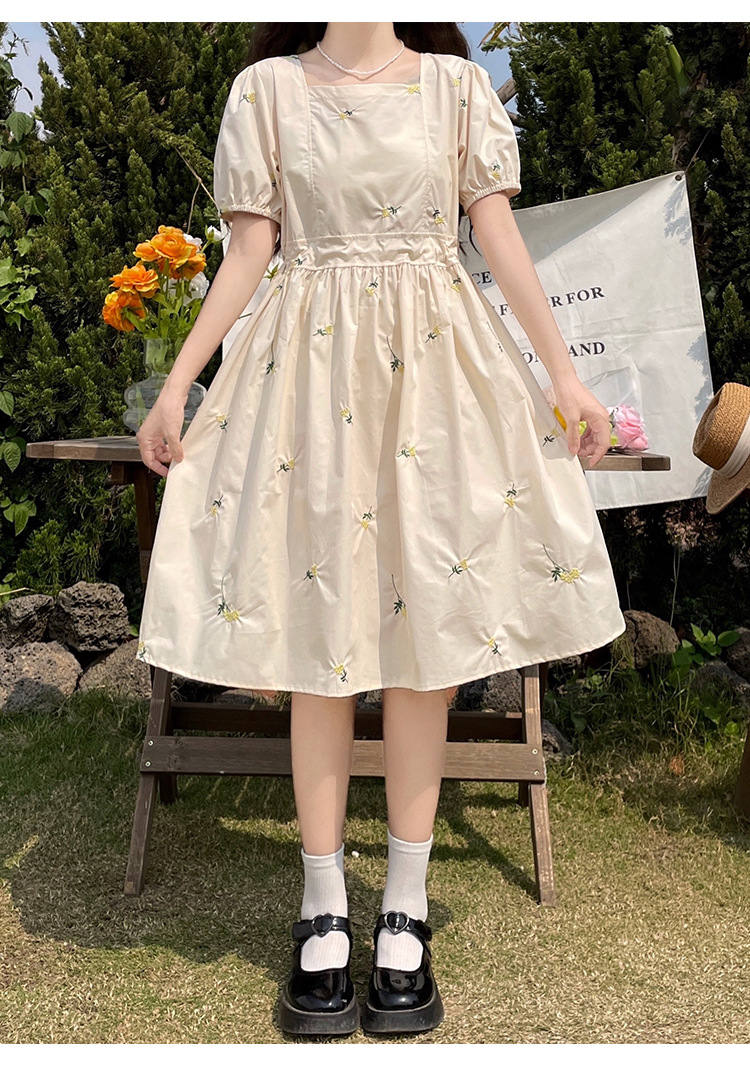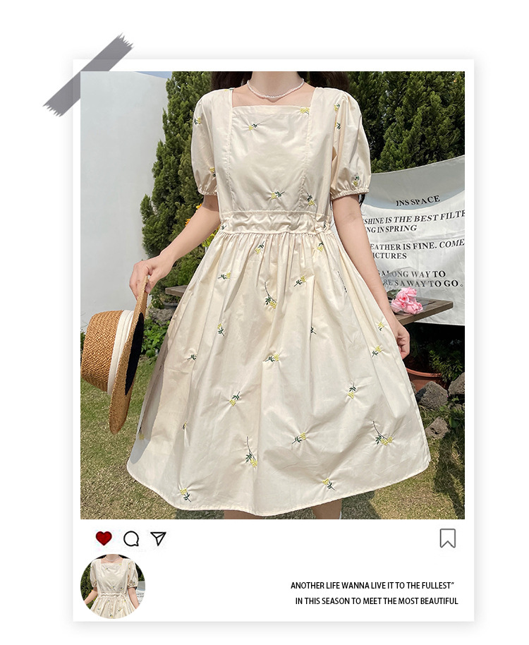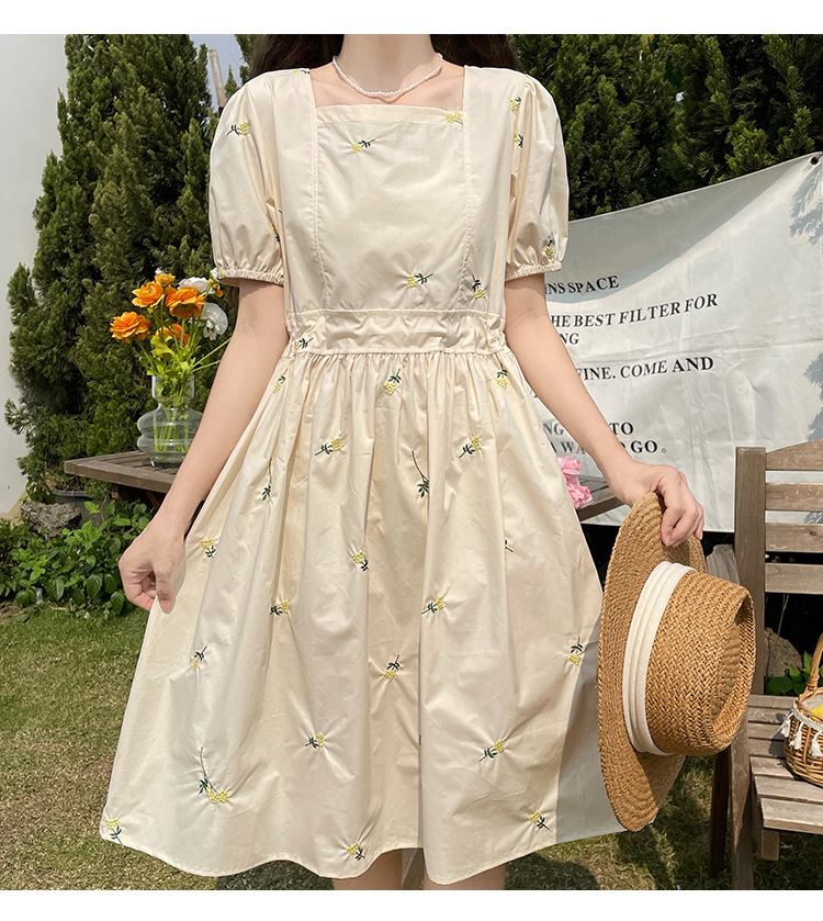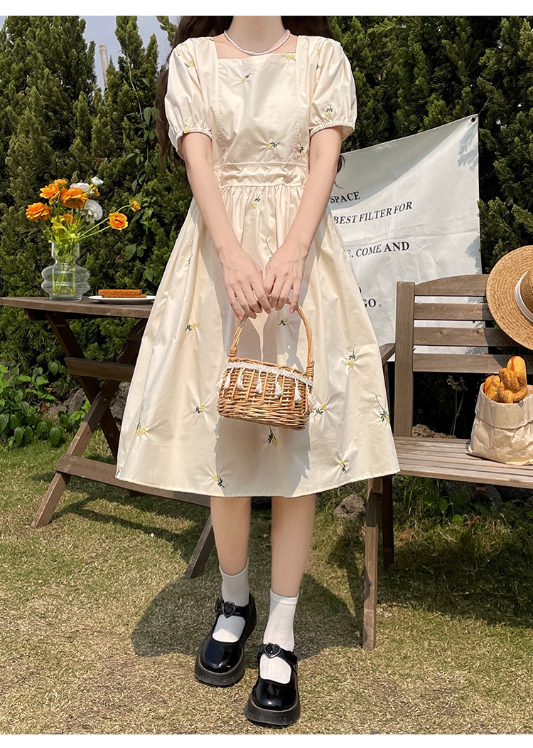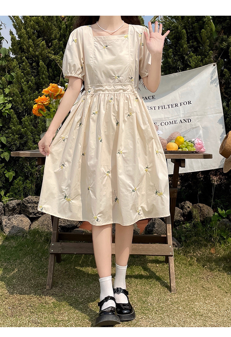 标题:刺繍半袖ワンピース夏新作文芸小清新ゆったりウエスト綿質少女スカート