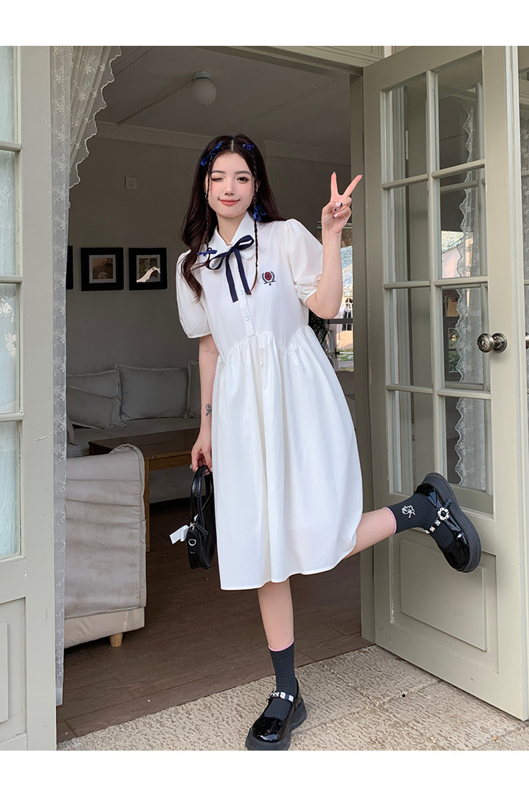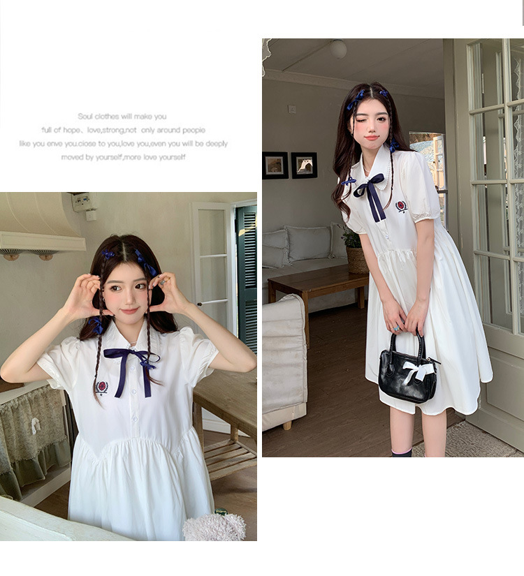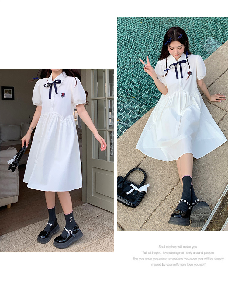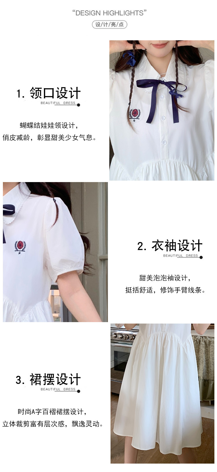 标题:白の半袖ワンピース夏の新作甘いアカデミア風ゆったり着やせ少女っぽいシフォンスカート
