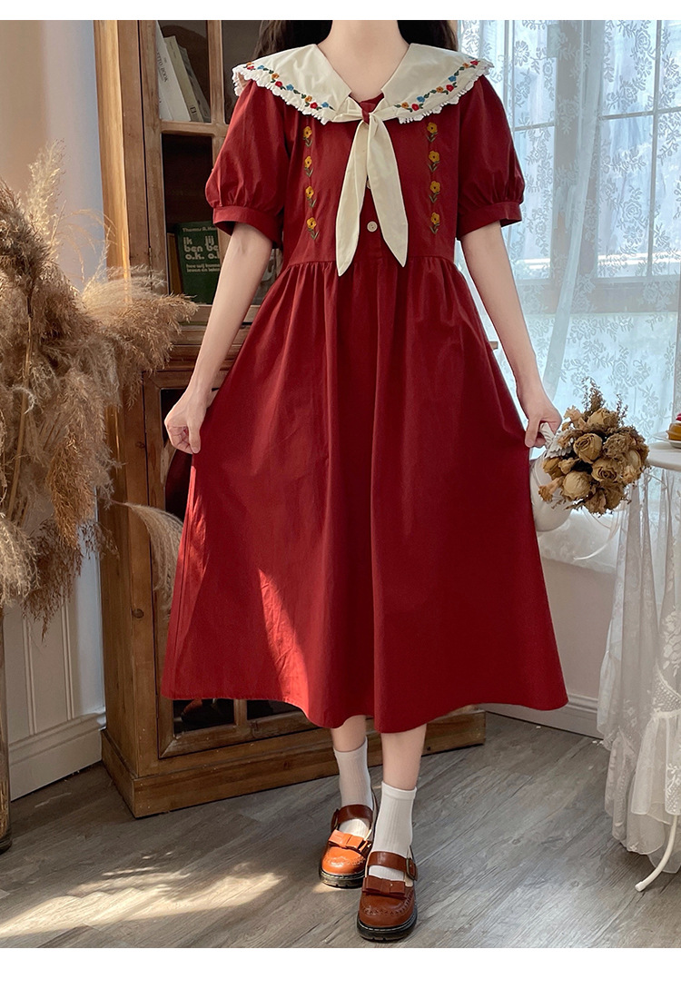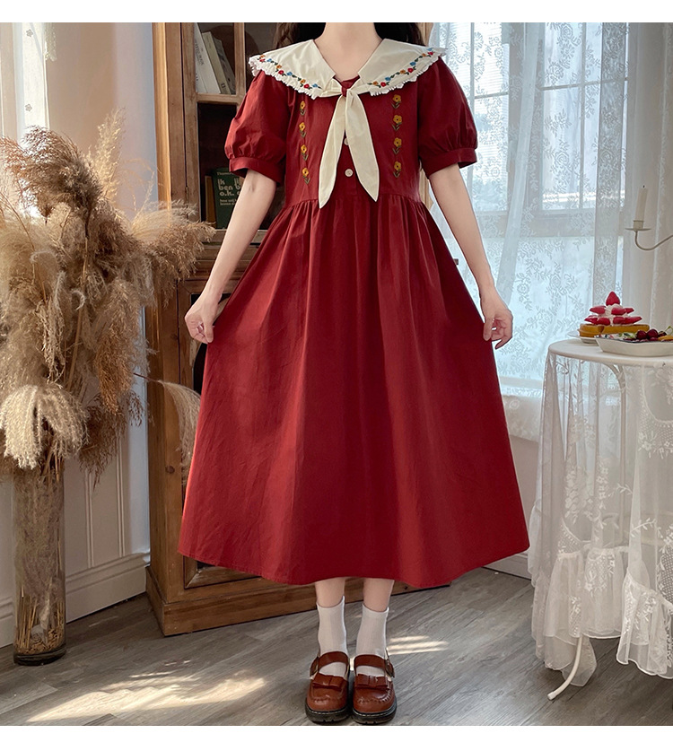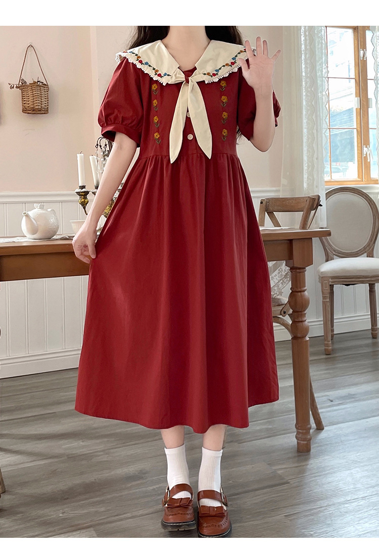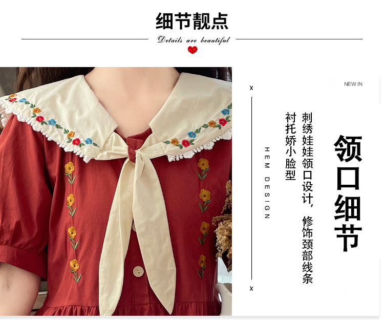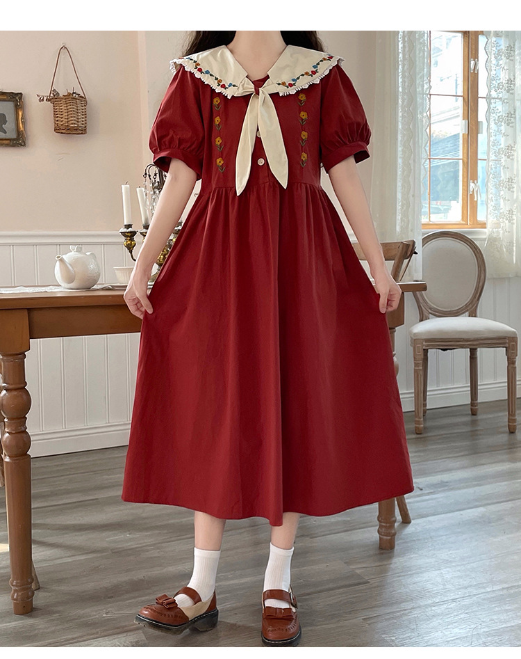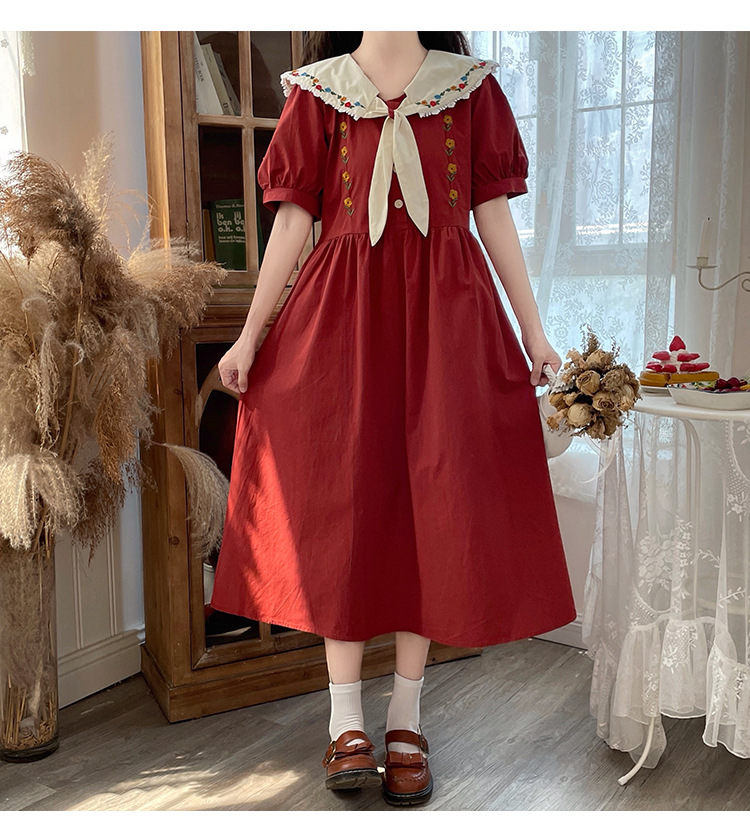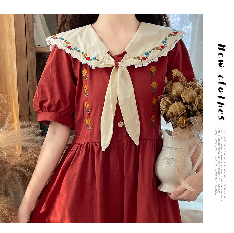 标题:綿の半袖ワンピース夏の新作森ガール系中高生刺繍ゆったりかわいいスカート