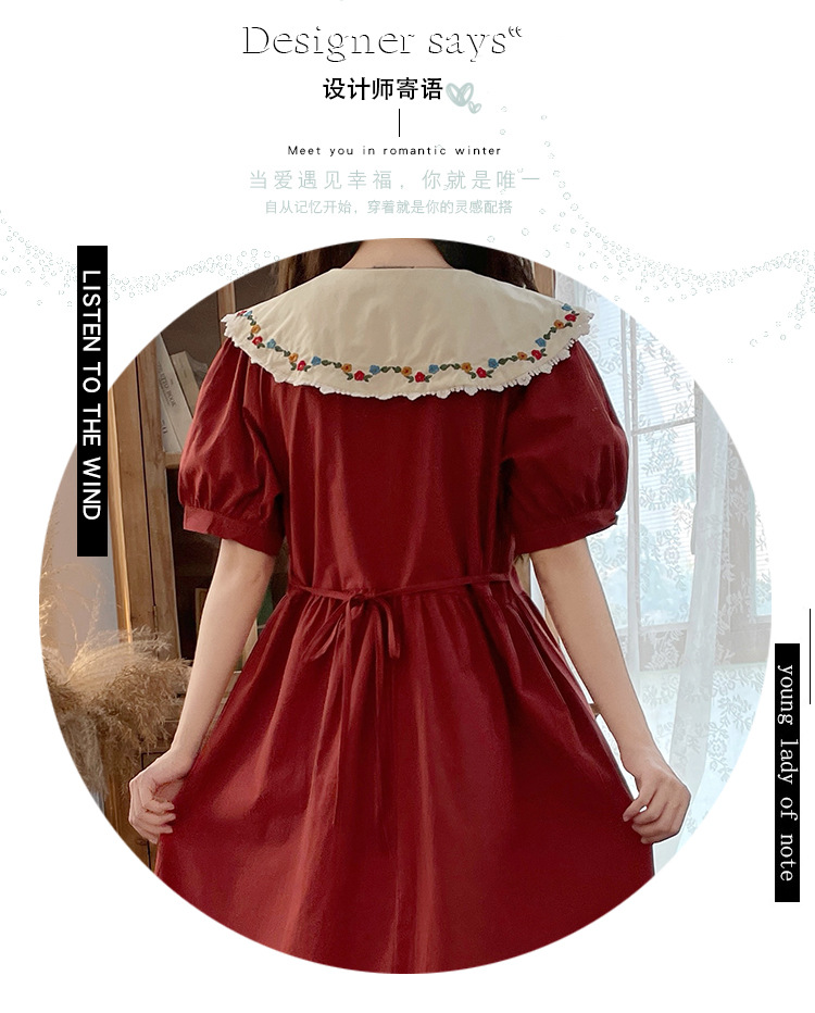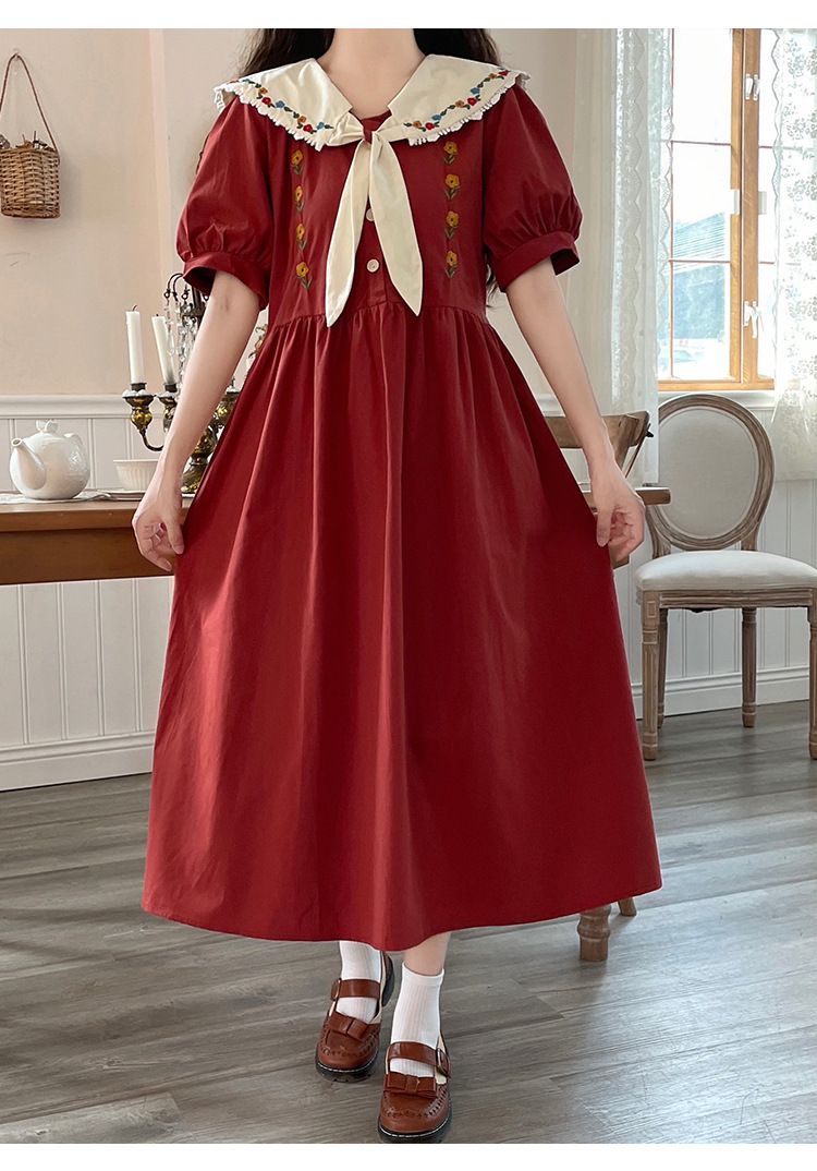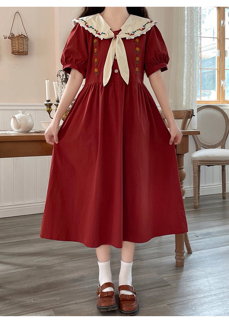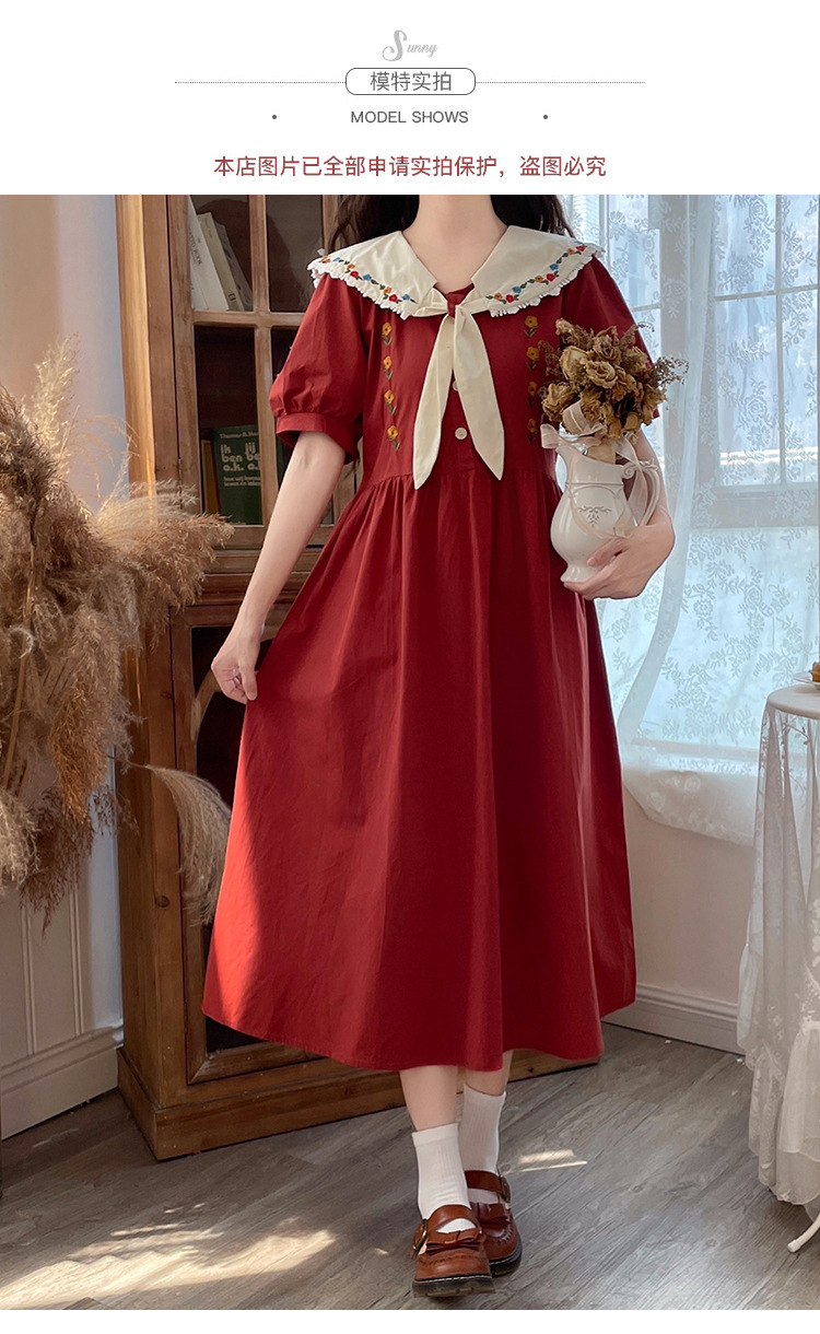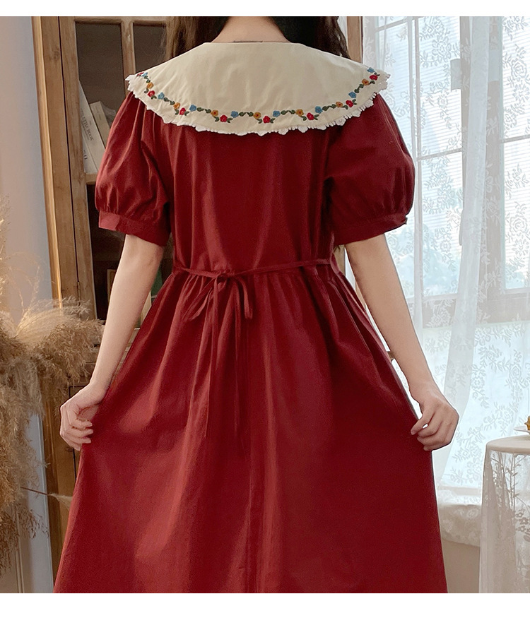标题:綿の半袖ワンピース夏の新作森ガール系中高生刺繍ゆったりかわいいスカート