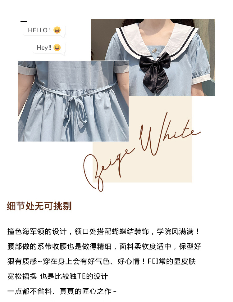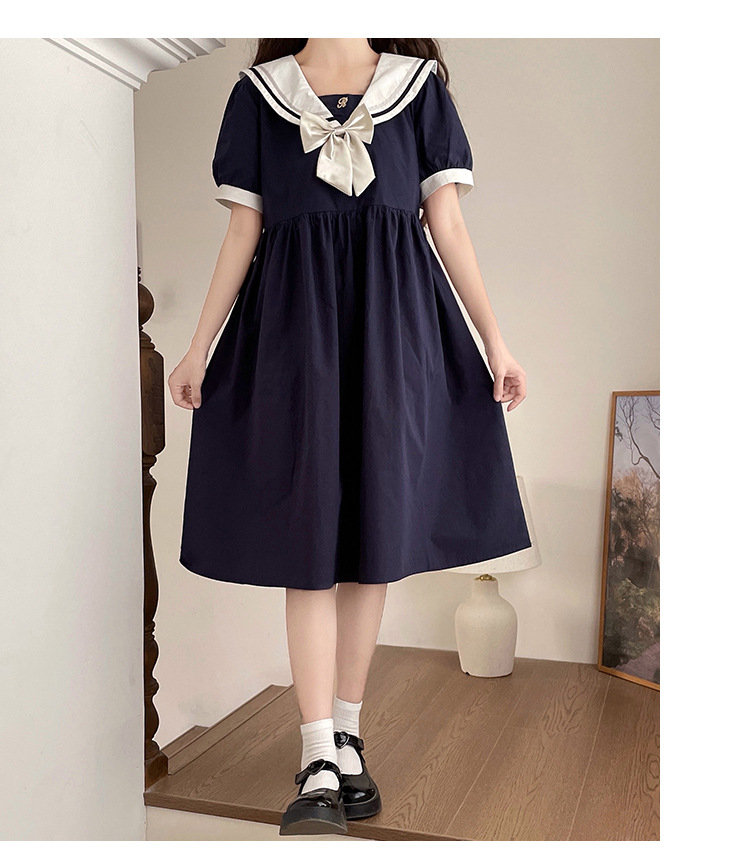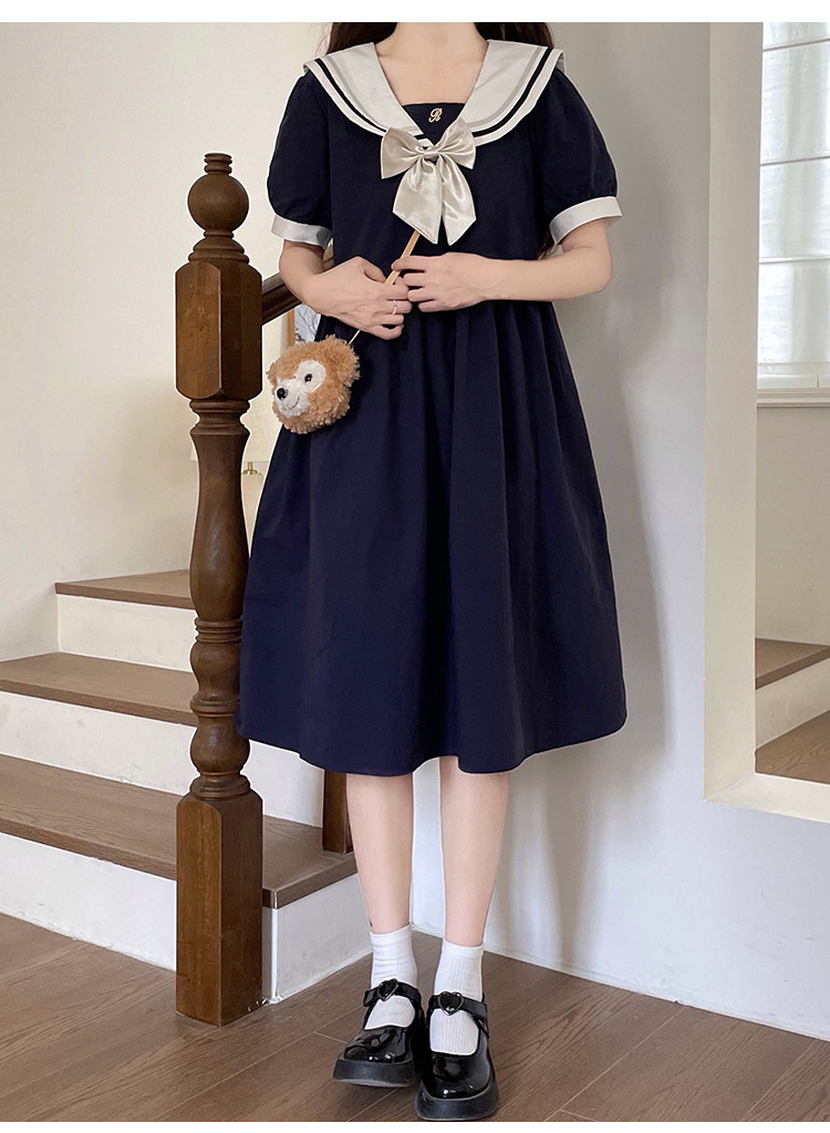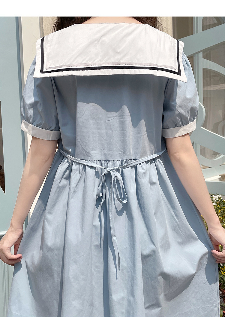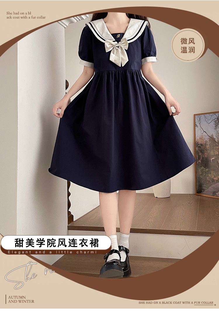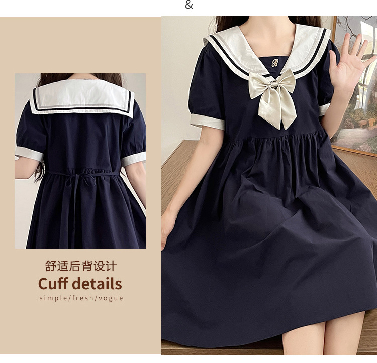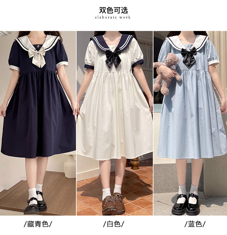标题:ネイビーカラーの半袖ワンピース夏の新中高生ゆったりウエスト丸めた可愛いコットンのロングスカート