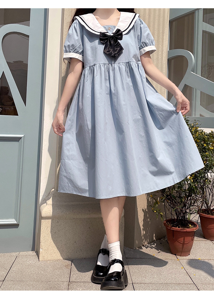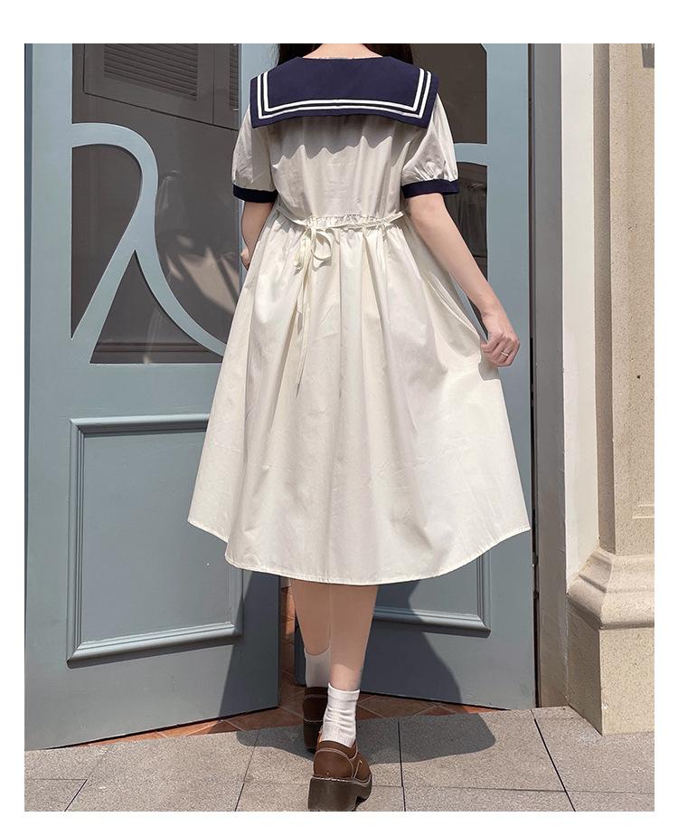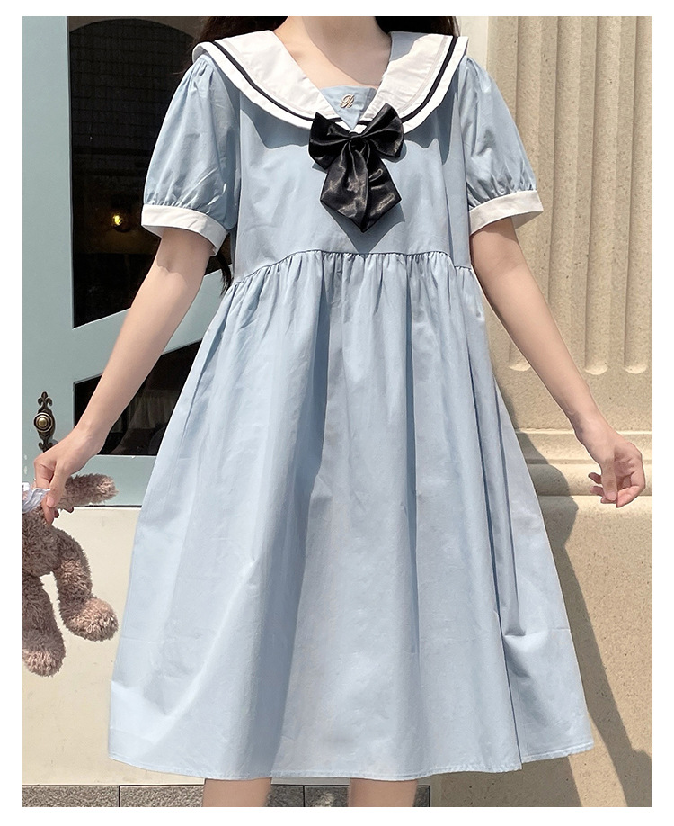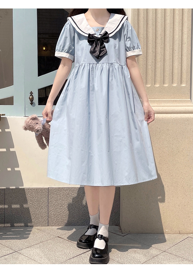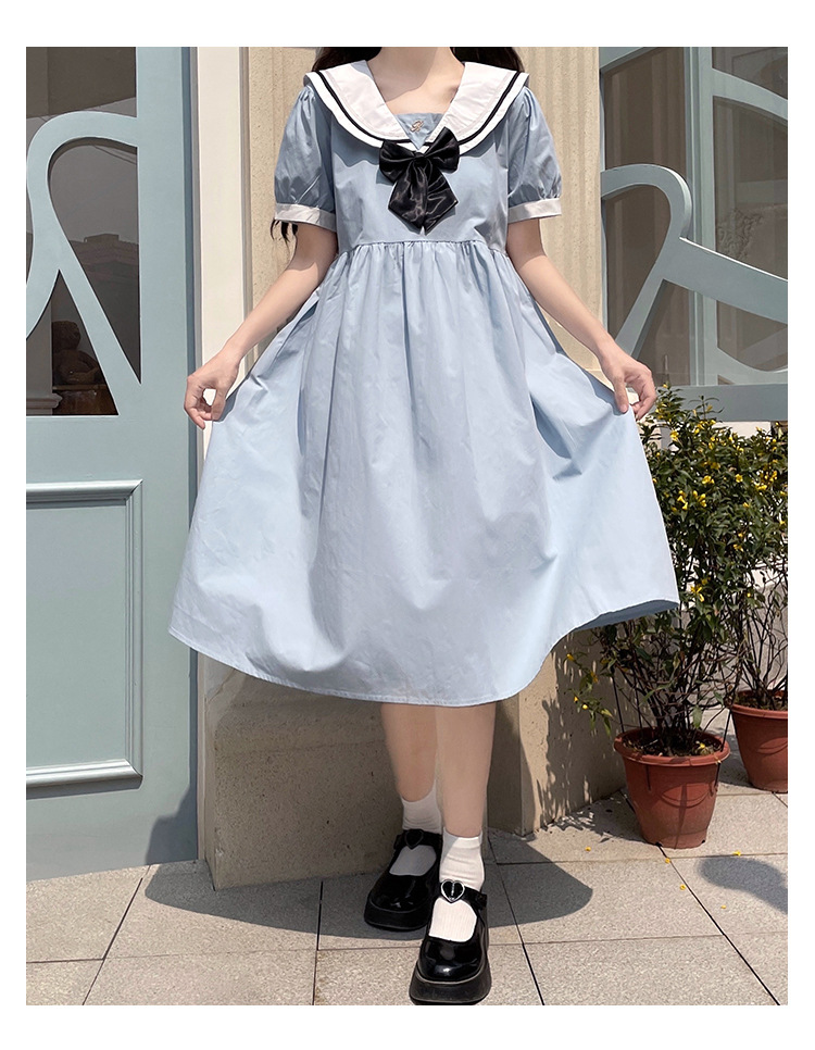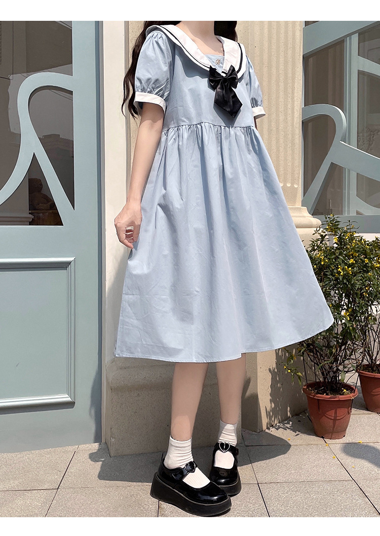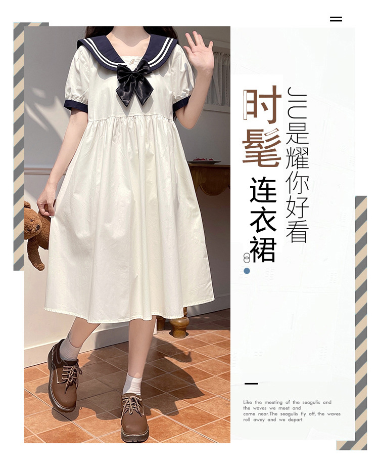 标题:ネイビーカラーの半袖ワンピース夏の新中高生ゆったりウエスト丸めた可愛いコットンのロングスカート