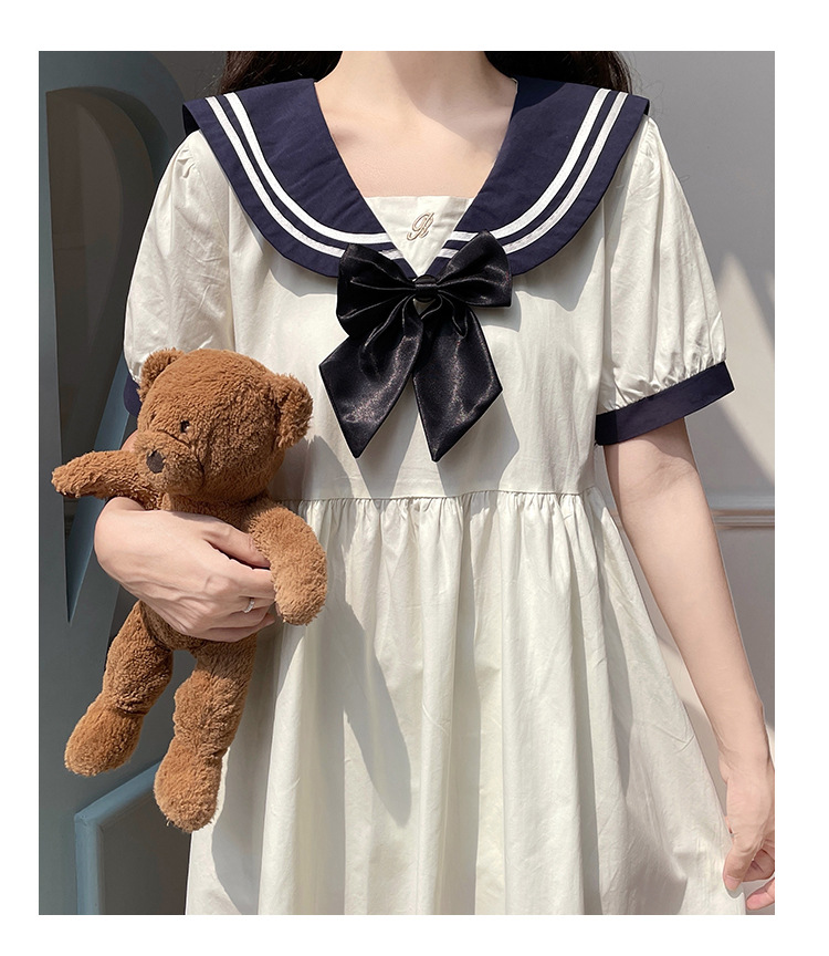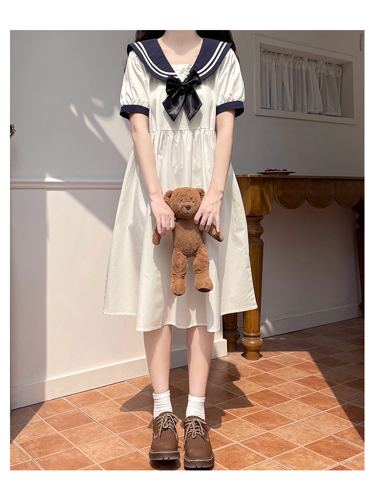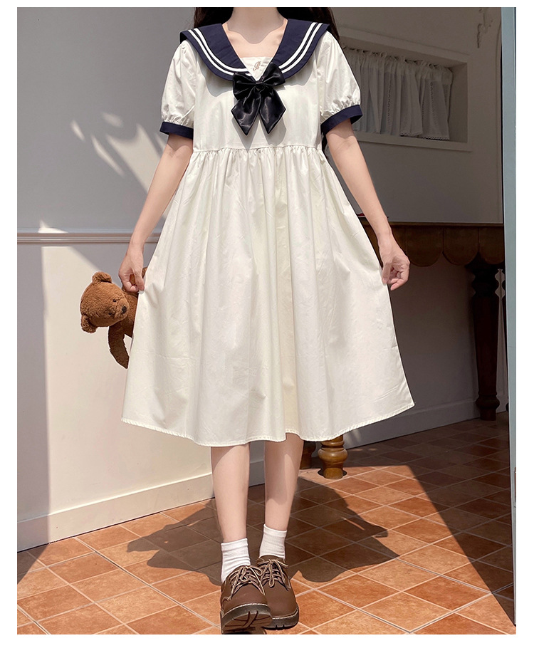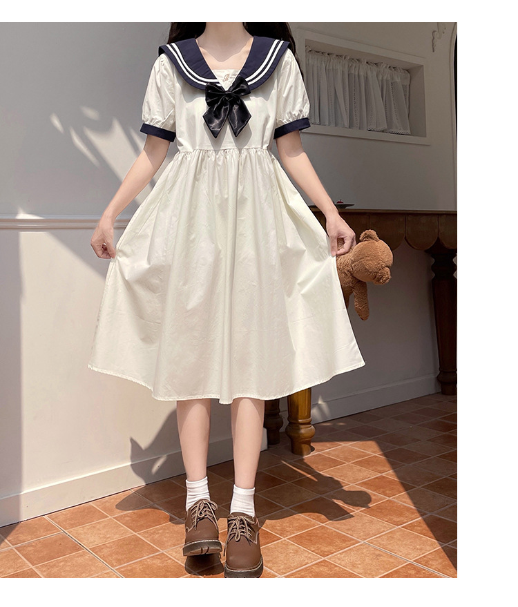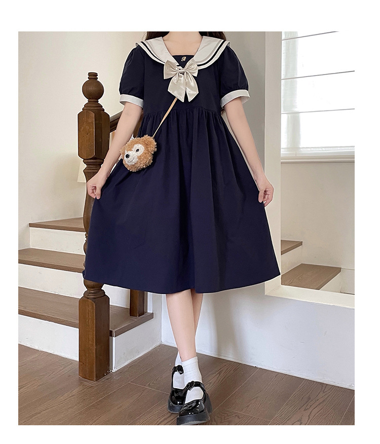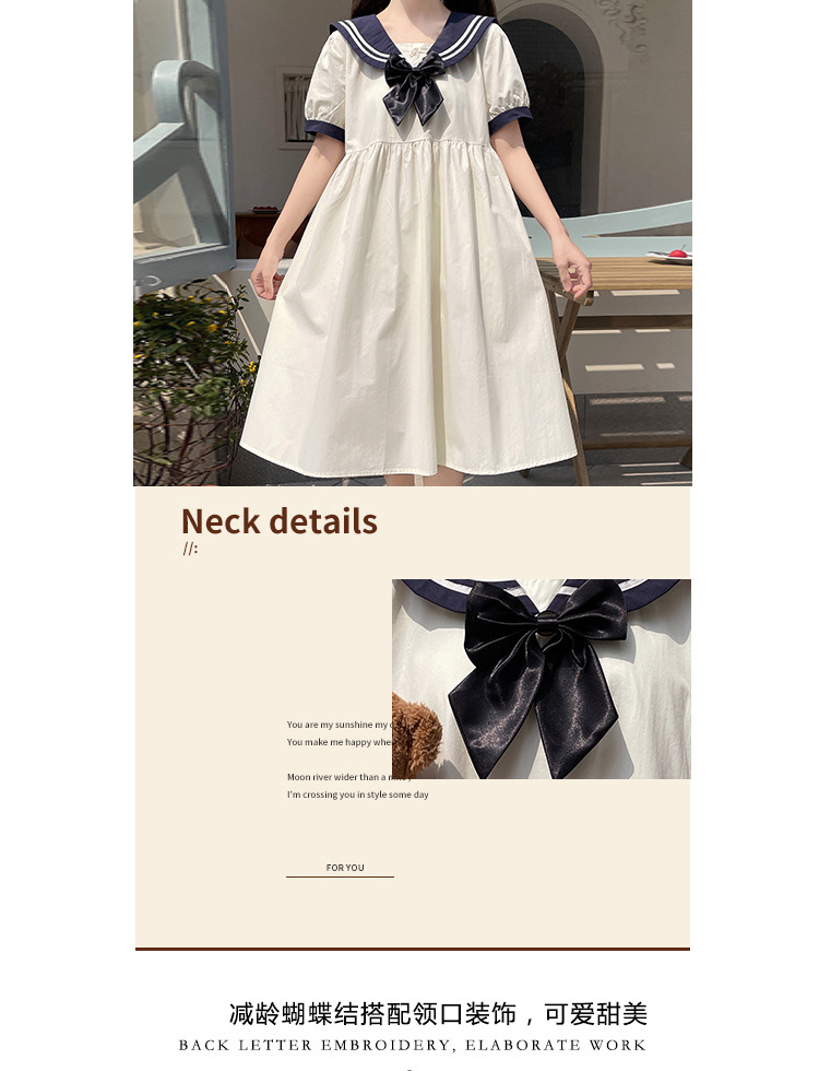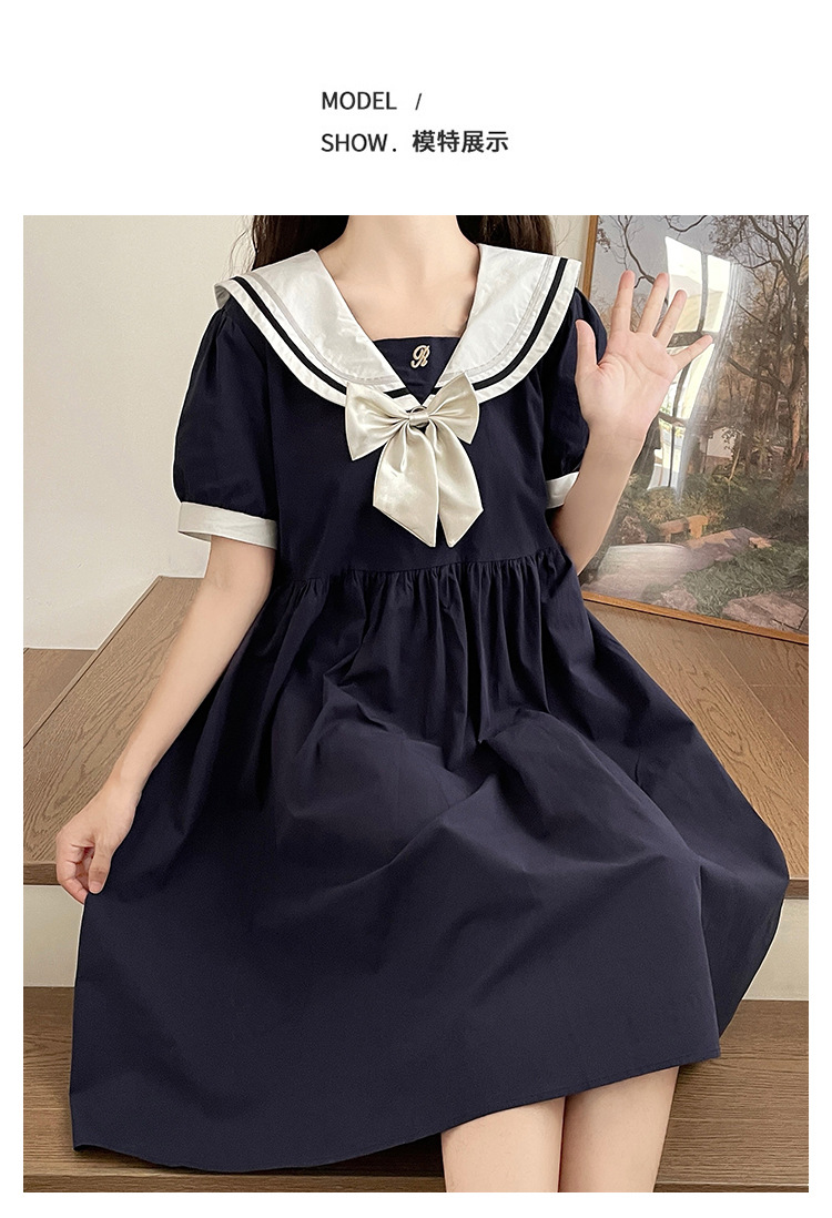 标题:ネイビーカラーの半袖ワンピース夏の新中高生ゆったりウエスト丸めた可愛いコットンのロングスカート
