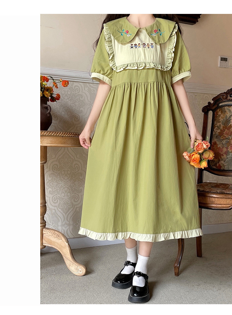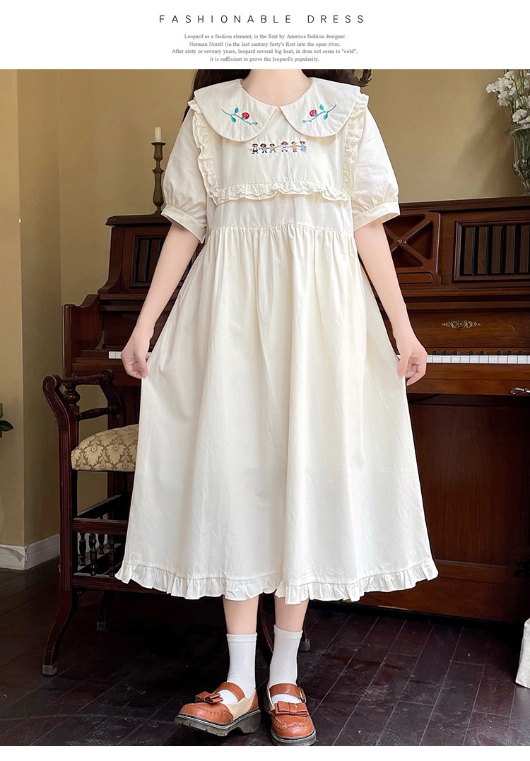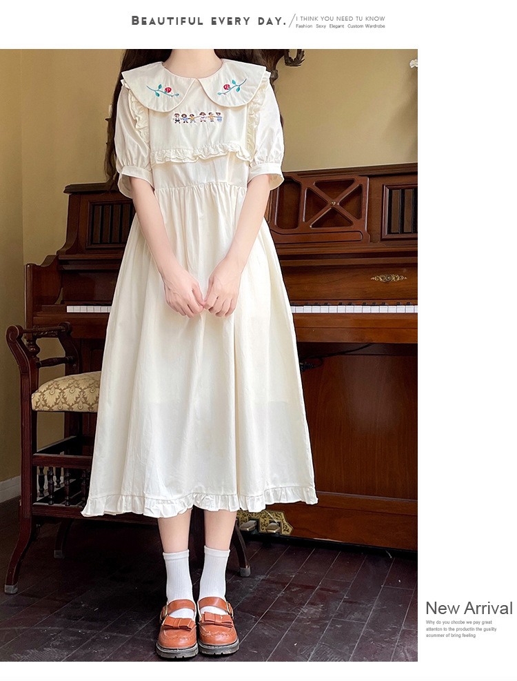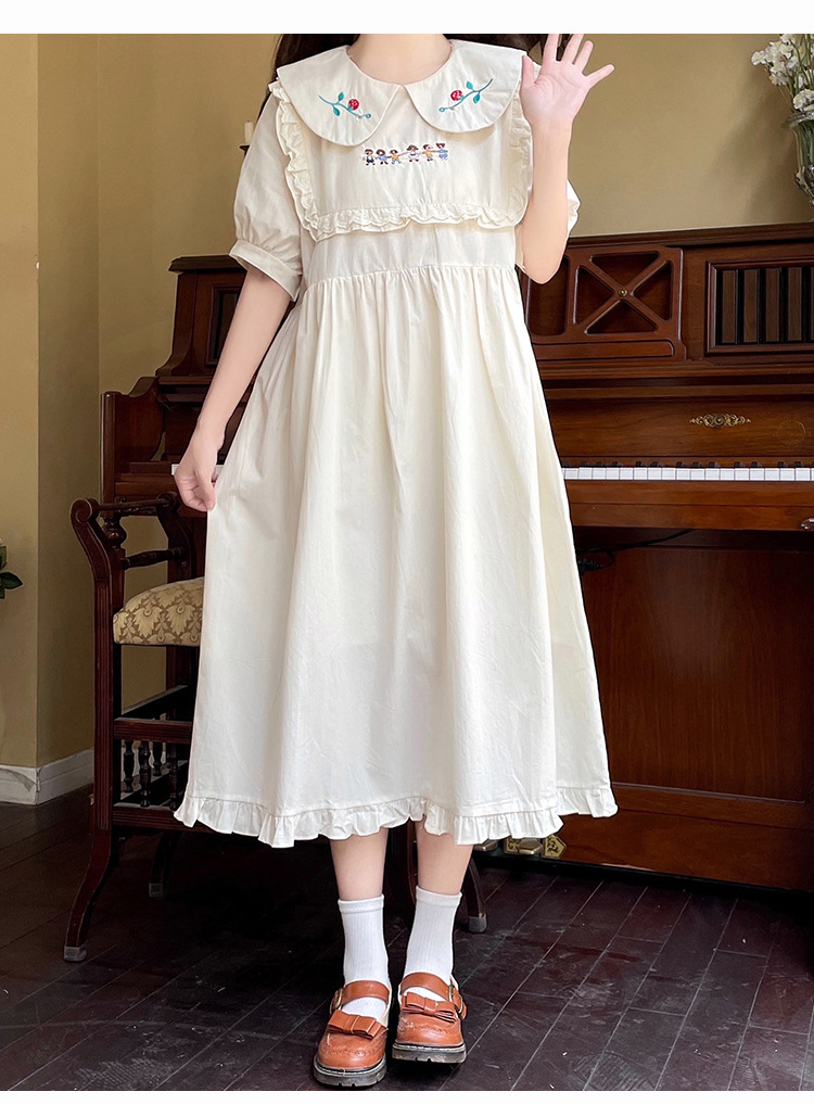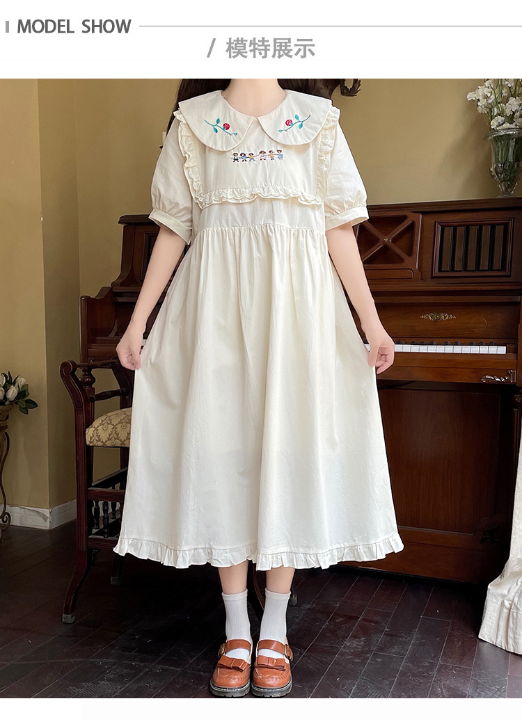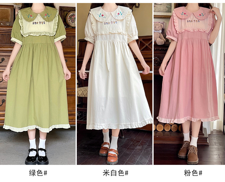 标题:ドールネック純綿半袖ワンピース2023夏新作中高生刺繍ゆったりウエストA字スカート