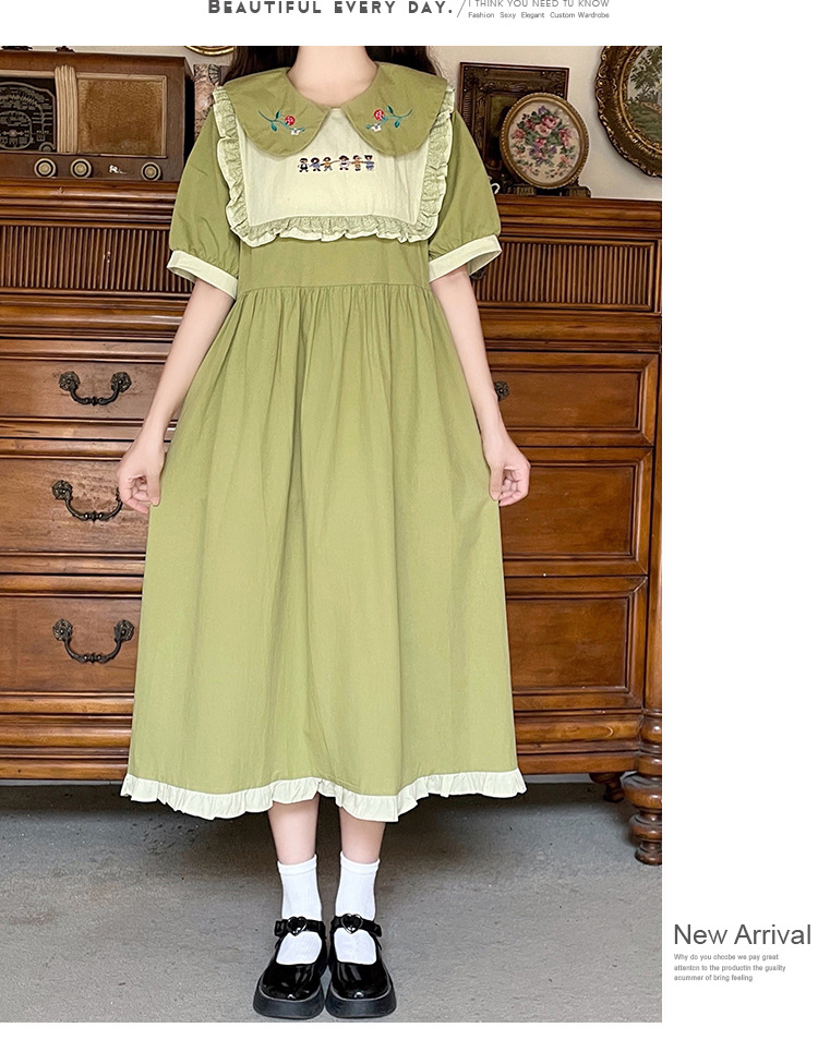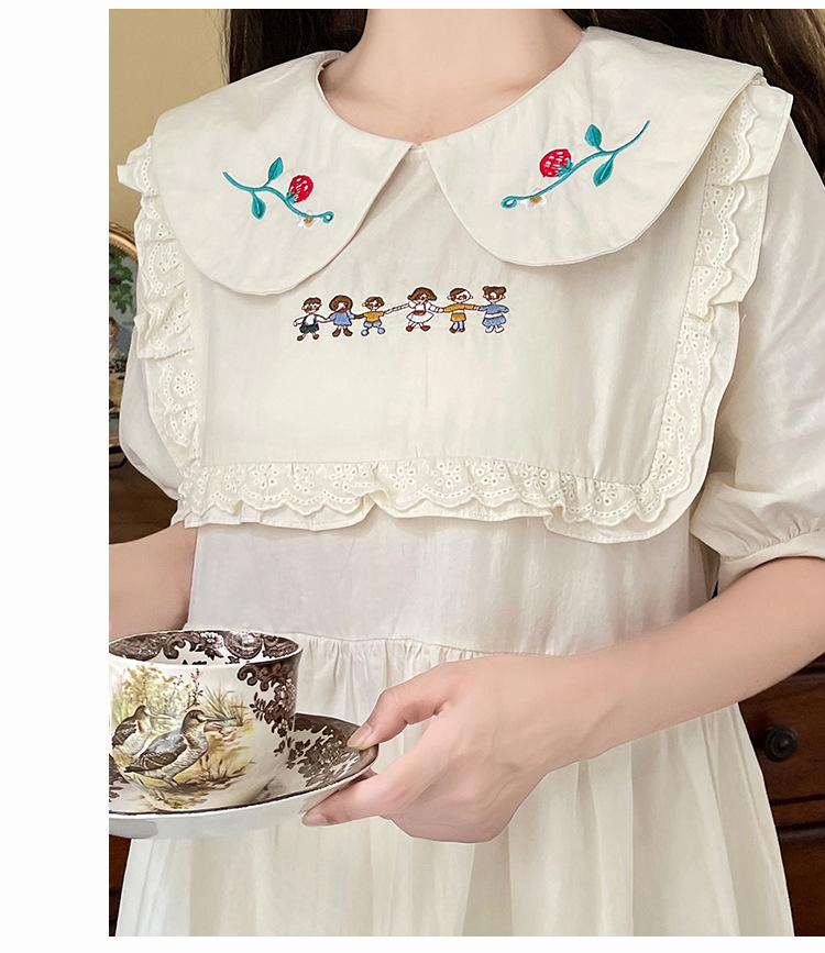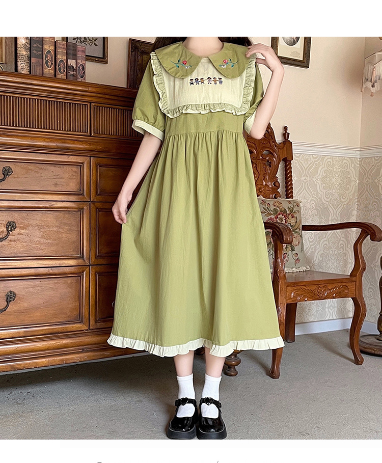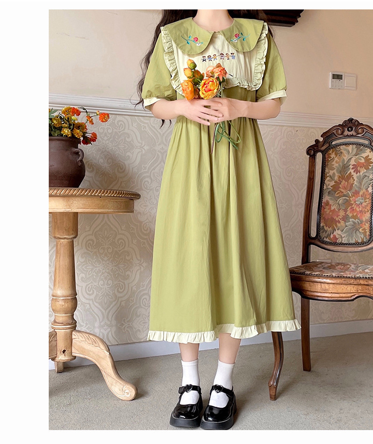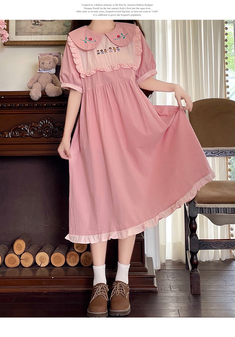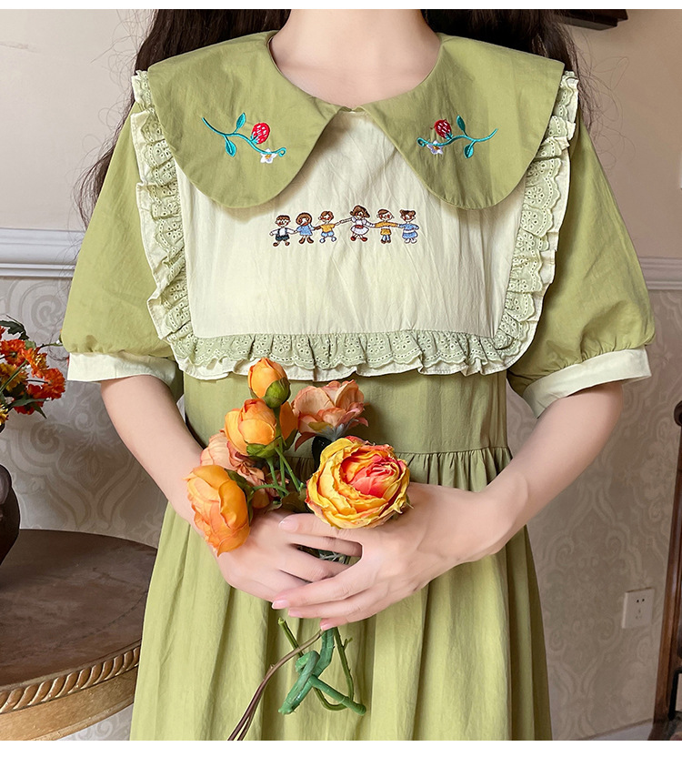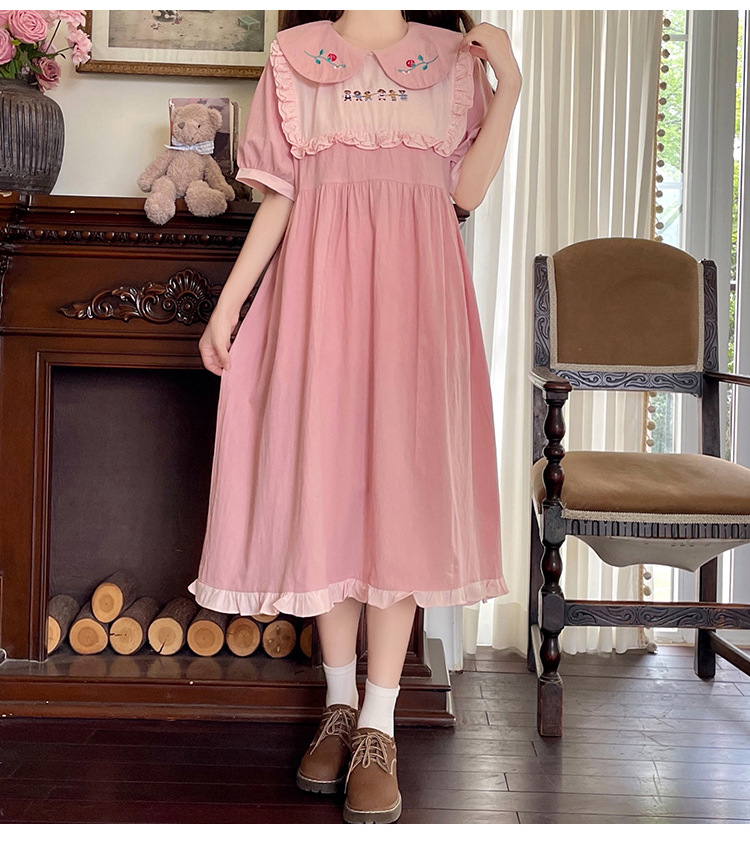 标题:ドールネック純綿半袖ワンピース2023夏新作中高生刺繍ゆったりウエストA字スカート