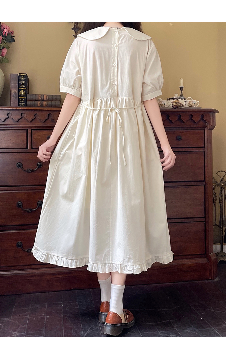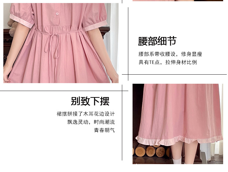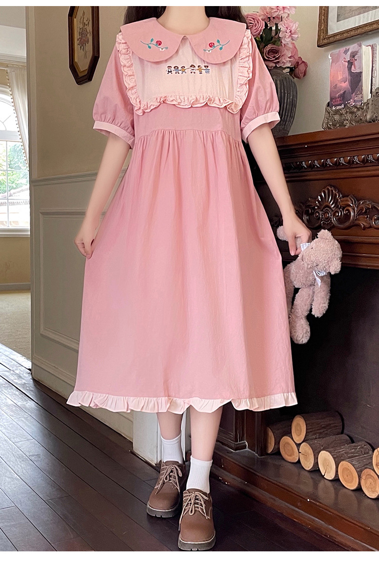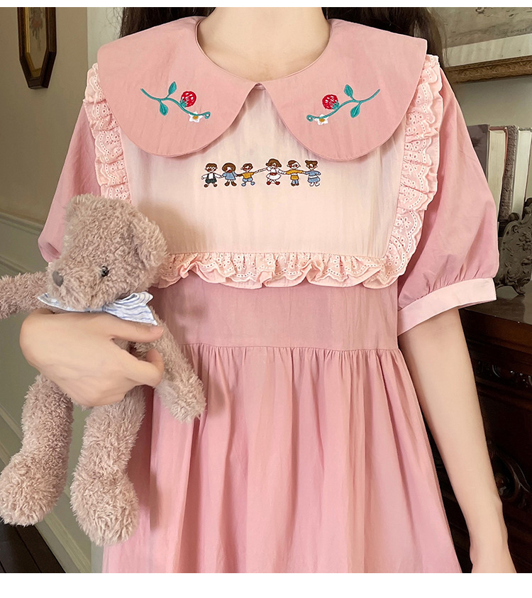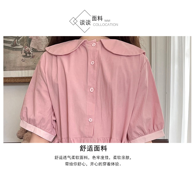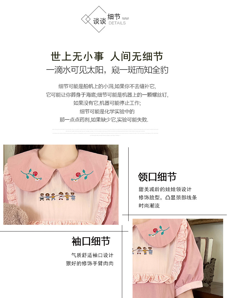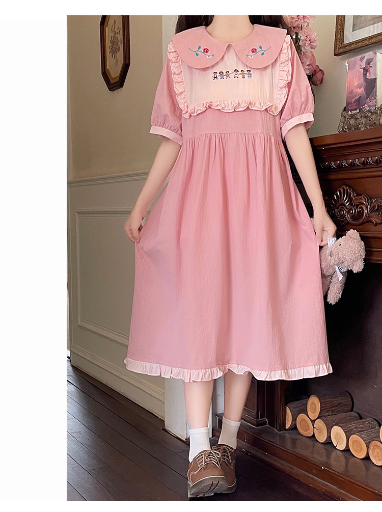 标题:ドールネック純綿半袖ワンピース2023夏新作中高生刺繍ゆったりウエストA字スカート