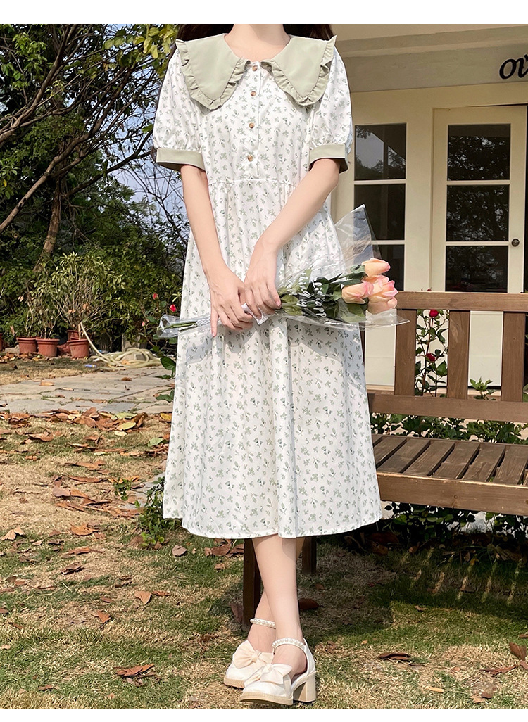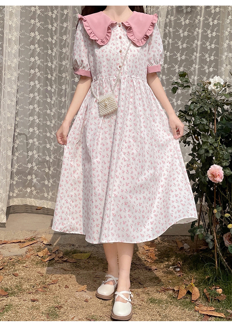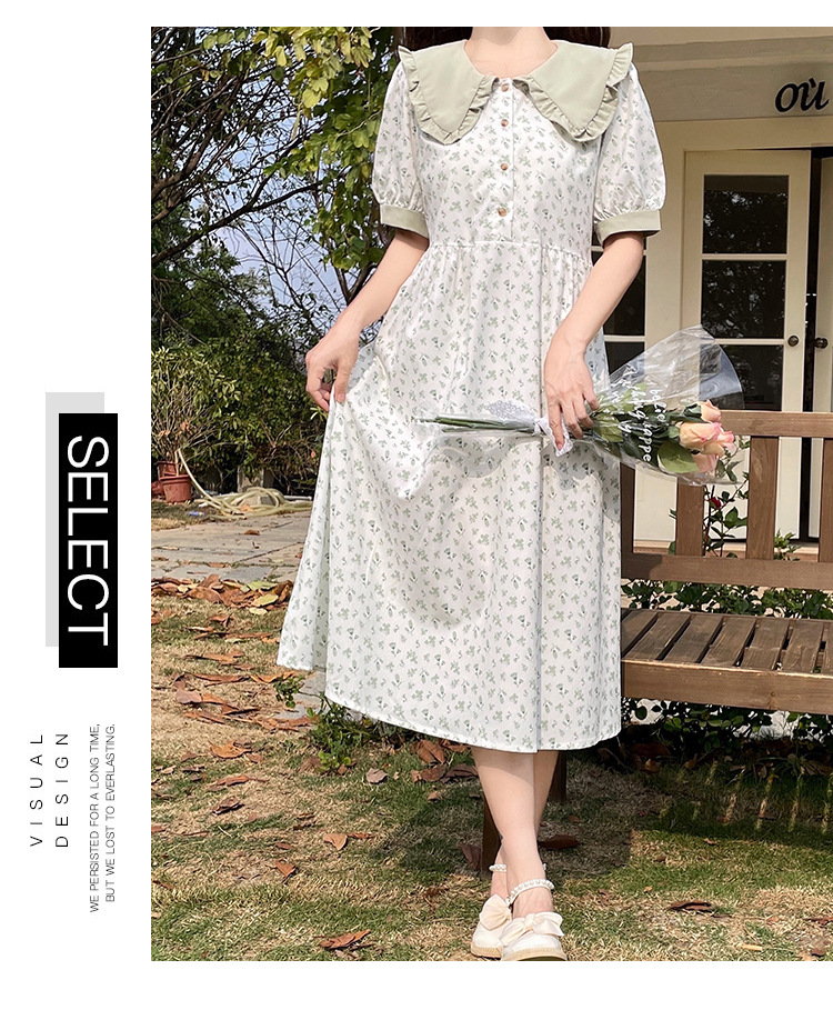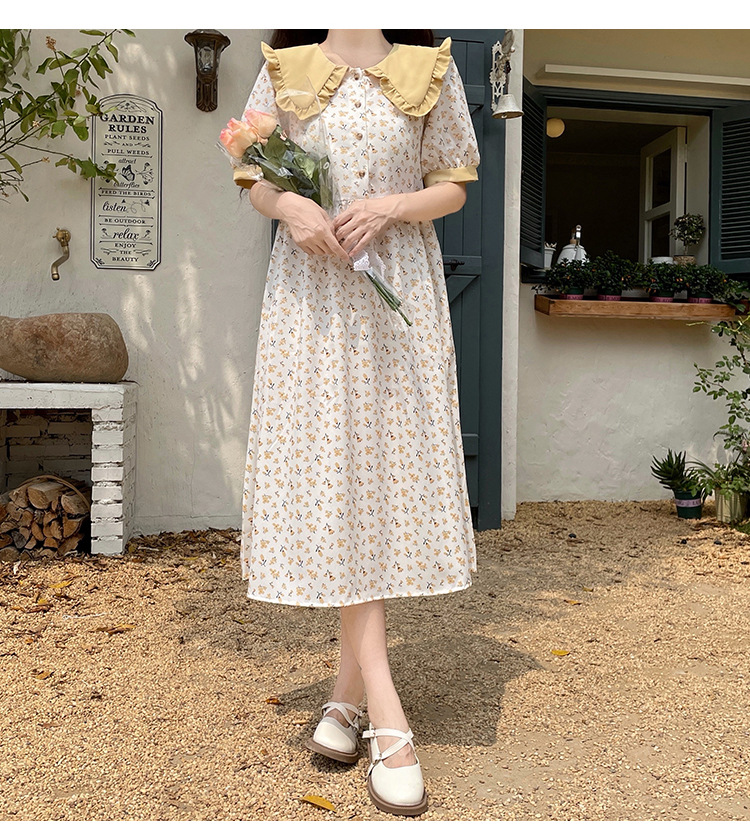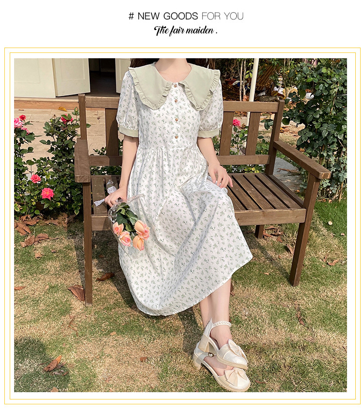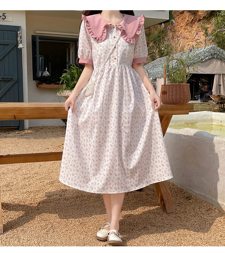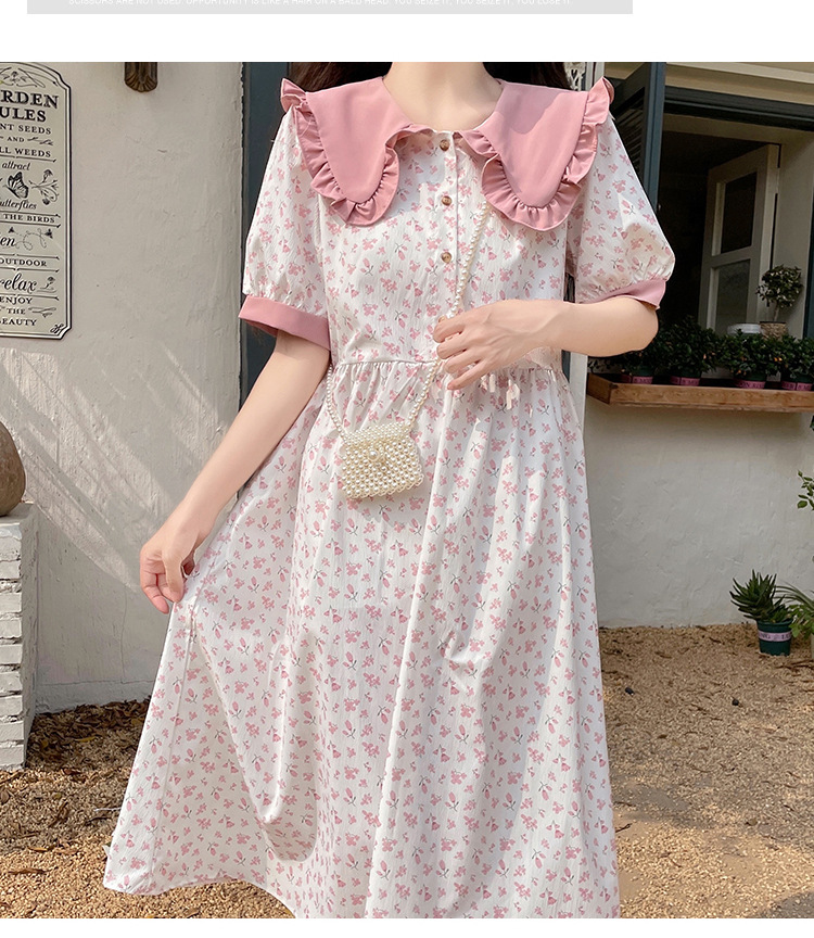 标题:シフォン半袖ワンピース女2023夏新作甘い学生ゆったりウエスト丸襟少女スカート