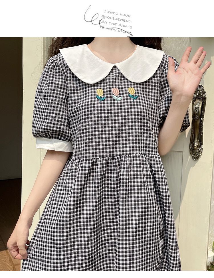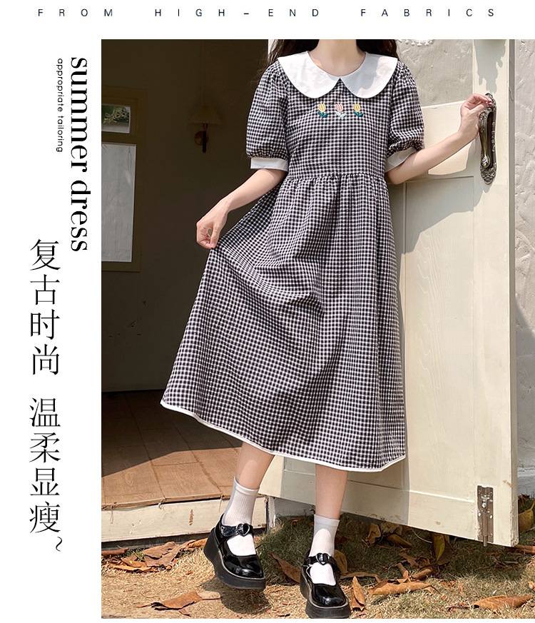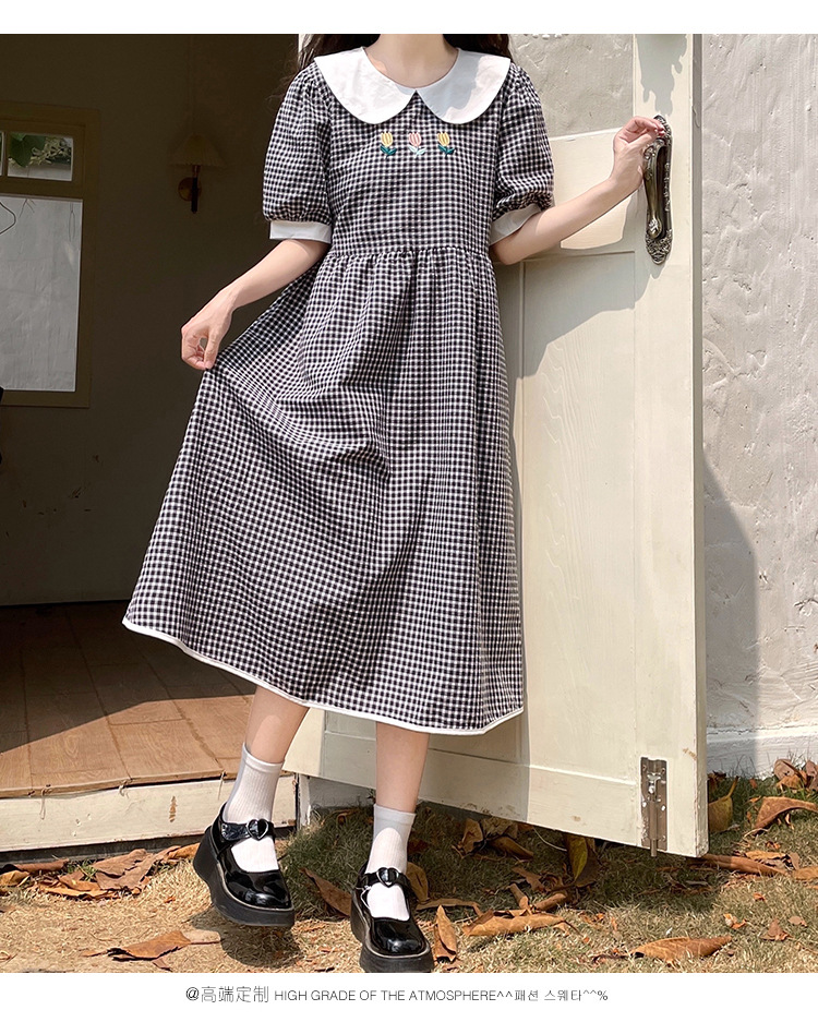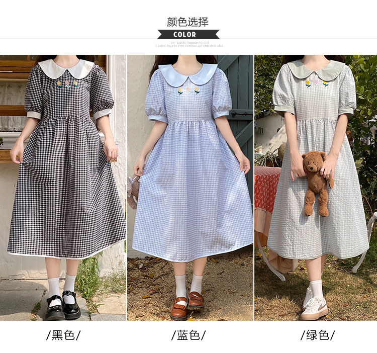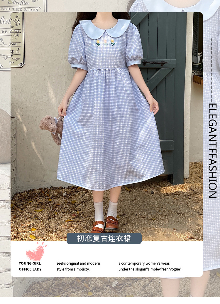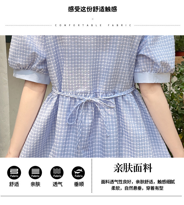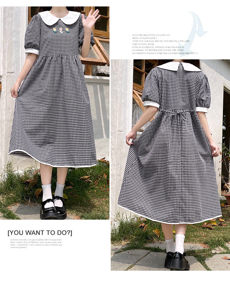 标题:チェックの半袖ワンピース2023夏の新中高生ドールネックゆったりウエストの小柄スカート