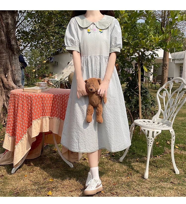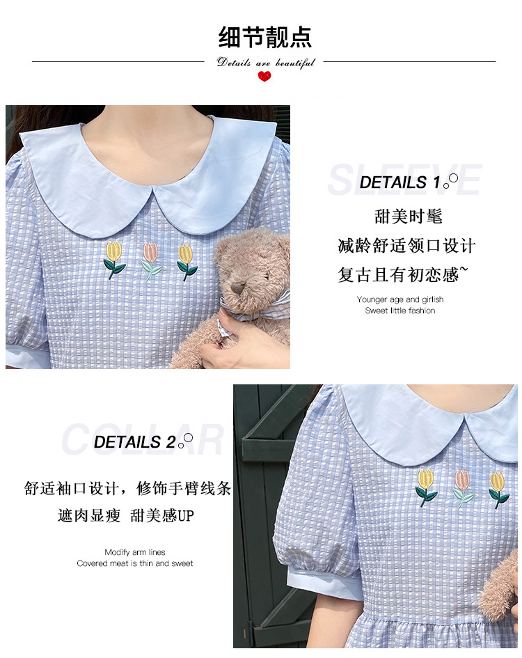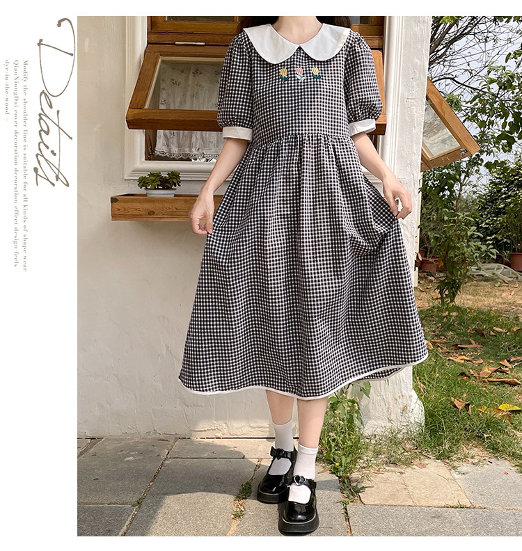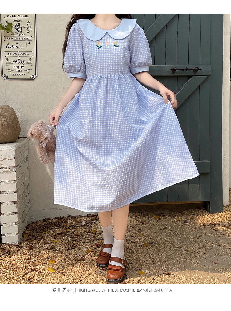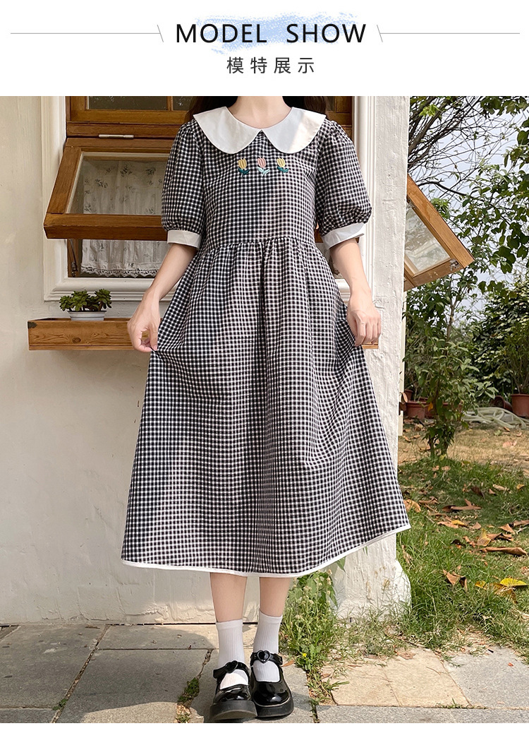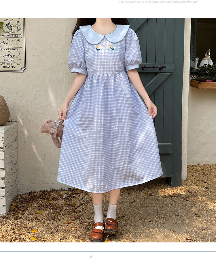 标题:チェックの半袖ワンピース2023夏の新中高生ドールネックゆったりウエストの小柄スカート