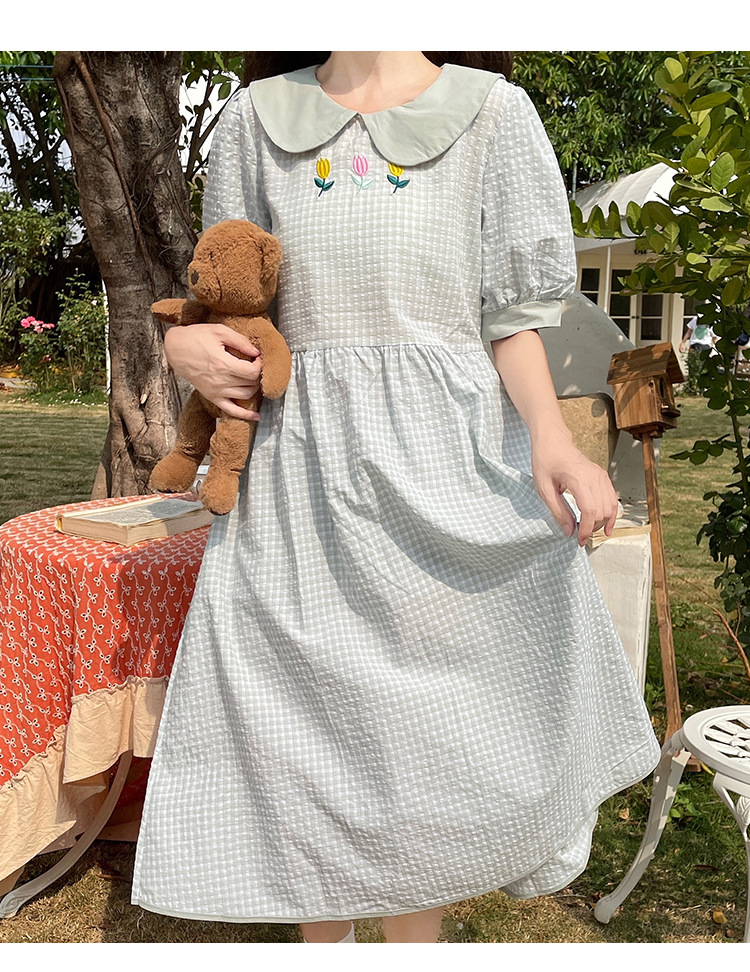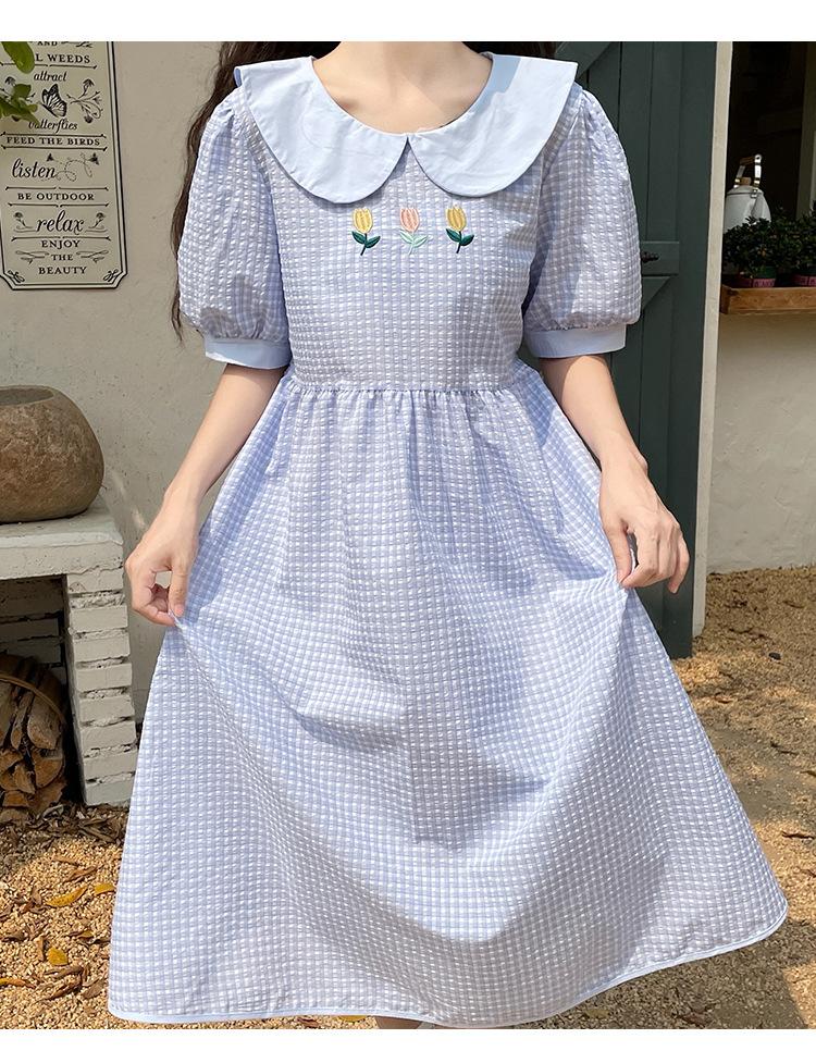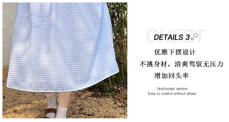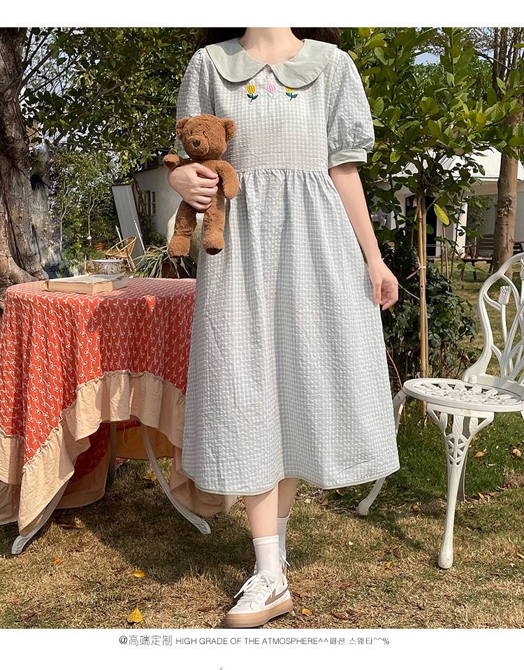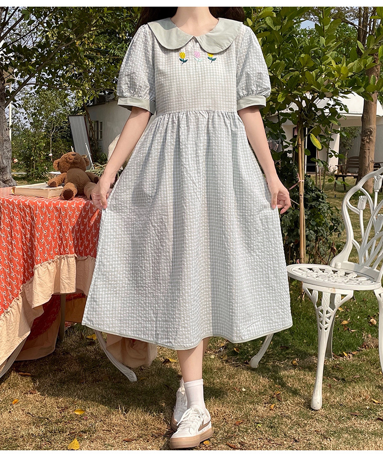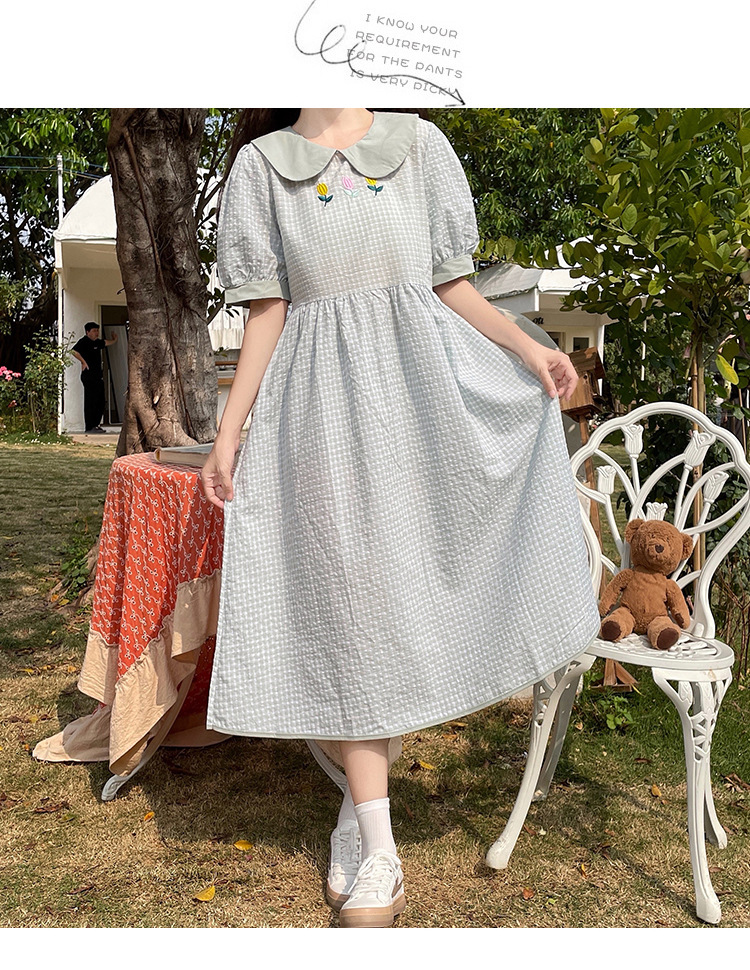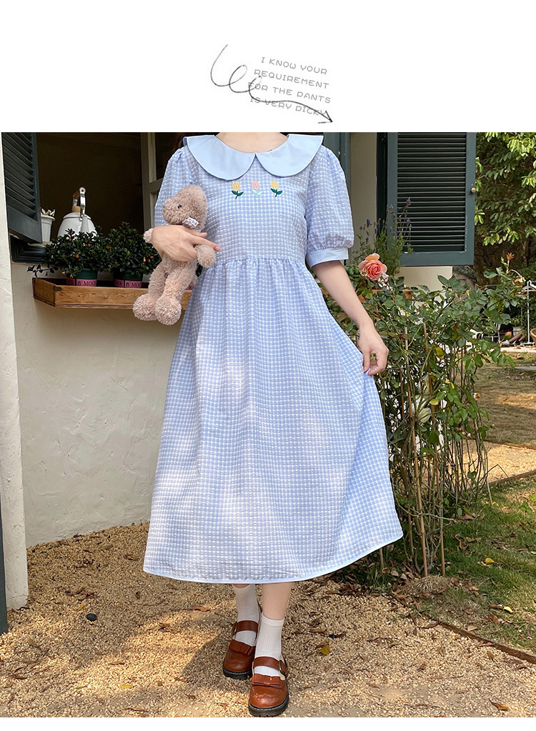 标题:チェックの半袖ワンピース2023夏の新中高生ドールネックゆったりウエストの小柄スカート